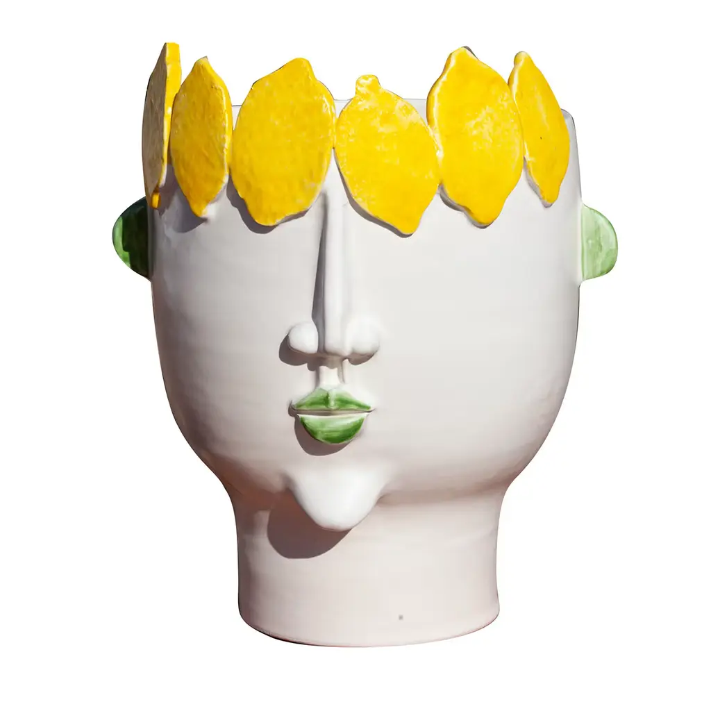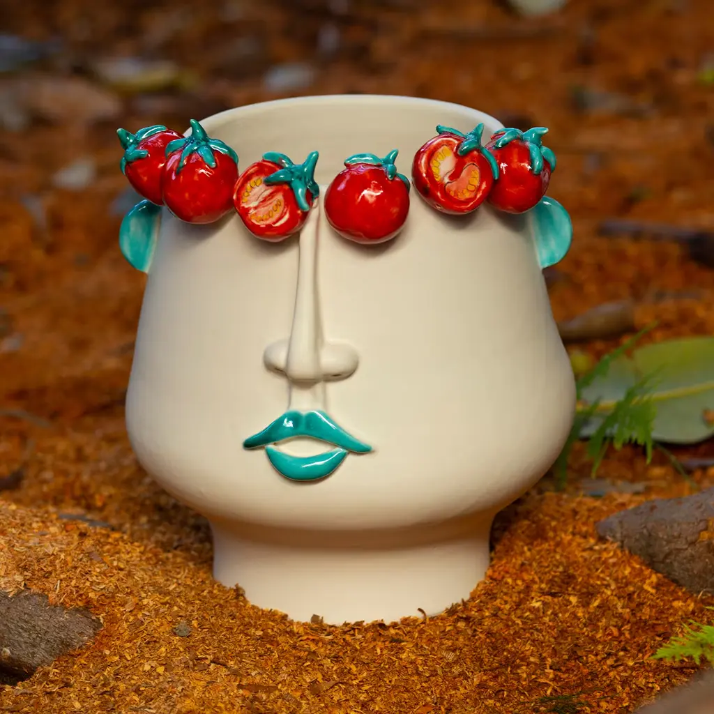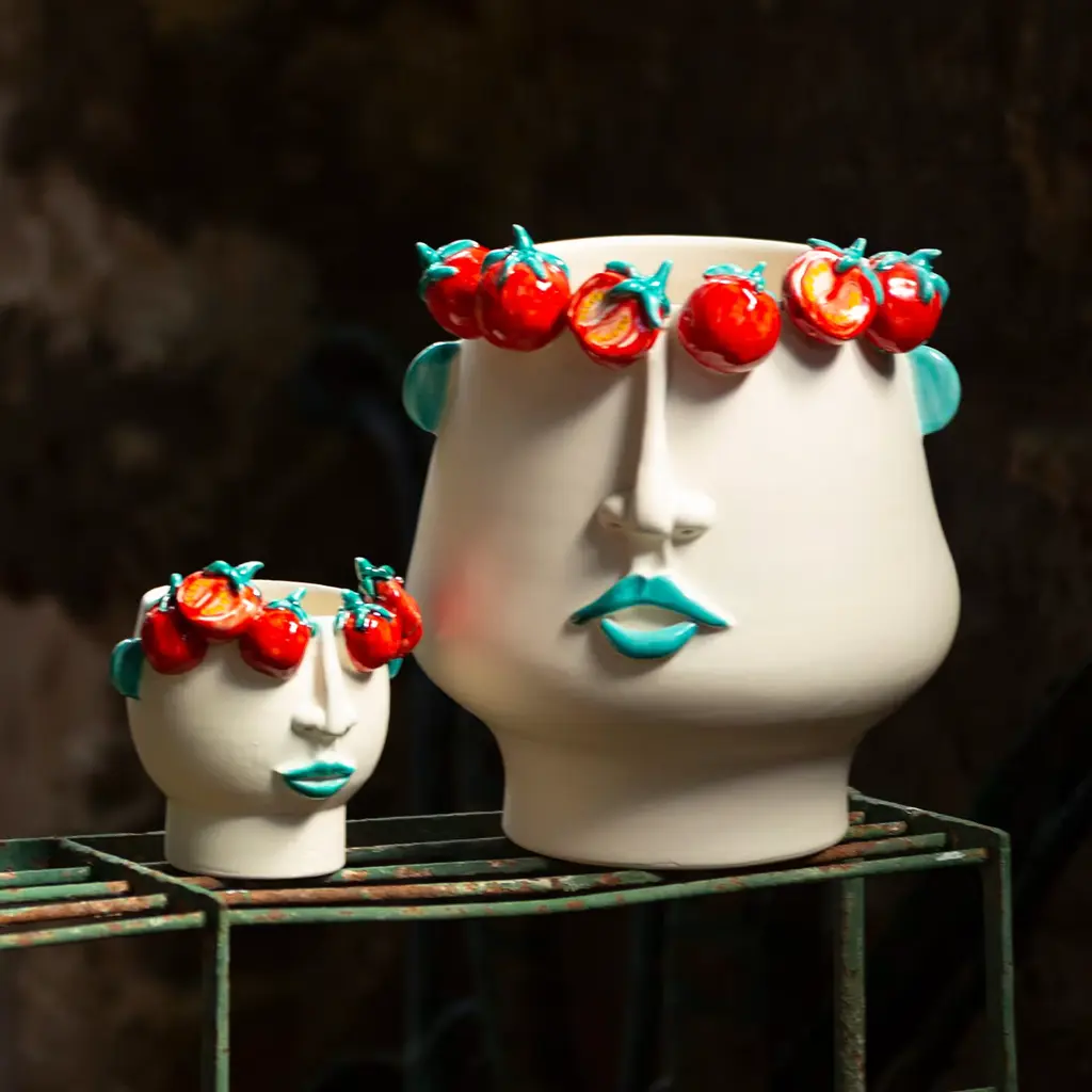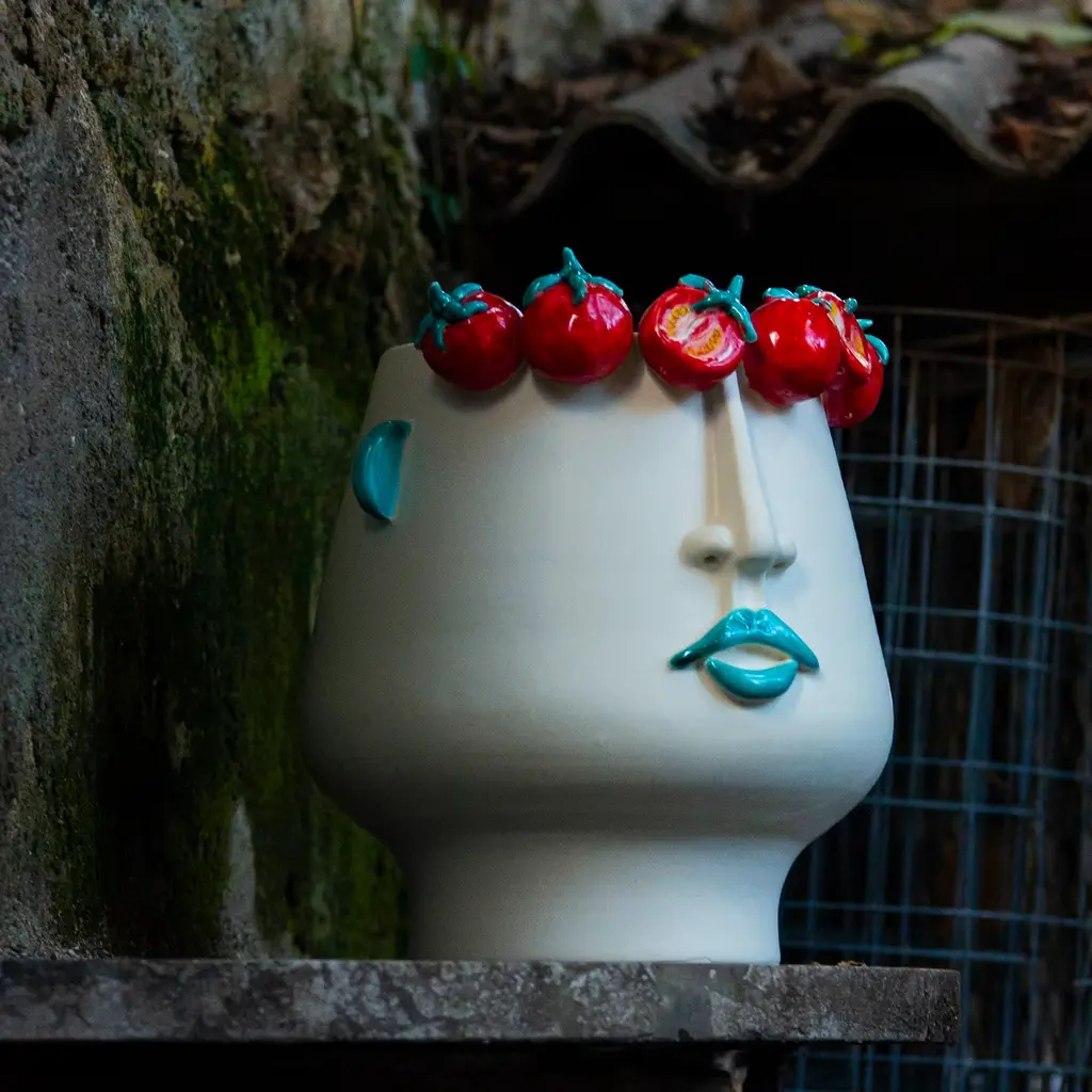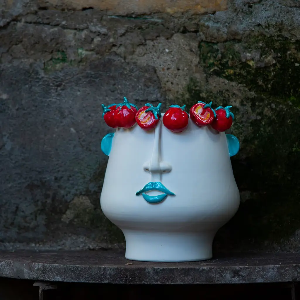 She is Russidda, the seller of tomatoes, lives in the countryside with her Bertu. Head in white clay matt cream enamel and glossy colored crystalline.