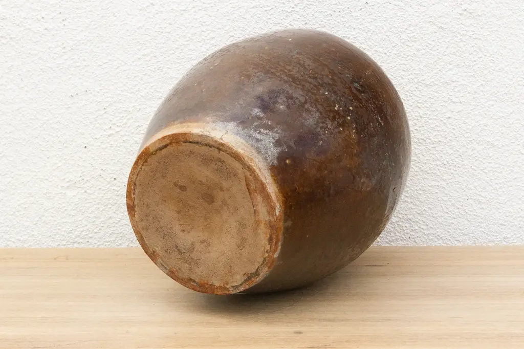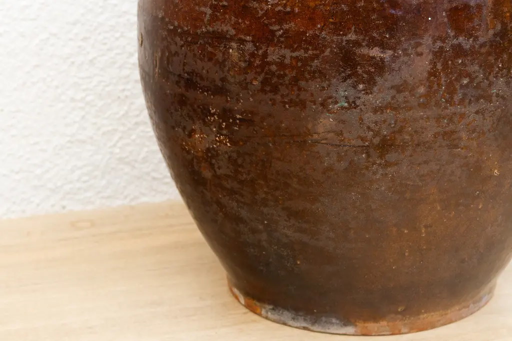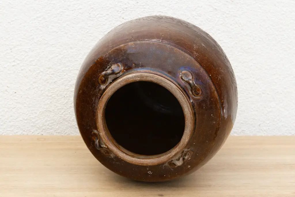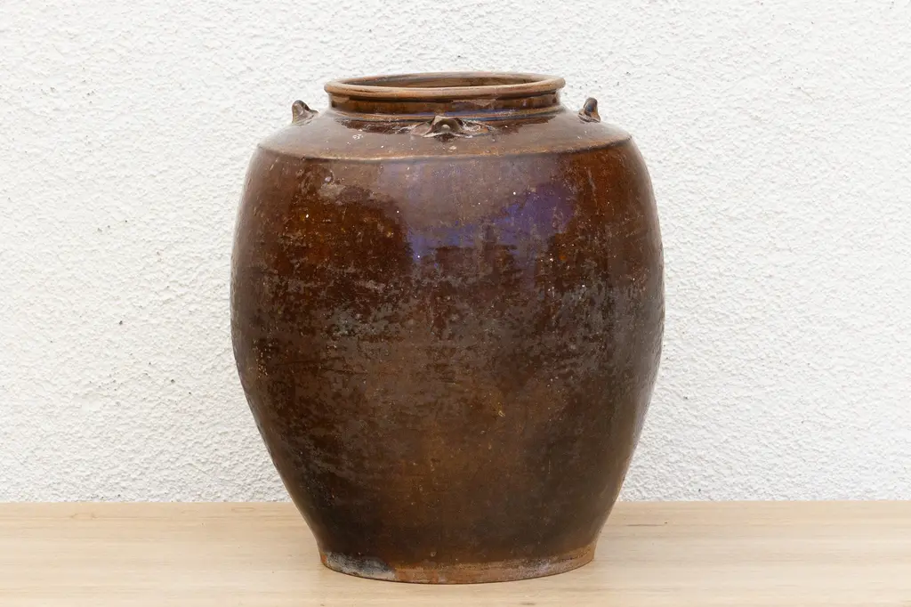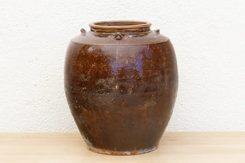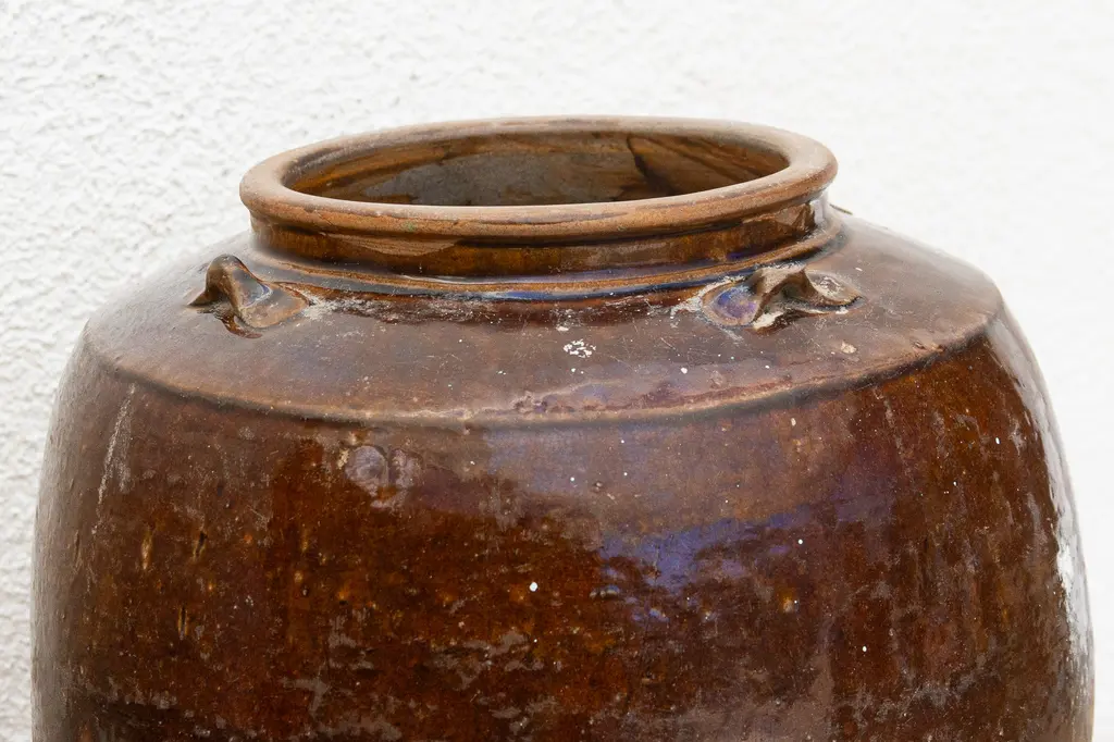 Bring a touch of ancient history and rustic charm to your home with this authentic antique Burmese Martaban jar. Revered for centuries throughout Southeast Asia for its robust construction and practical use in storing water, grains, and precious goods, this jar now stands as a striking decorative object, bearing the unique marks of time and tradition. This jar features a rich, original brown glaze that varies in tone and texture, a testament to the firing process and the passage of years.