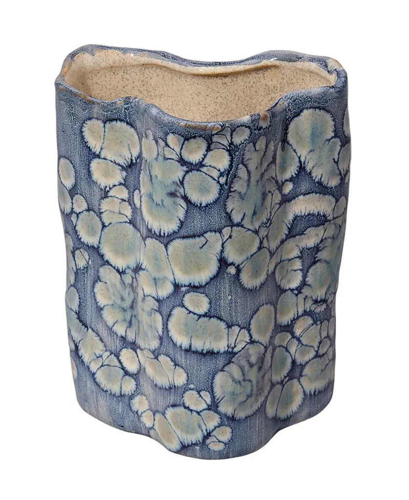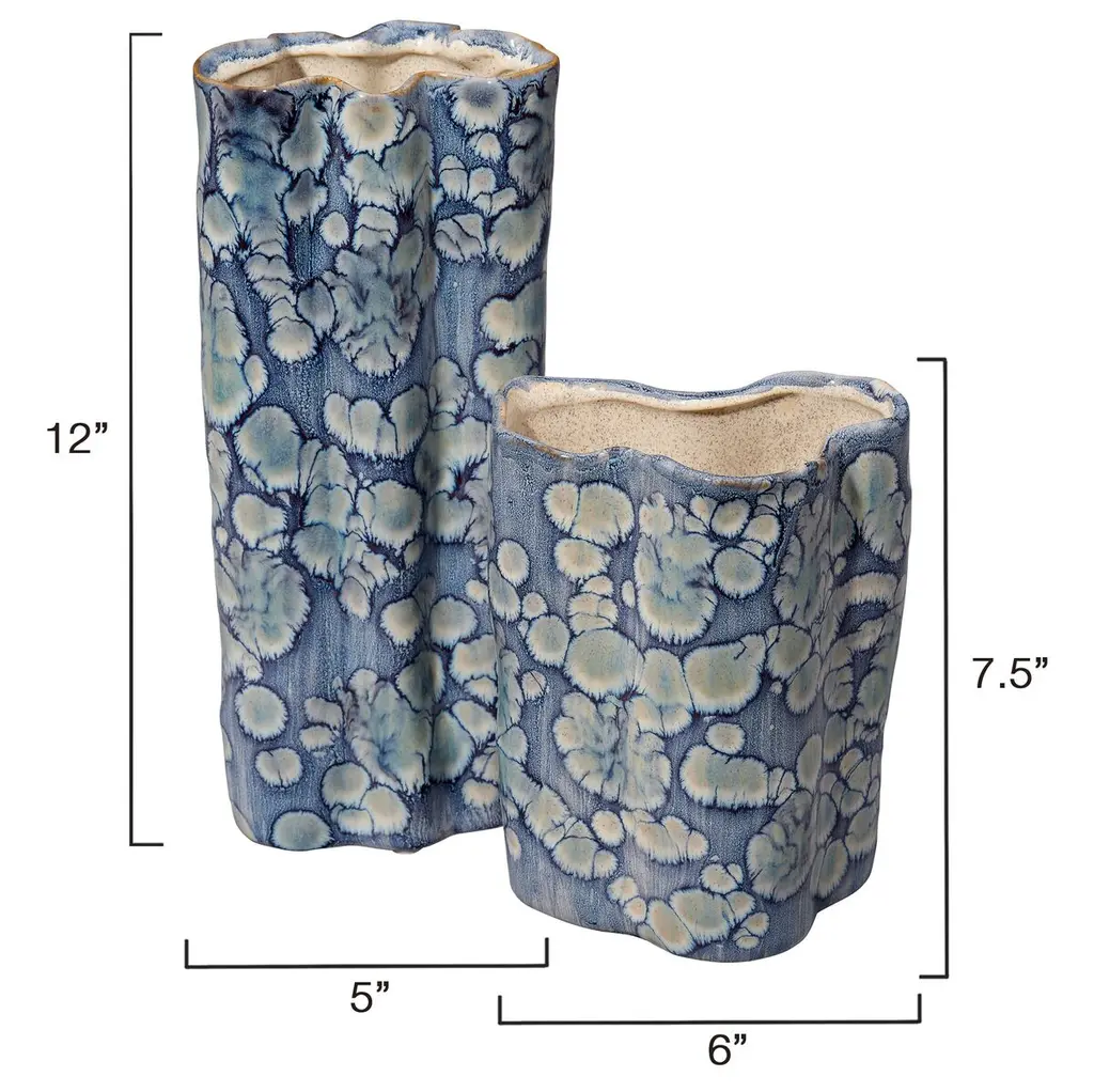 This serene set of ceramic vases is distinguished by its unstructured shapes and a relaxed take on traditional themes. The patterns on the exterior are created using reactive glazes, while the interiors remain raw and unadorned. Artisan crafted and finished, each piece features unique patterns, ensuring that no two are identical. Perfect for florals, they can be filled with your favorite fresh or preserved elements!
