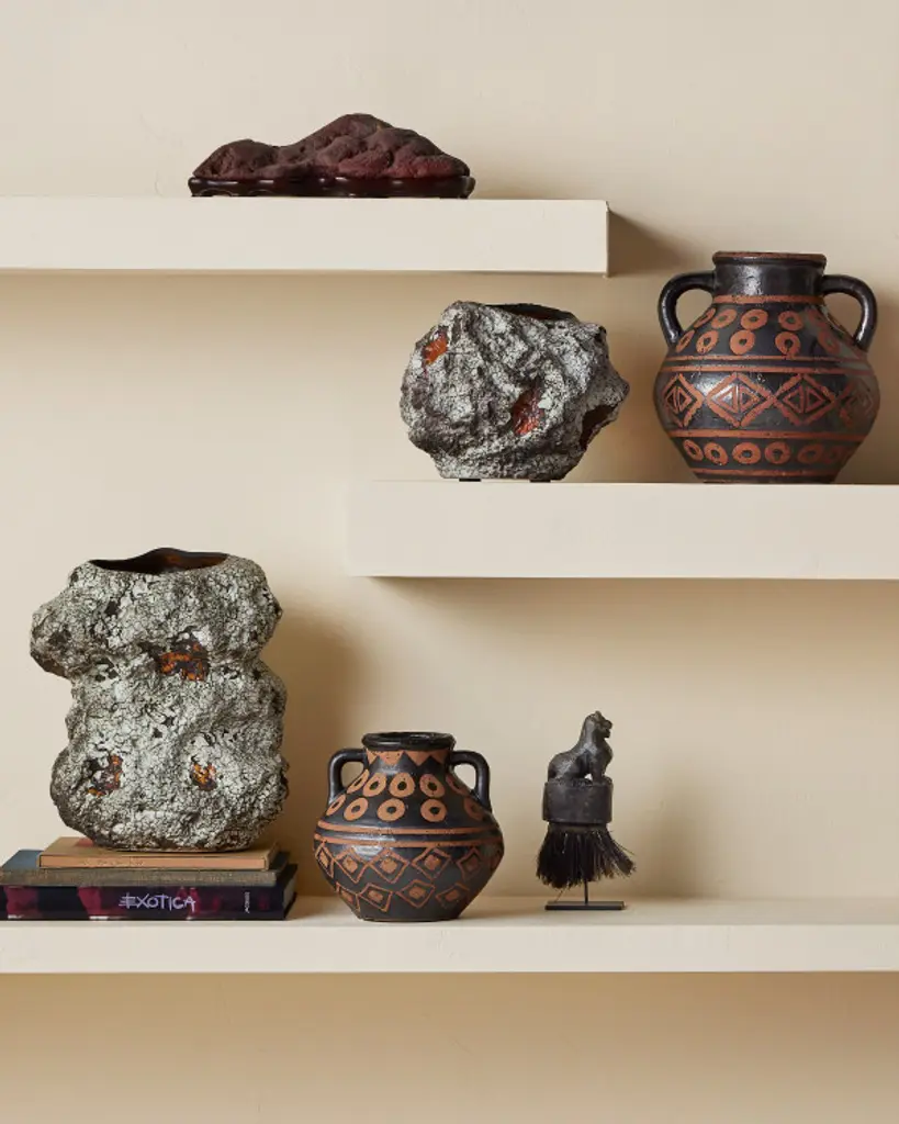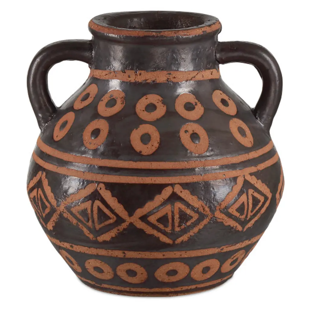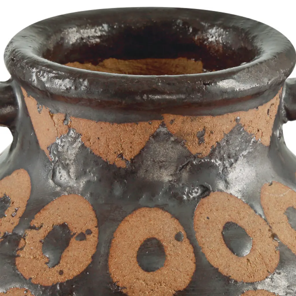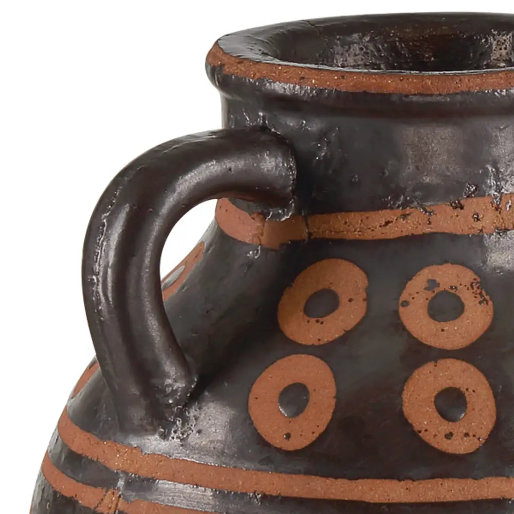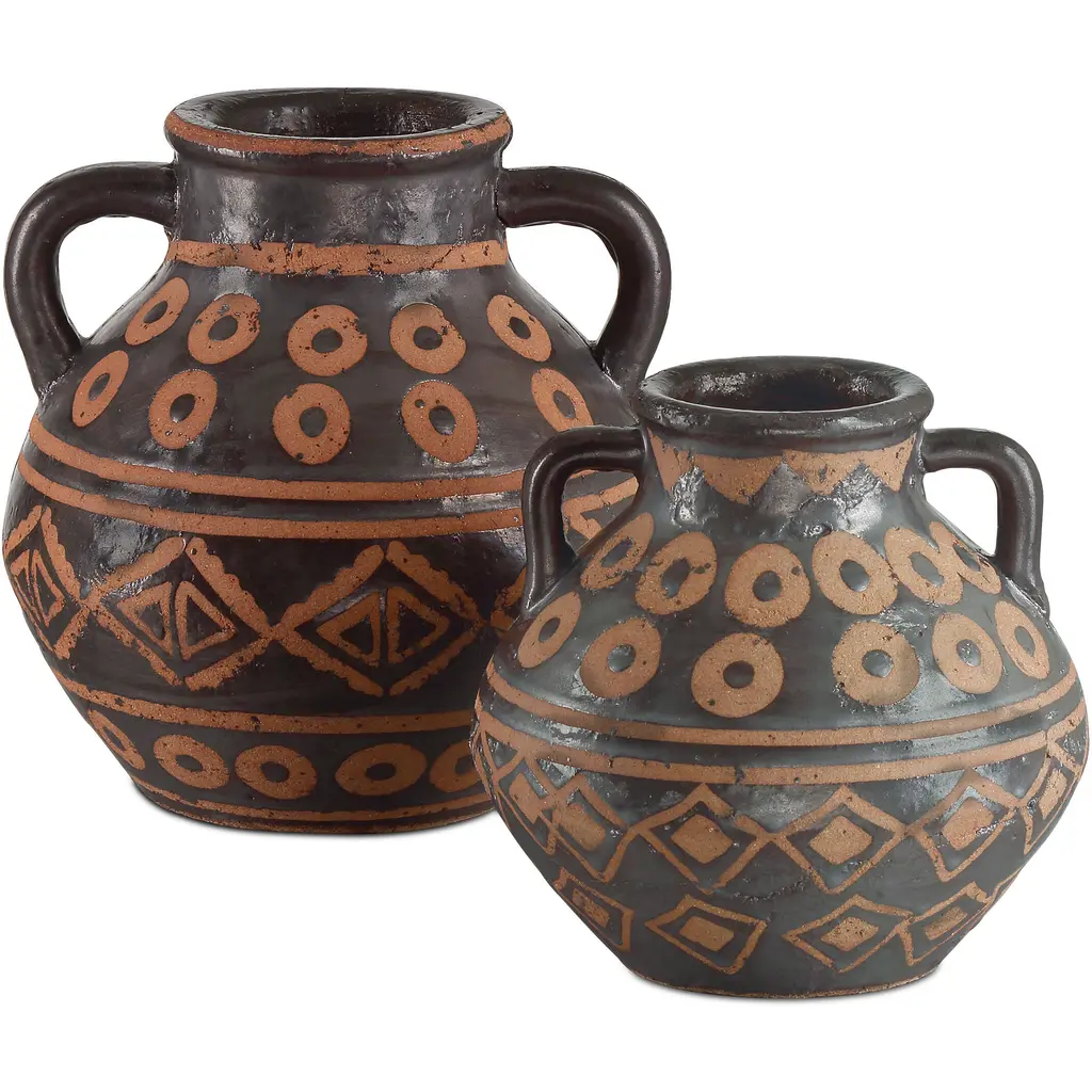 Created with time-honored techniques that have been thriving in cultures around the world for centuries, the Nought Vase Set includes two vessels made of terracotta. The lost wax process used to create them ensures the jugs exhibit an artisanal attribute: where the vases are terracotta-colored, the wax prevented their surfaces from taking the black glazing. This is a painterly technique that results in appealing surfaces that have been perfected over ages.