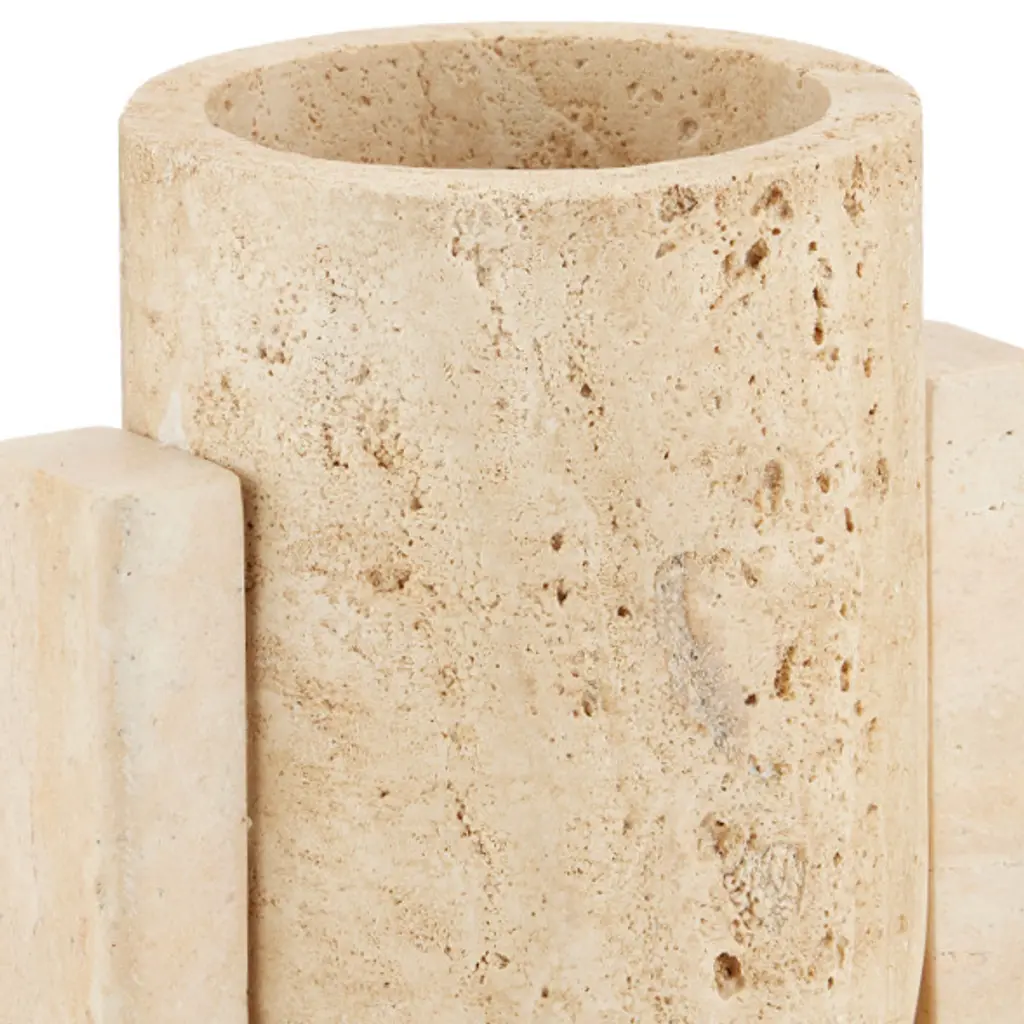 The Stone Vase, Face to Face Set includes two modern iterations of brutalist sculptures made of hand-carved travertine. The geometric vessels are solid on the bottom and hollowed out on top to create a vase-like opening. They are not meant for floral arrangements, as they are not watertight. Note that the texture will vary from piece to piece.