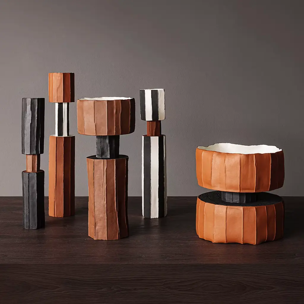 Every one of Paola Paronetto’s creations is unique. From her exclusive clay mix, to the opaque and natural colour finish, each piece is completely handmade. Slight variations in shape, colour and size are to be considered a guarantee of authenticity and value. They are finished with non-toxic satin-finish enamels. Although very rarely, it is possible for them to leak after long periods of exposure to water. It is therefore advisable to test their water resistance before using them on delicate surfaces. They should not be used as dining utensils. The white pieces can be washed with water or sanitizing products, whereas the coloured pieces must be treated more gently and cleaned with a feather duster or a soft cloth, dry or moistened very slightly with water.