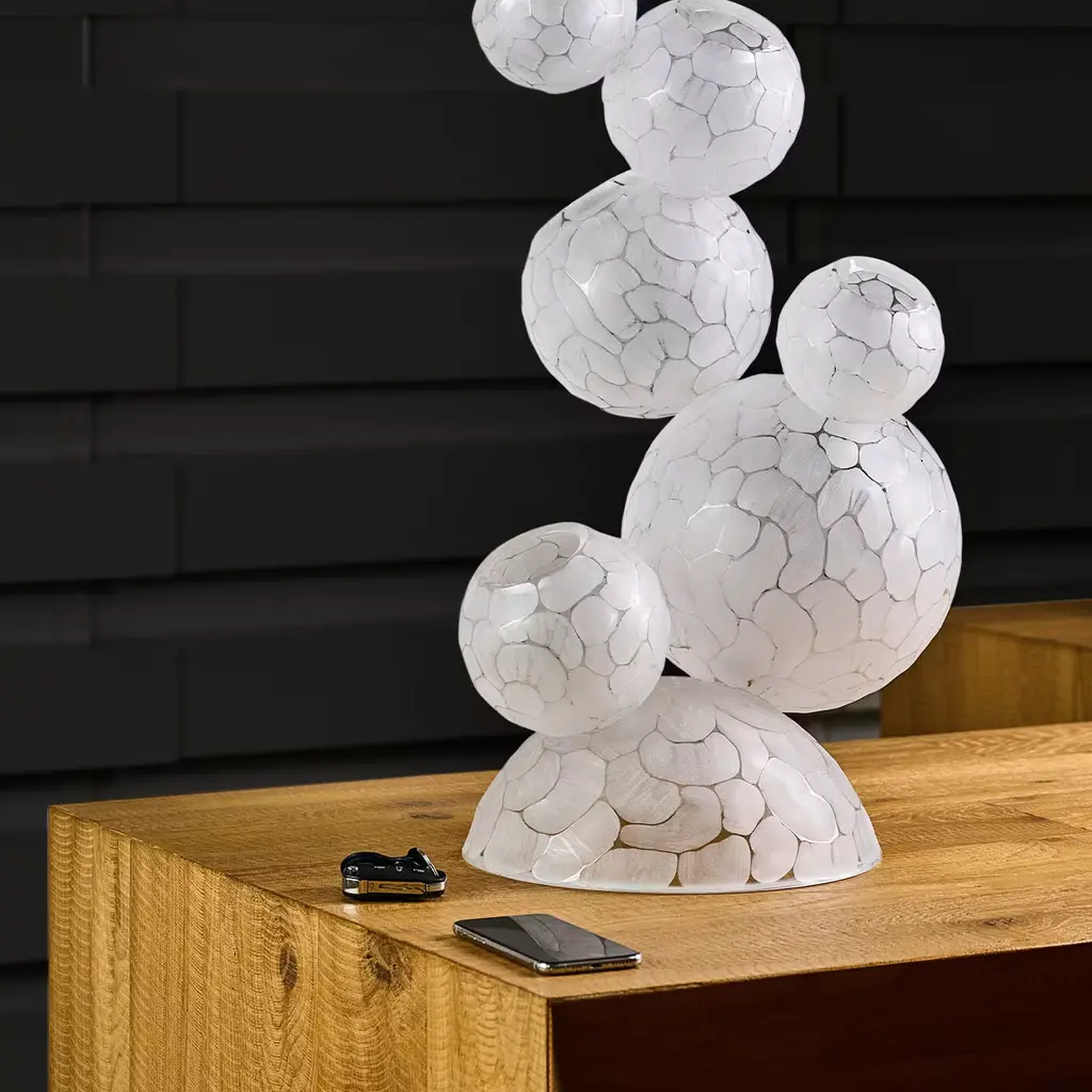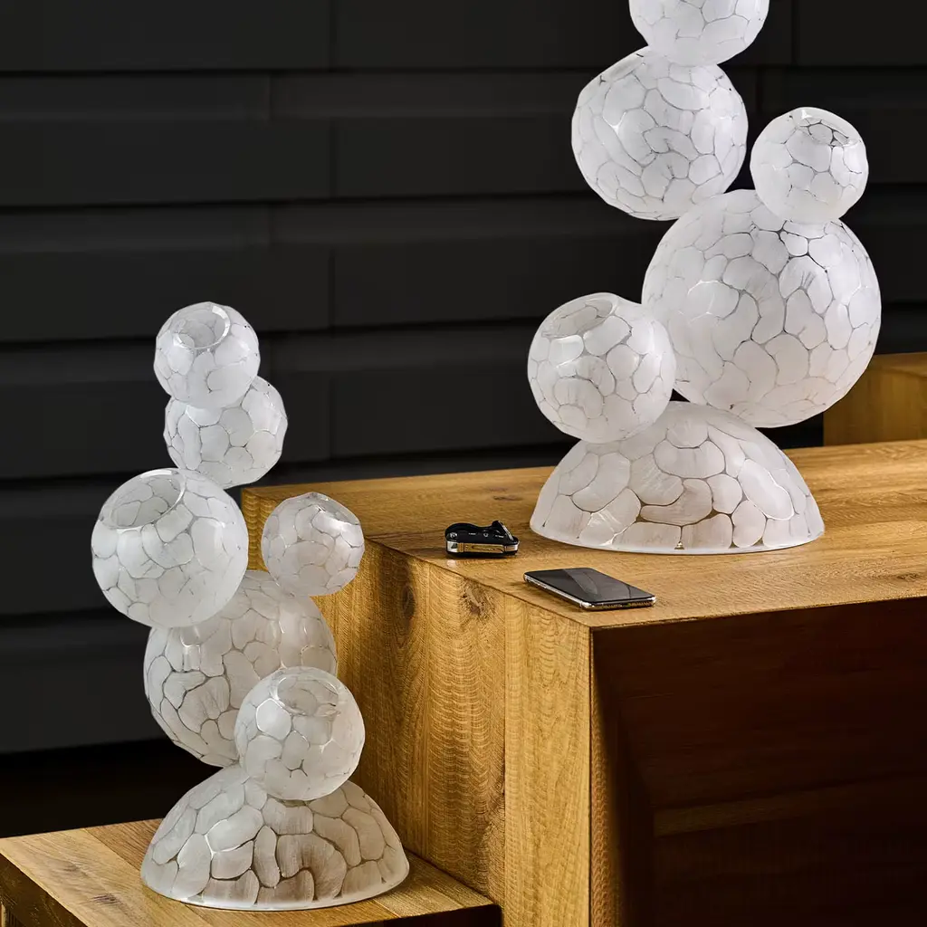 The mutation of form is inspired by historical primordial memories that have consolidated the Native leadership. The marmoreal lightness of the engraving remains fluid in the transparency created, the light goes through the shape and gives life to the object. A single emotion is perceptible by the eye and the touch.