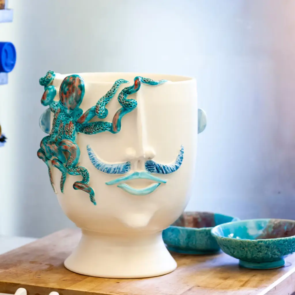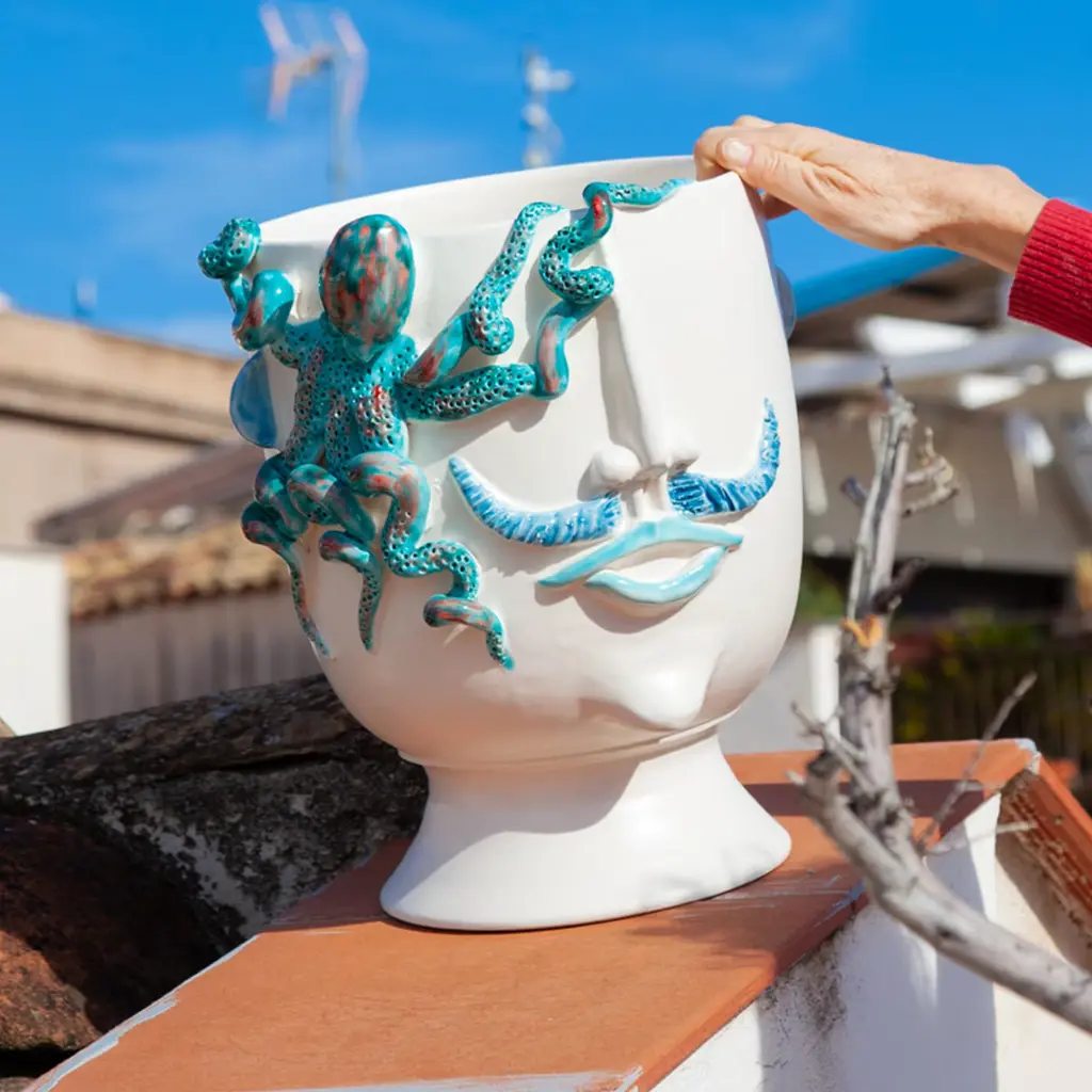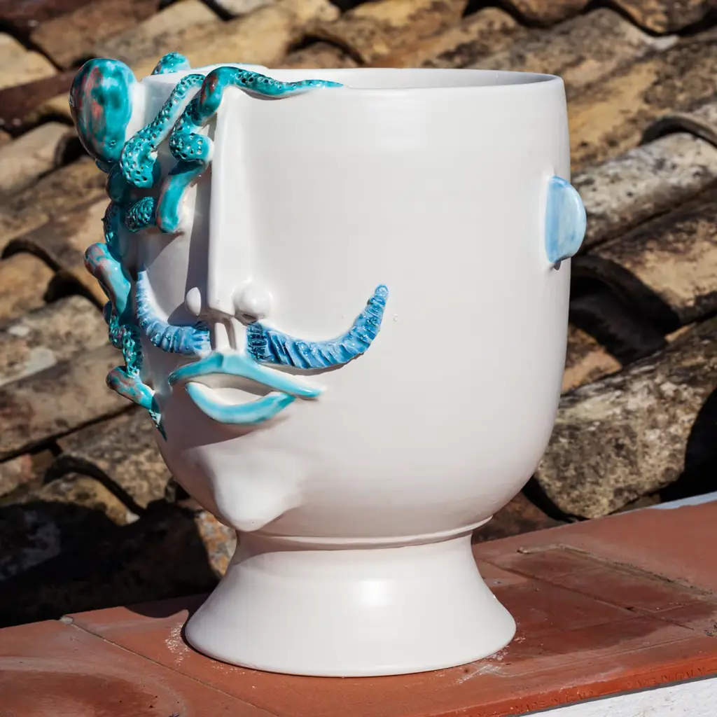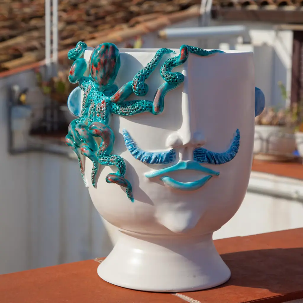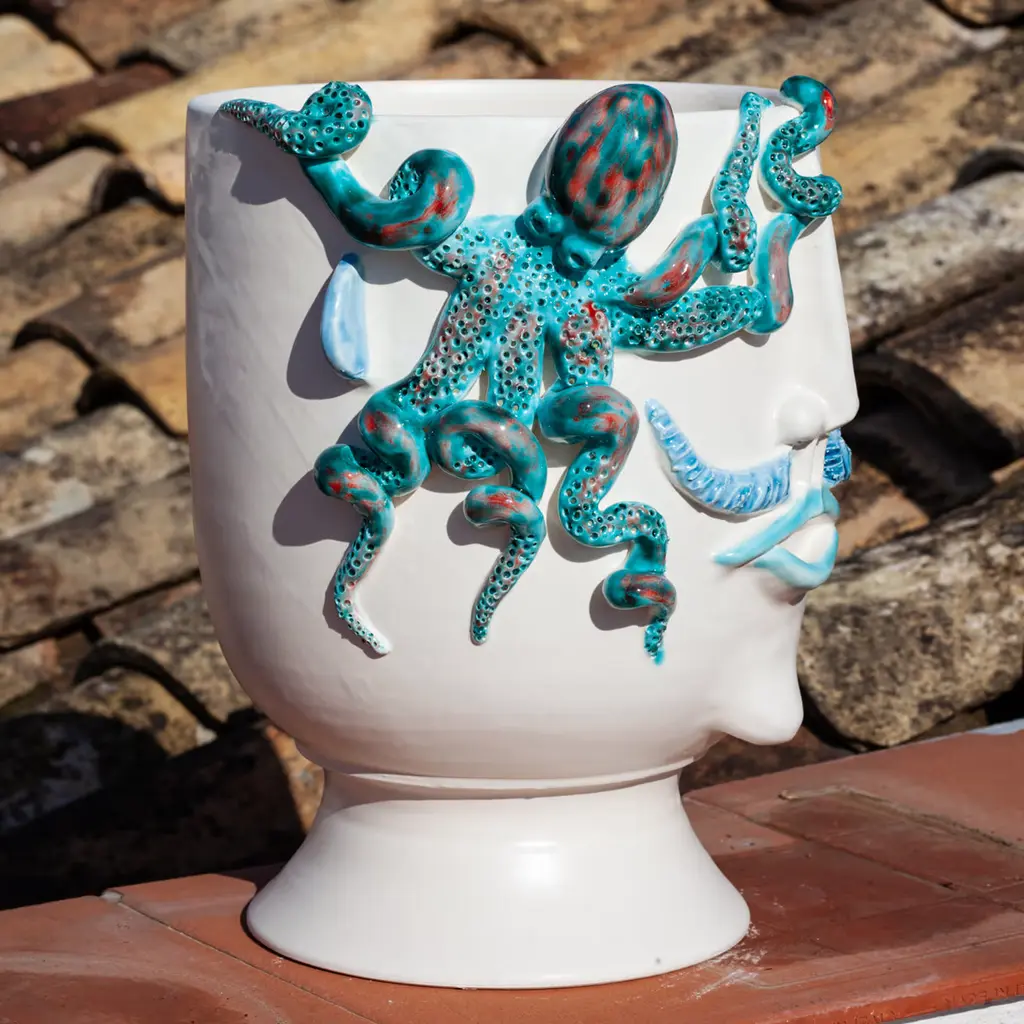 An ideal piece to accent coastal decors, this sophisticated design in fine matte white ceramic is simultaneously a vessel and a simply decorative anthropomorphic head. It showcases a male face - inspired by Salvo, a street vendor of octopus ("u pulparu" in Sicilian dialect) - with a 3D octopus adorning its side up to the rim. Finished with crystalline, enamels in shades of azure, turquoise, and red are used to accent the mustache, the lips, and the minutely-detailed octopus.