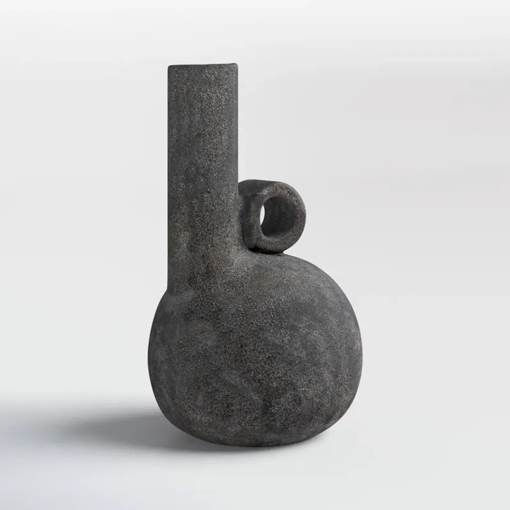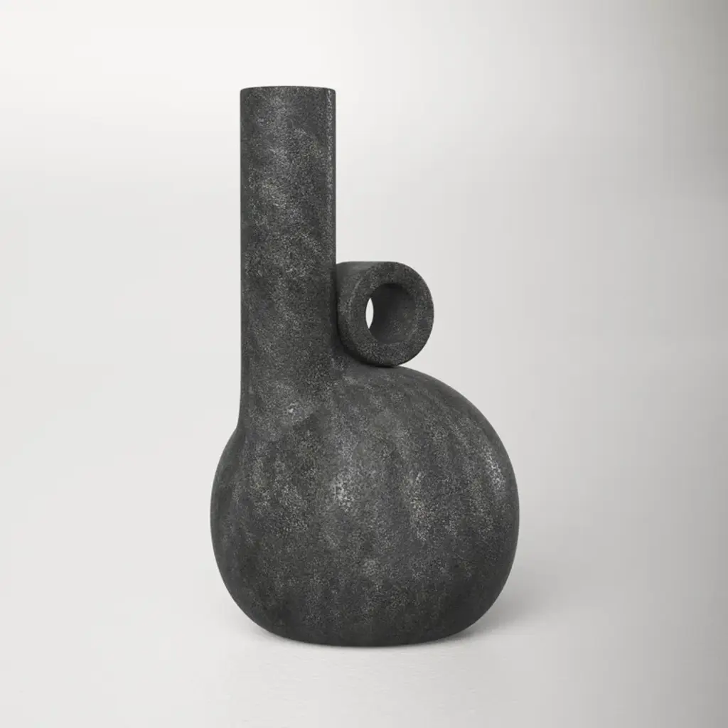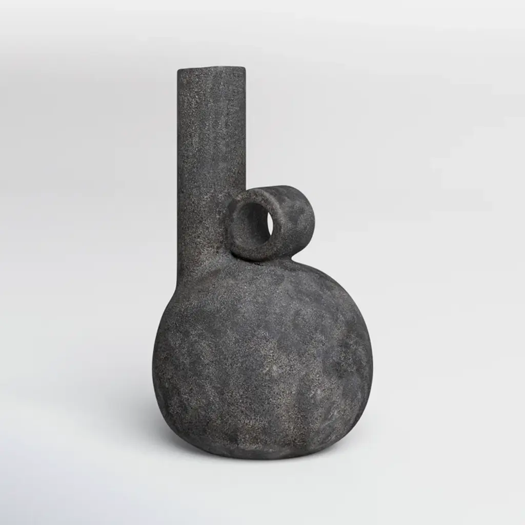 Leaning into natural Scandinavian design, this abstract vase brings a modern aesthetic to your indoor or outdoor space. It's crafted with charcoal gray terracotta that's distressed for a lived-in look. This vase strikes a geometric silhouette with a round base and off-center cylindrical neck. The neck is balanced by an adjacent circular accent that's open at its center. At 10.24" tall, this petite vase is designed to be displayed as a sculptural decorative piece or filled with flowers.