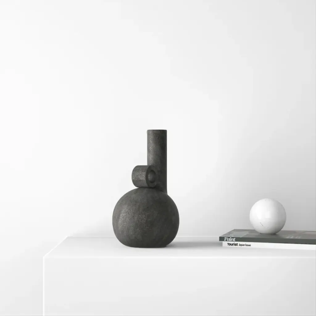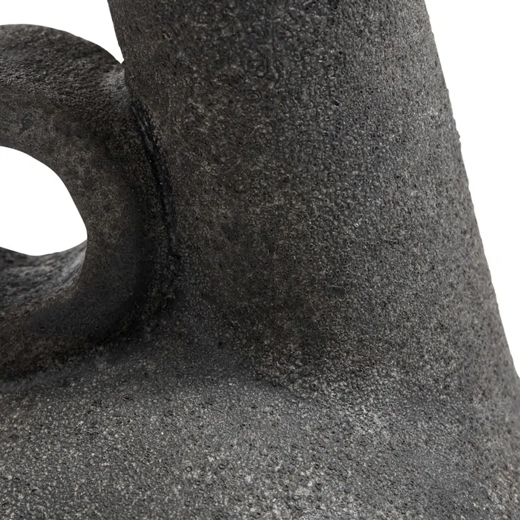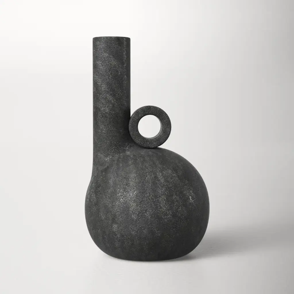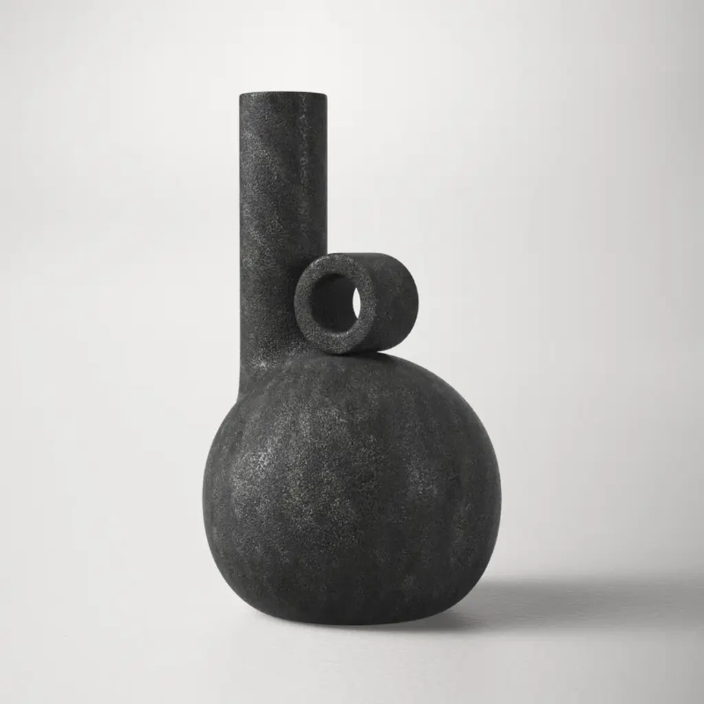 Leaning into natural Scandinavian design, this abstract vase brings a modern aesthetic to your indoor or outdoor space. It's crafted with charcoal gray terracotta that's distressed for a lived-in look. This vase strikes a geometric silhouette with a round base and off-center cylindrical neck. The neck is balanced by an adjacent circular accent that's open at its center. At 10.24" tall, this petite vase is designed to be displayed as a sculptural decorative piece or filled with flowers.
