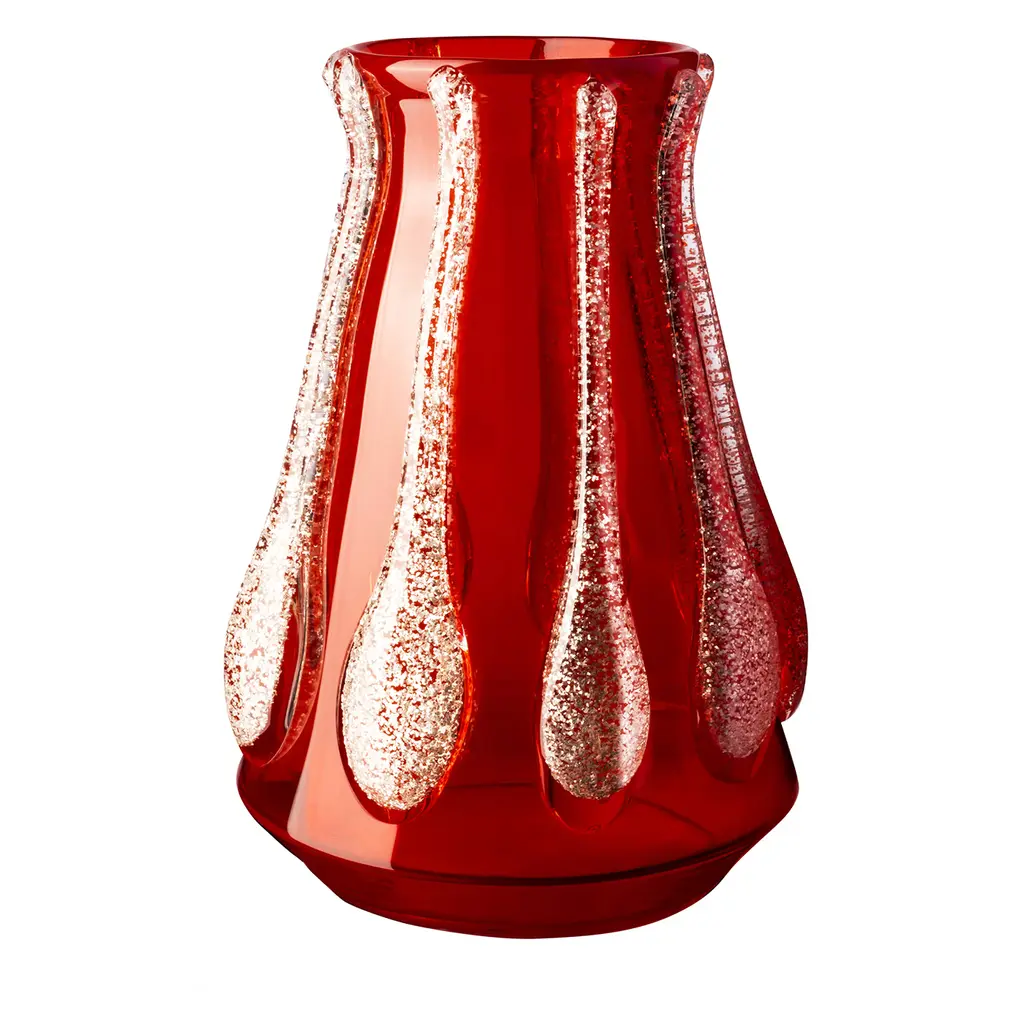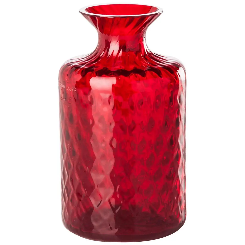 Sensual in its hue and curves, this red Murano glass vase belongs to the Samarcanda Collection of masterfully mouth-blown pieces distinguished by the iconic and traditional balloton texture. The resulting optical flair results emphasized by the piece's fluid contours, which outline a bulging body progressively tapering to a narrow neck.