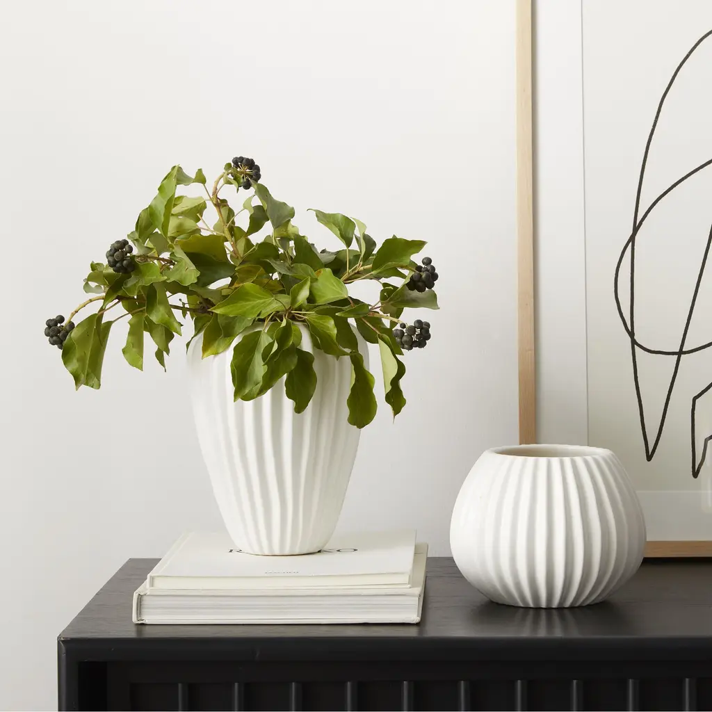 Our Textured White Ceramic Vases pop whether or not they are displaying botanicals thanks to the sleek, patterned exterior. Earthenware in a White glazed finish. Not watertight. Sold individually. Made in Vietnam.