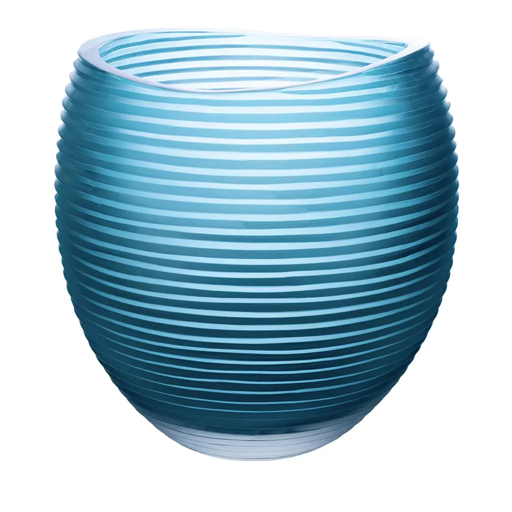 With stately charm, this noonday tide aqua vase brings a sophisticated air to a display. Hand-applied crimped ribbons gently add artistic dimension.
