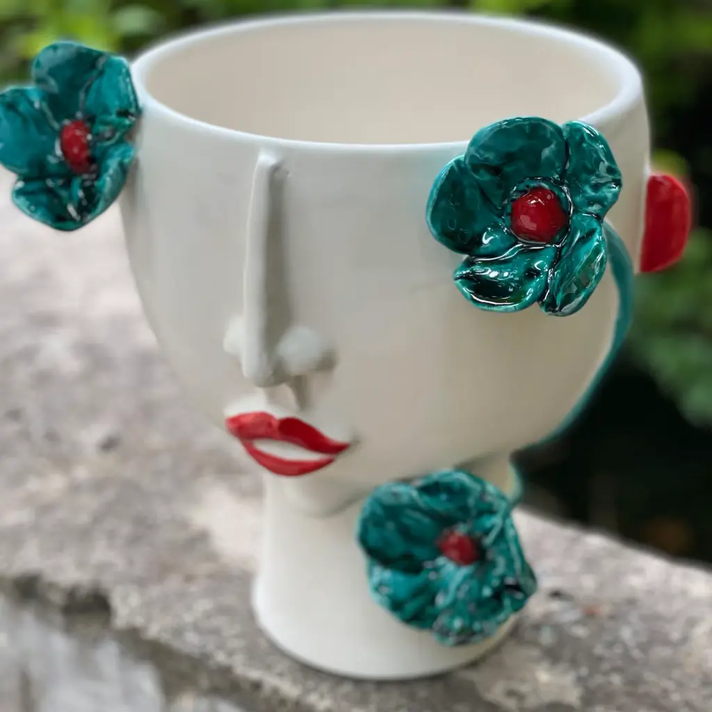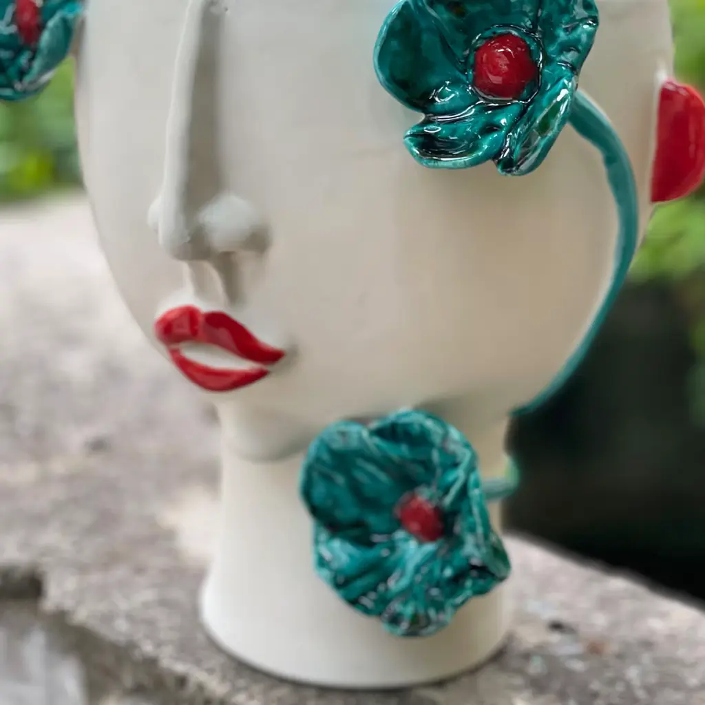A head with a face and flowers in relief that can be used as a centerpiece or a vase for flowers and plants. "Santina infiorata" is a Sicilian name that belongs to a real young lady that lives in Noto.