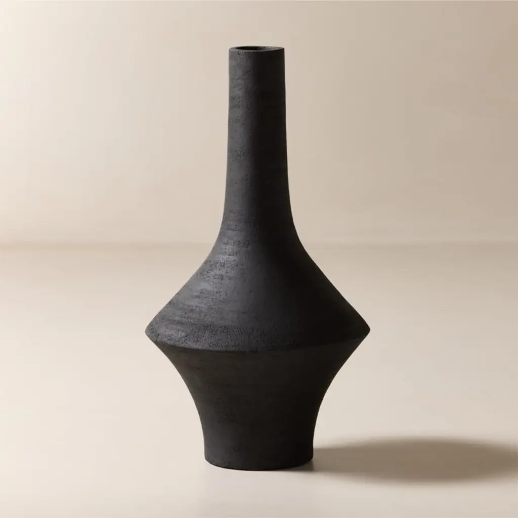 Skilled potters in Indonesia transform terracotta into a sculptural floor vase that makes a statement. Molded and finished by hand, the terracotta vessel features a subtly textured surface in matte black for a modern look. Featuring an angular silhouette with a saucer-shaped curve, the vase pairs with the double tapered disc design of the Cabo floor vase for a subtle inversion. CB2 exclusive.