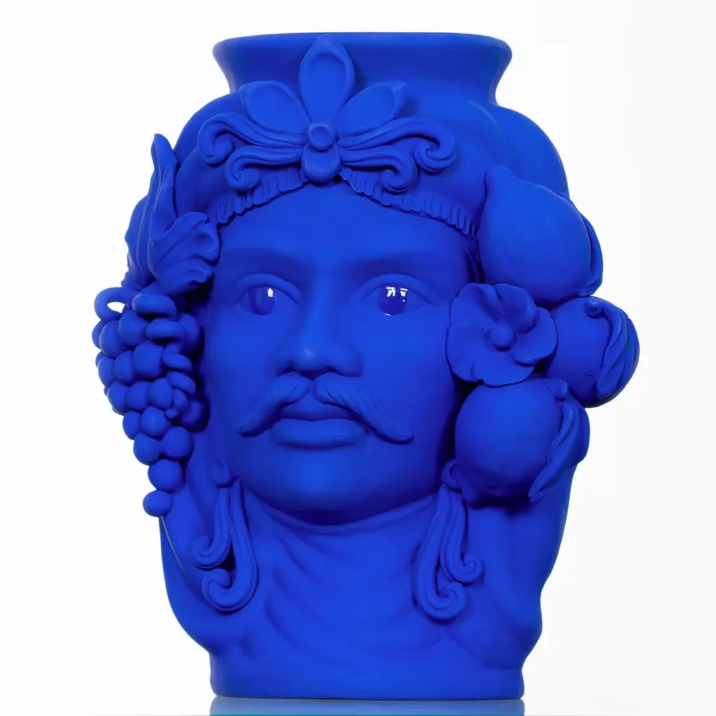A contemporary interpretation of the traditional Moorish sculptures in Sicilian art, this vase is a harmonious combination of artisan craftsmanship and modern sensibility. Its sculptural volumes and naturalistic details of the man's face and decorations are exquisitely made by hand and finished with a matte oltremare blue hue, accented with a horizontal stripe in gold leaf to mark the eyes. This work of art can be used to display flowers or as one-of-a-kind sculpture in a contemporary or eclectic home. The vase cannot be filled with water.