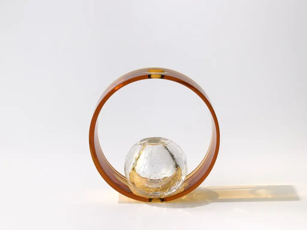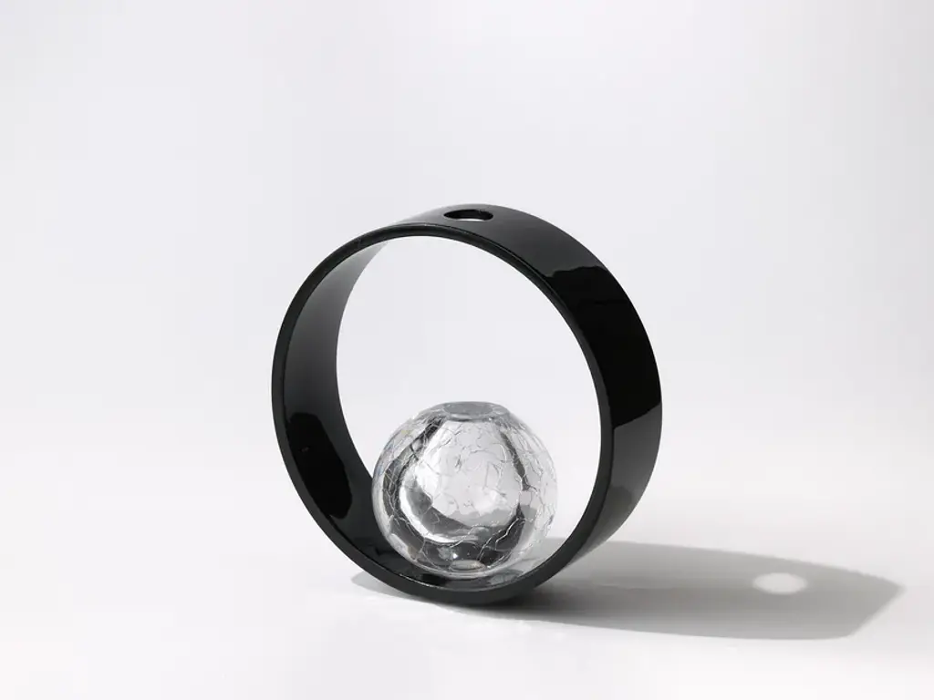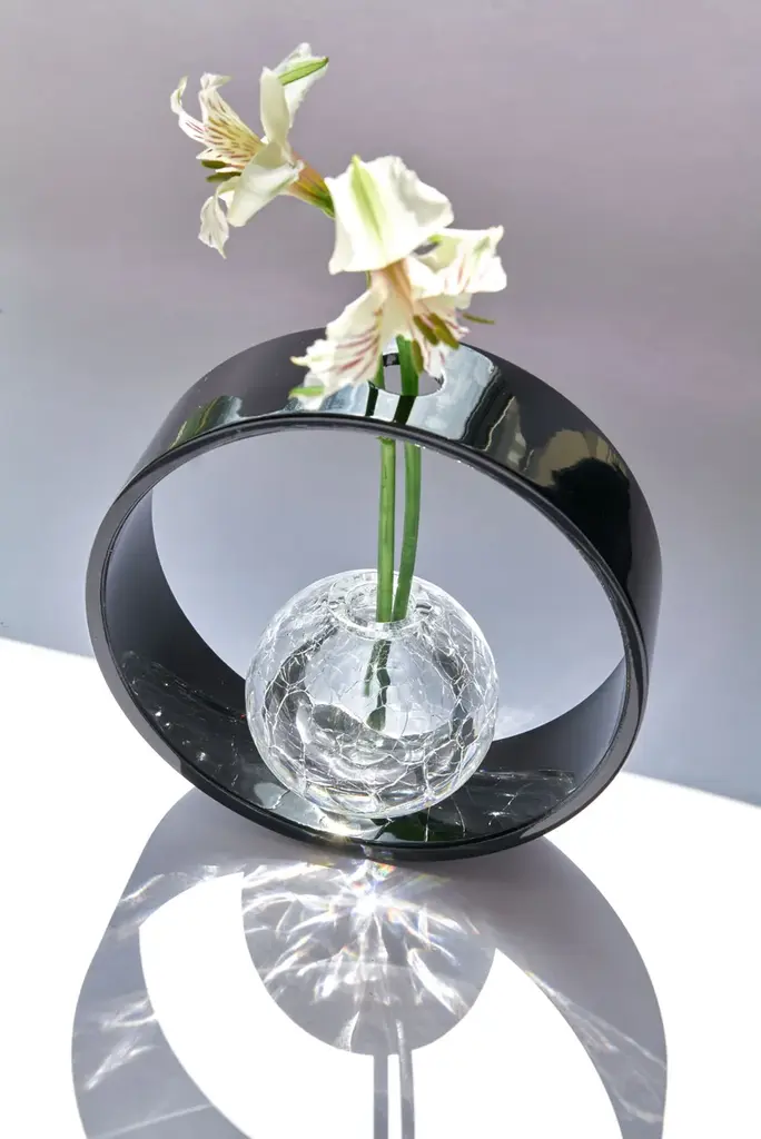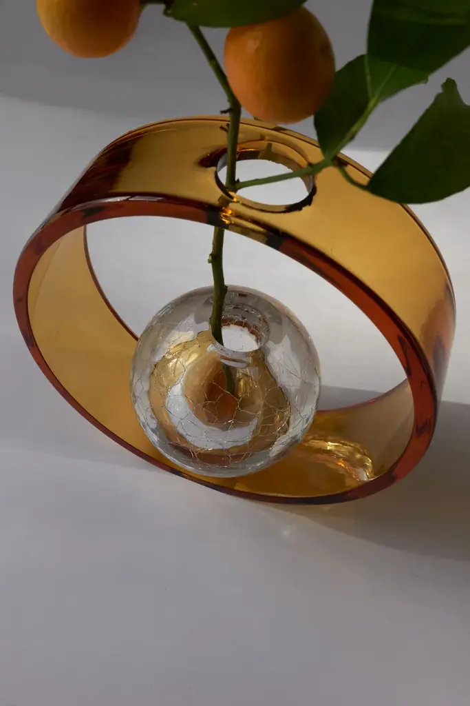 SATURNINO is a blown glass vase.It is a combination of two pieces, the ring and the craquelé sphere, balanced by their own weight. A combination serving as both a sculptural crystal piece and a flower vase. Artfully created with the traditional hand - blowing technique. The pureness of the crystal reflects the light illuminating the interior which is placed in. Variations in color or in small details are the result of the craftsmanship of this article and make each piece unique.Featureshand-blown and shaped in Italycolor: amber or black or light purple + ambermaterial: pure lead crystal glass