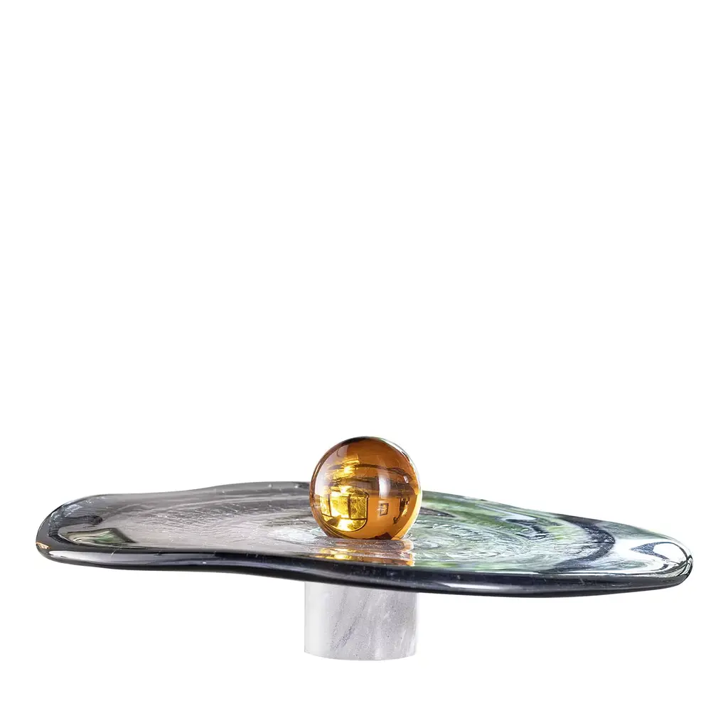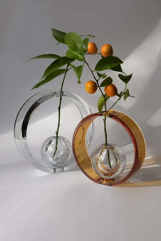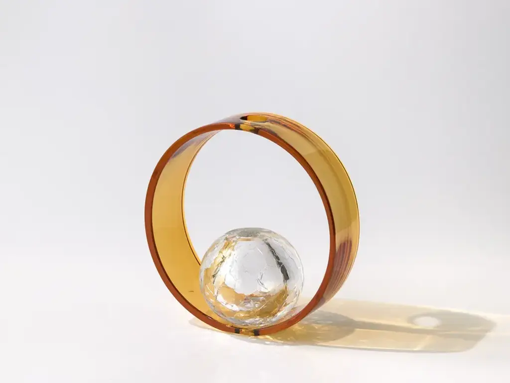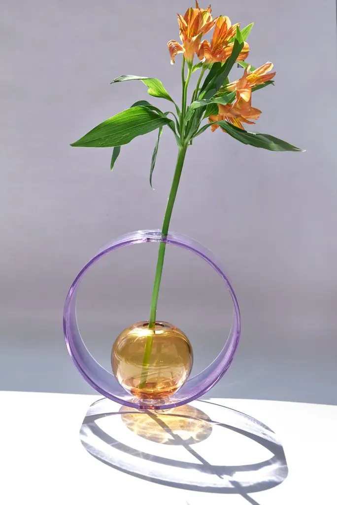 SATURNINO is a blown glass vase.It is a combination of two pieces, the ring and the craquelé sphere, balanced by their own weight. A combination serving as both a sculptural crystal piece and a flower vase. Artfully created with the traditional hand - blowing technique. The pureness of the crystal reflects the light illuminating the interior which is placed in. Variations in color or in small details are the result of the craftsmanship of this article and make each piece unique.Featureshand-blown and shaped in Italycolor: amber or black or light purple + ambermaterial: pure lead crystal glass