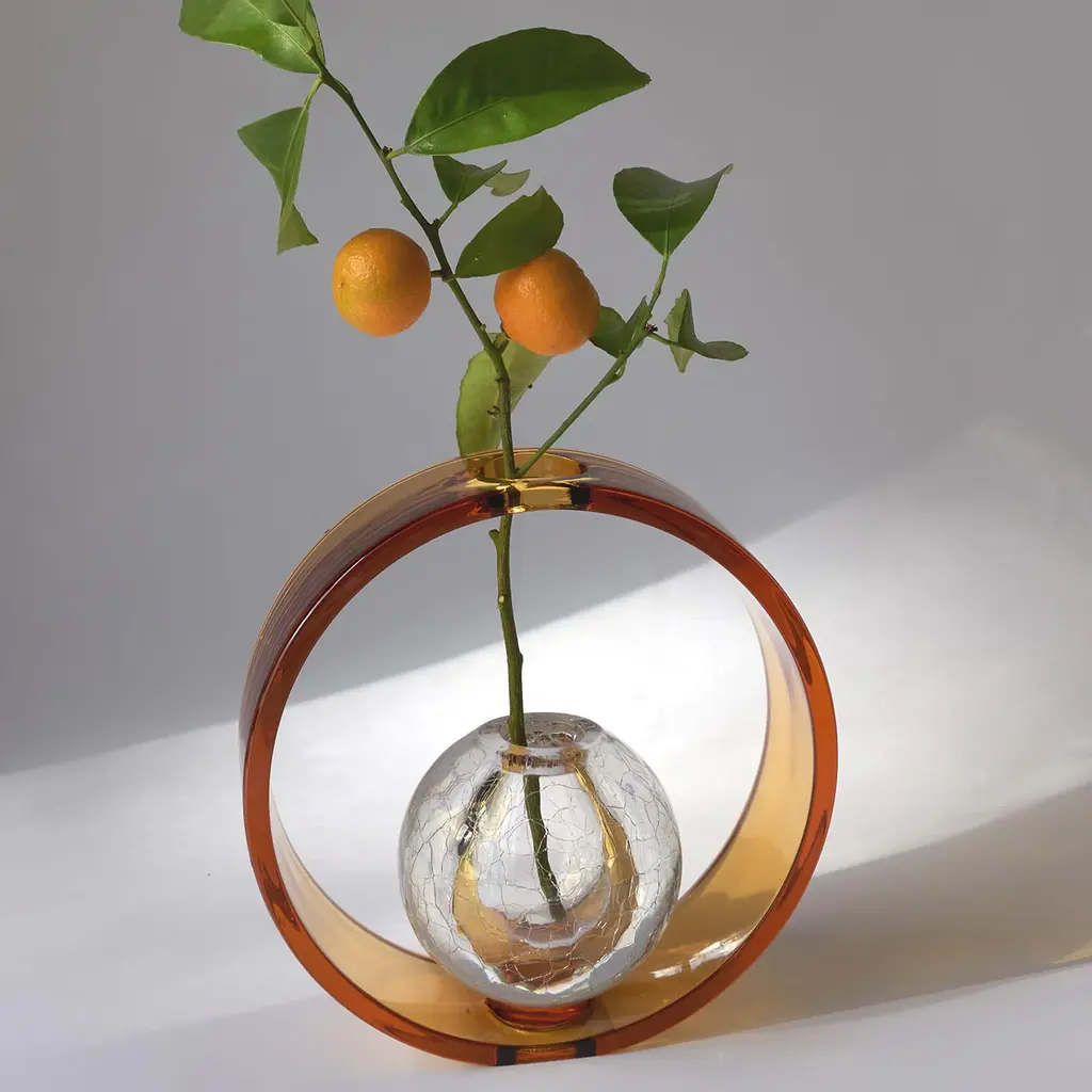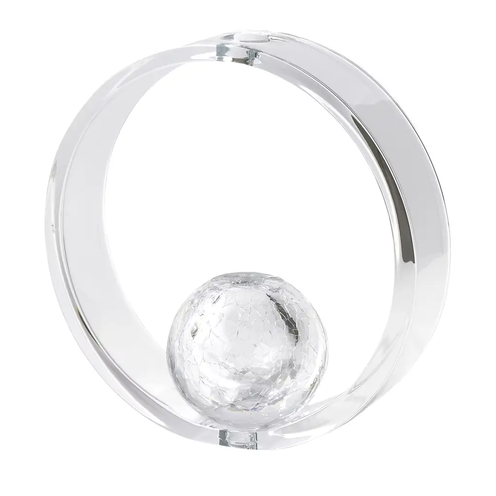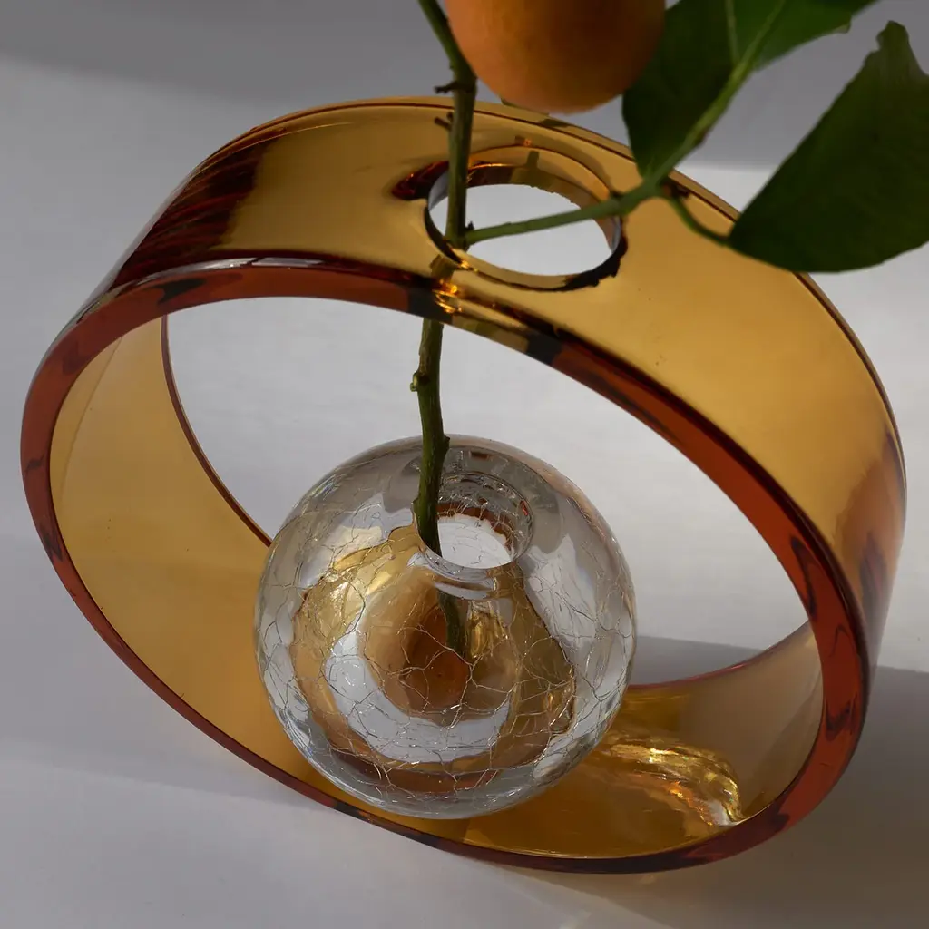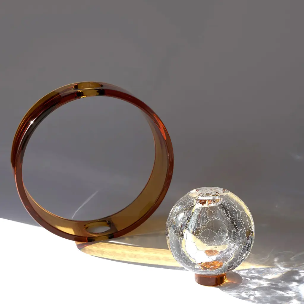 Saturnino is a combination of two pieces, the amber ring, and the craquelè transparent sphere, balanced by their own weight. A play of rounded symmetries, that reflect the light projecting a multitude of shadows and reflections through the stroboscopic effect of the craquelè sphere. The pureness of the crystal and the rich, deep amber hue, illuminate the interior which is placed in. A crystal piece artfully created with the traditional hand-blowing technique.