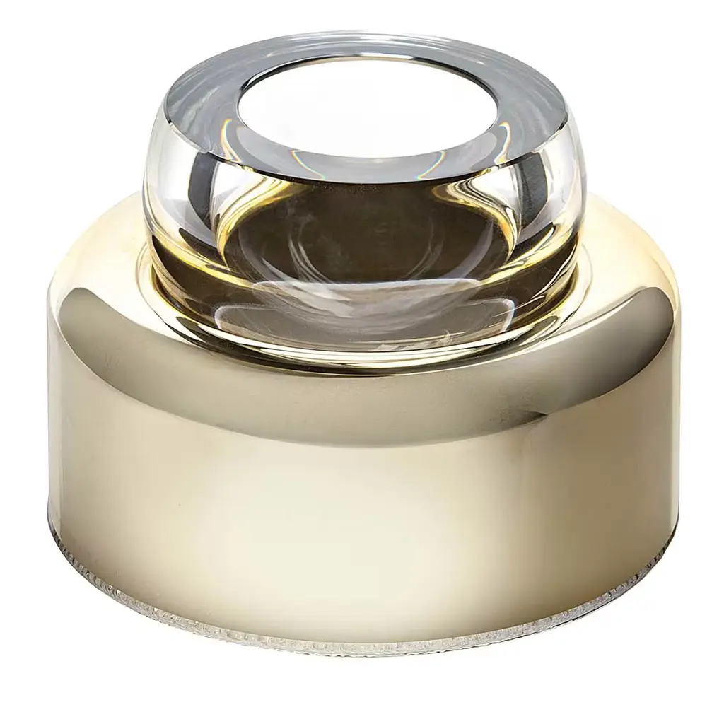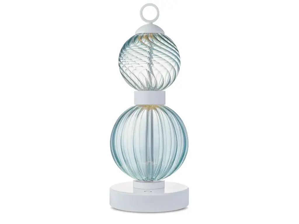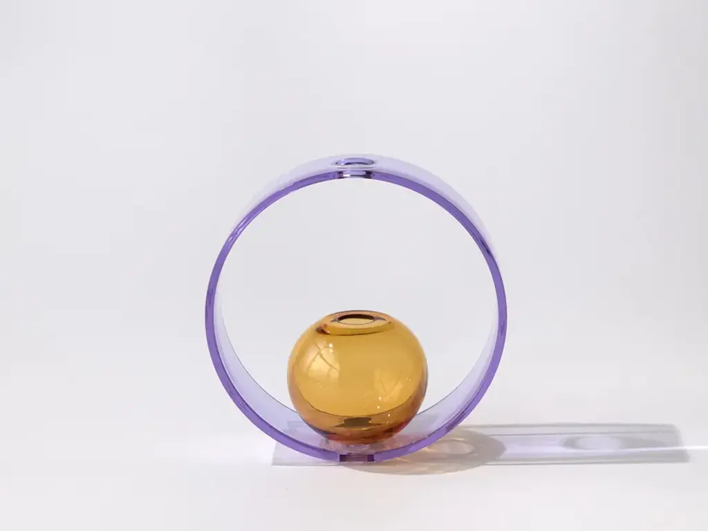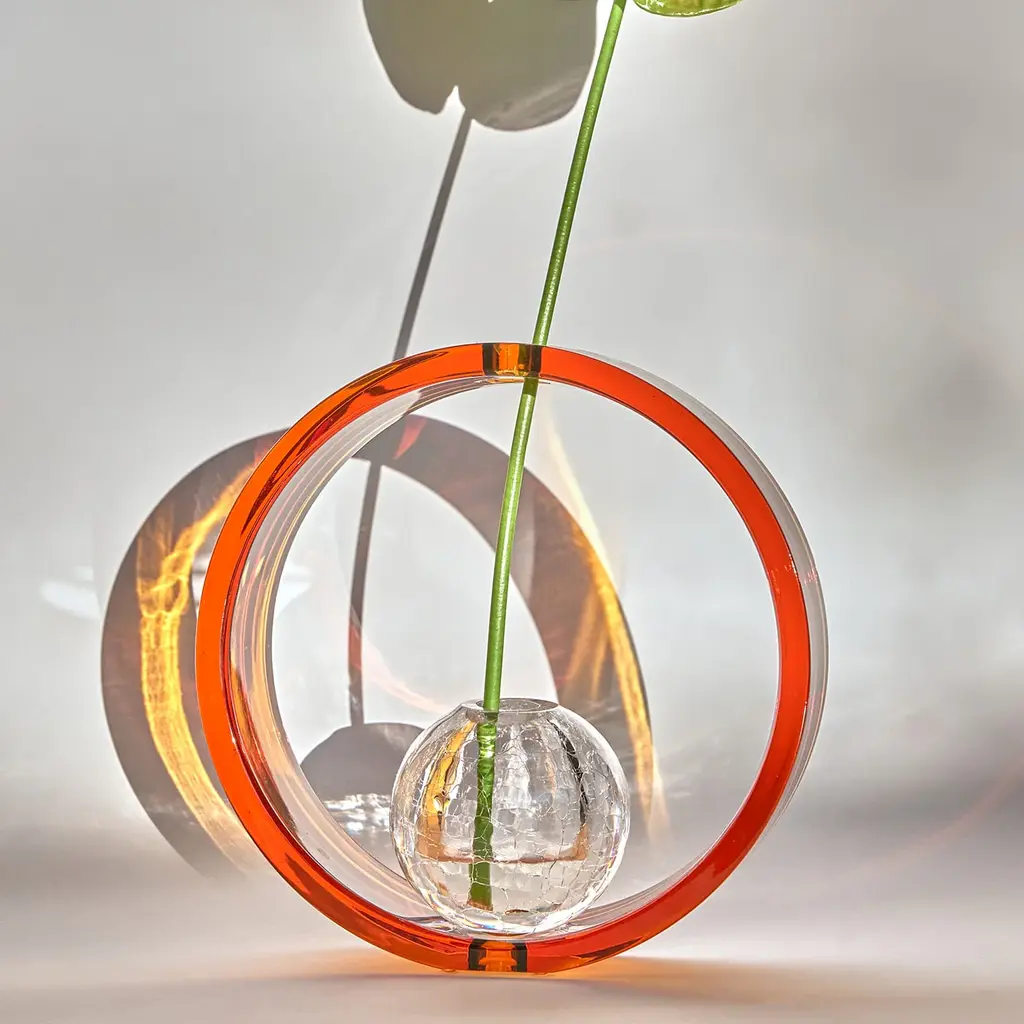 Saturnino is a combination of two pieces, the amber ring, and the craquelè transparent sphere, balanced by their own weight. A play of rounded symmetries, that reflect the light projecting a multitude of shadows and reflections through the stroboscopic effect of the craquelè sphere. The pureness of the crystal and the rich, deep amber hue, illuminate the interior which is placed in. A crystal piece artfully created with the traditional hand-blowing technique.