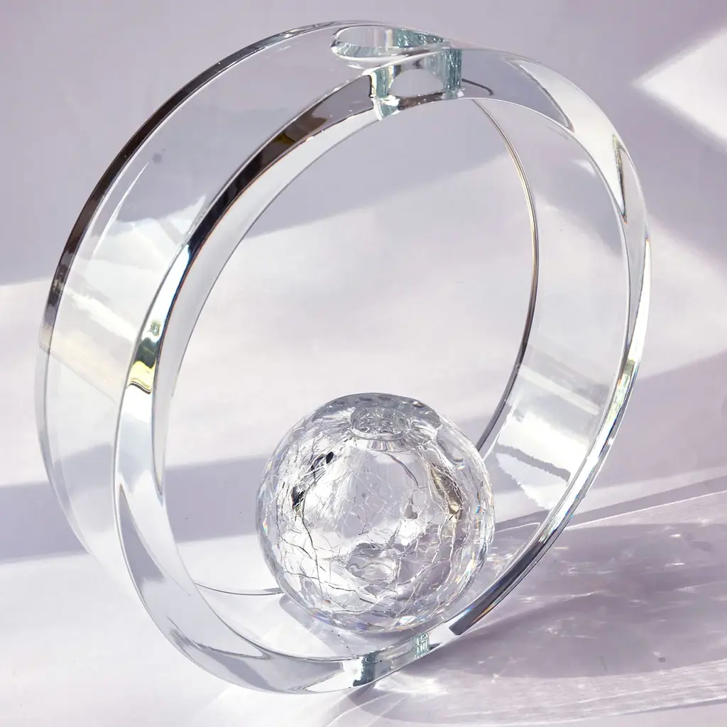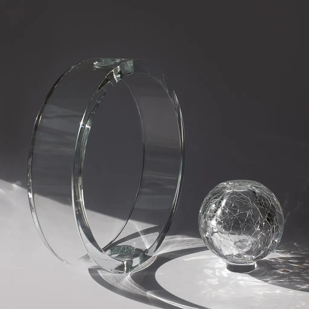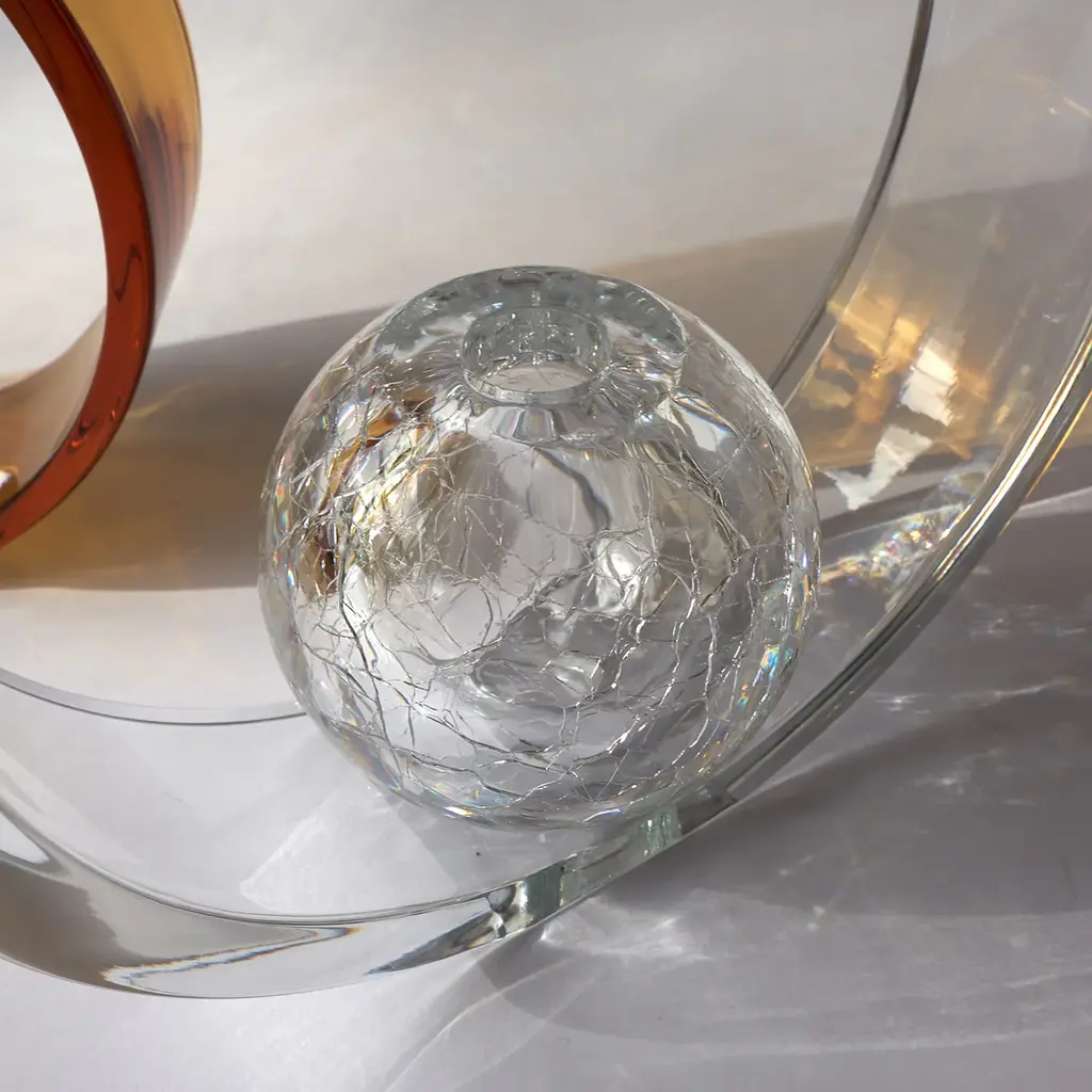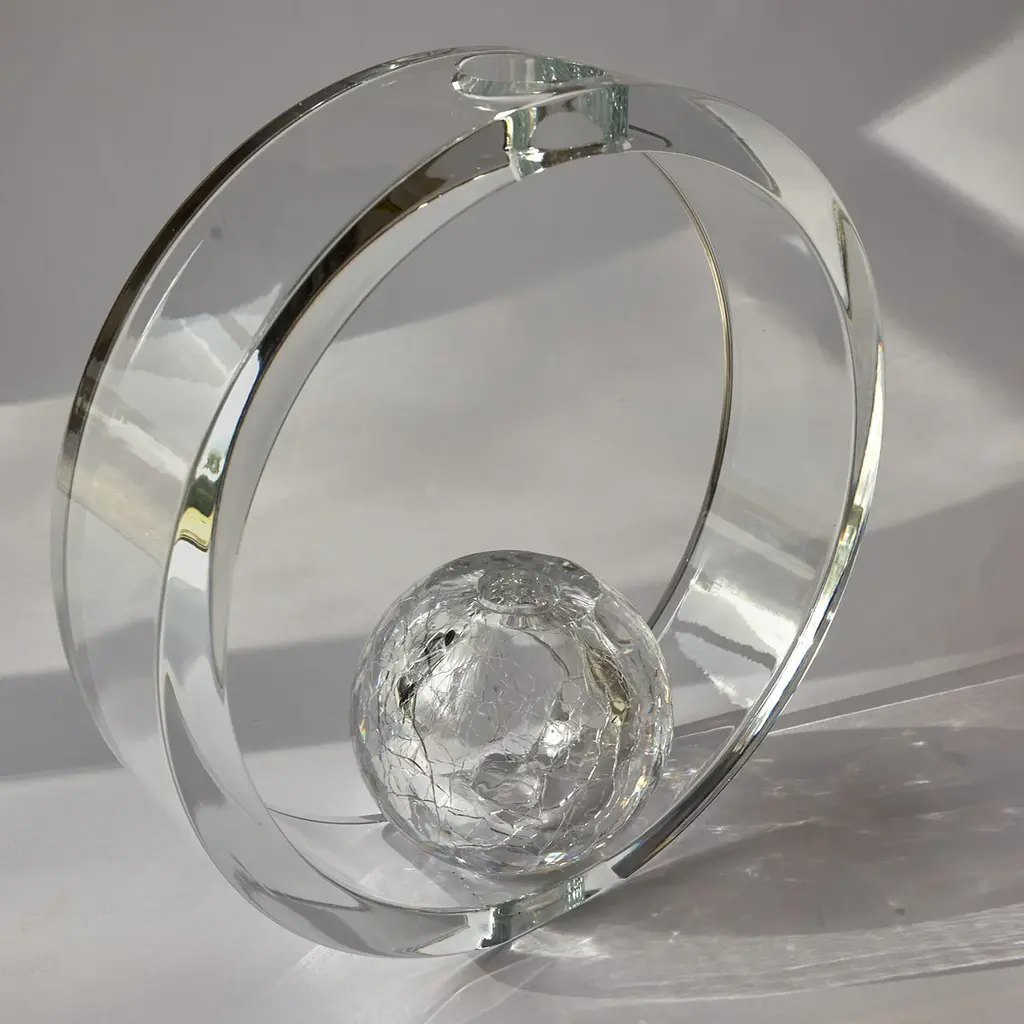 Saturno is a combination of two pieces, the ring and the craquelè sphere, balanced by their own weight. A play of rounded symmetries, that reflect the light projecting a multitude of shadows and reflections through the stroboscopic effect of the craquelè sphere. The pureness of the crystal illuminates the interior in which is placed. A crystal piece artfully created with the traditional hand-blowing technique. Variations in color or in small details are due to the craftsmanship of the object.