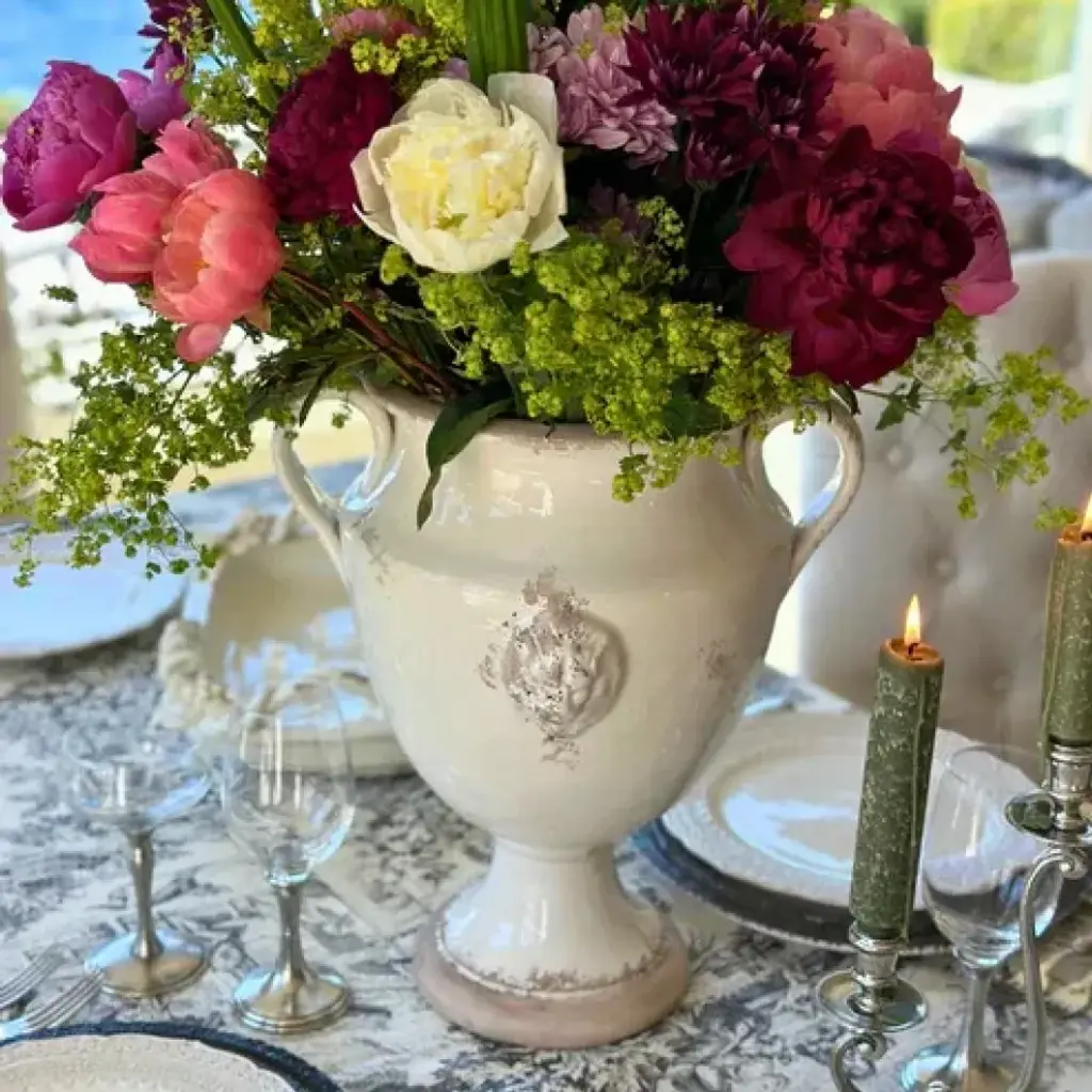 Our Scavo pieces add old world charm to any room with their beautiful antique-like aging treatment. The Leone 2-Handled Urn is adorned with a lion face emblem. It is perfect for displaying flowers or as a standalone piece, it will add an Italian regal flair to any room. Founded in 1997 by Ann Skidmore, Arte Italica is a story of one woman's passion for Italian history, culture, art, and vintage pewter. Today, Arte Italica is one of the leading importers of European tabletop and home accessories products in the United States. Every piece is handmade and designed so that they can easily be mixed and matched to create a timeless, classic, and effortless look.