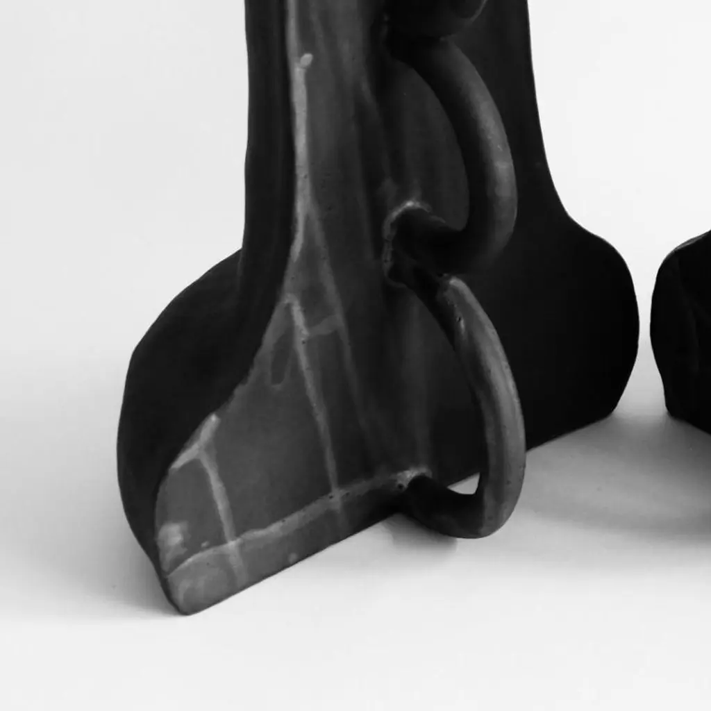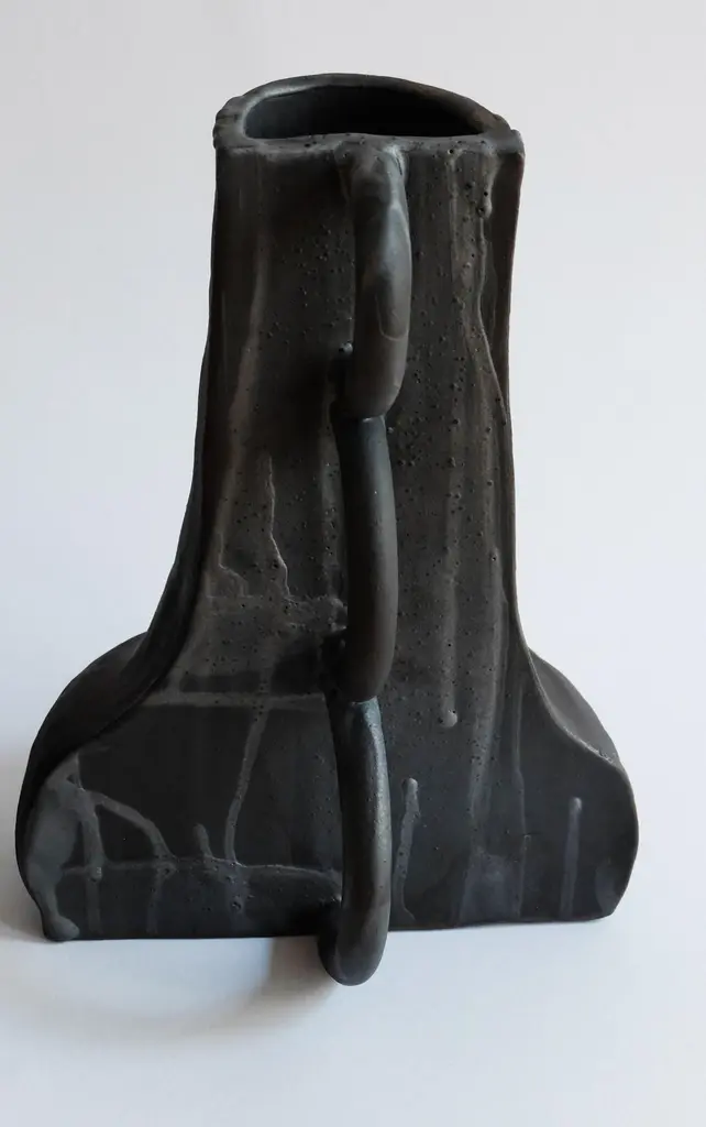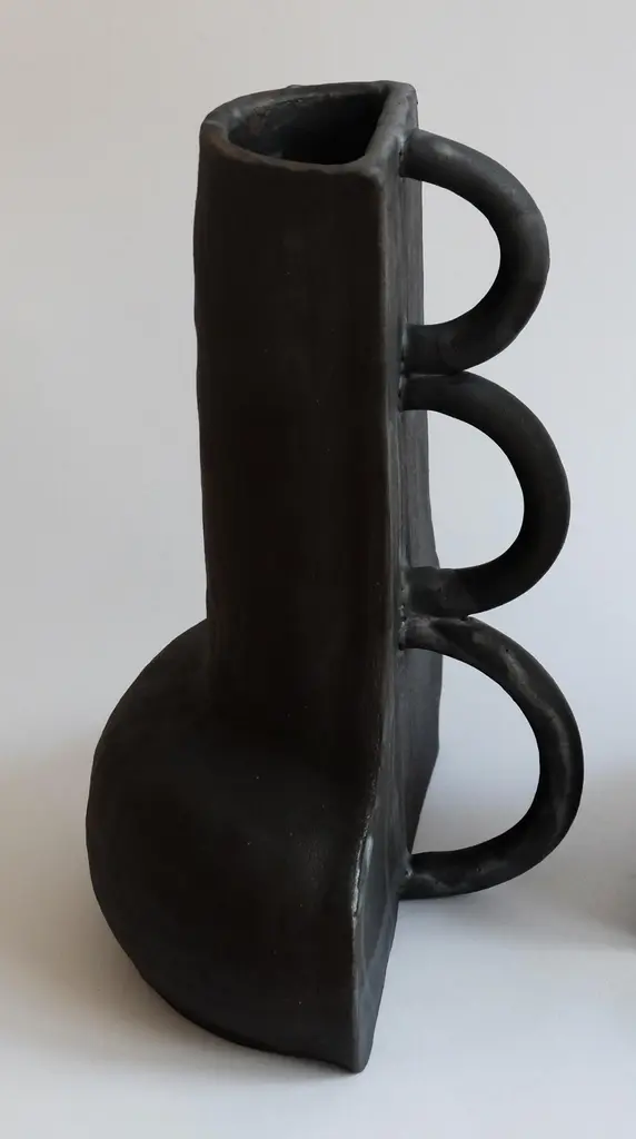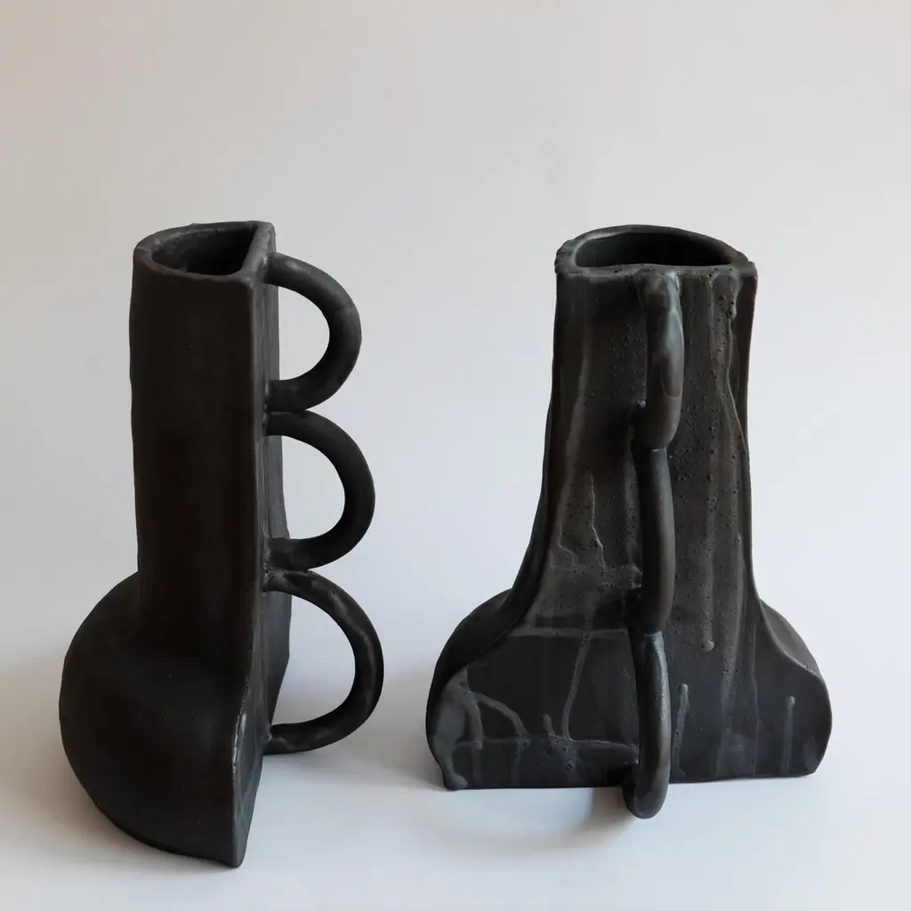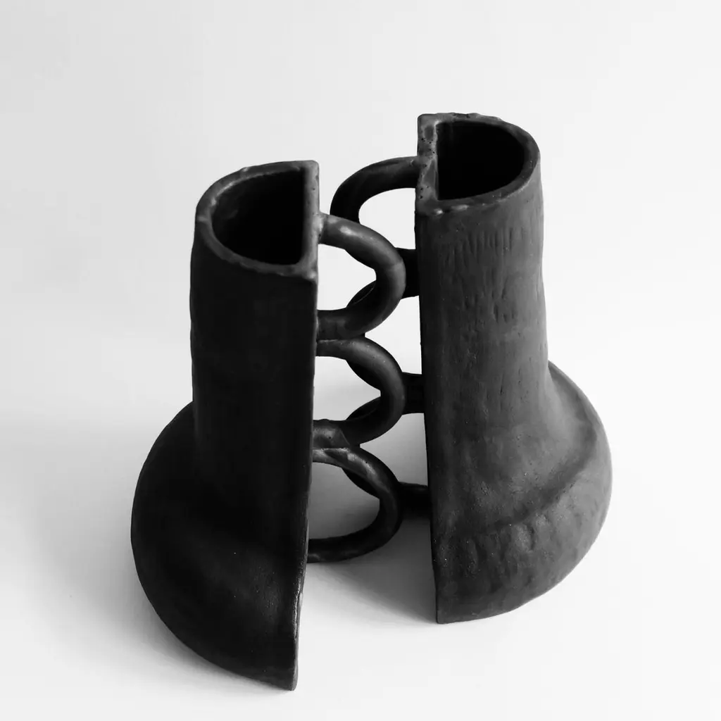 Sculptural fragment vase by Ia KutateladzeDimensions: W 20 x H 30 cmMaterials: Raw black clayFragment 01 vase is a sculptural, functional object hand-built from black clay. The contrasting sides- organic shape on one side and playful geometry on the other, complement each other, creating a balanced unity of forms and textures.IAAI / Ia Kutateladze is a Georgian multidisciplinary designer based in Berlin. The production is done by her in the studio, where differentmediums of design and craft are merged together with experimentation, playfulness and fascination for diverse materials.“To me, design is a palette of boundless imagination, intuitive approach, aesthetic sense and adventurousness expressed through forms. Design excellently transforms everyday life into joyful process of invention. My designs are playful objects of affection, which are results of slight and uncomplicated impressions, observations or interpretations.Sheer simplicity and attention to details, integrated with profound understanding of the surroundings, the past and the future, are at the core of my designs.I would like my designs to be more than functional objects, to have the power to magically interact with people.”.