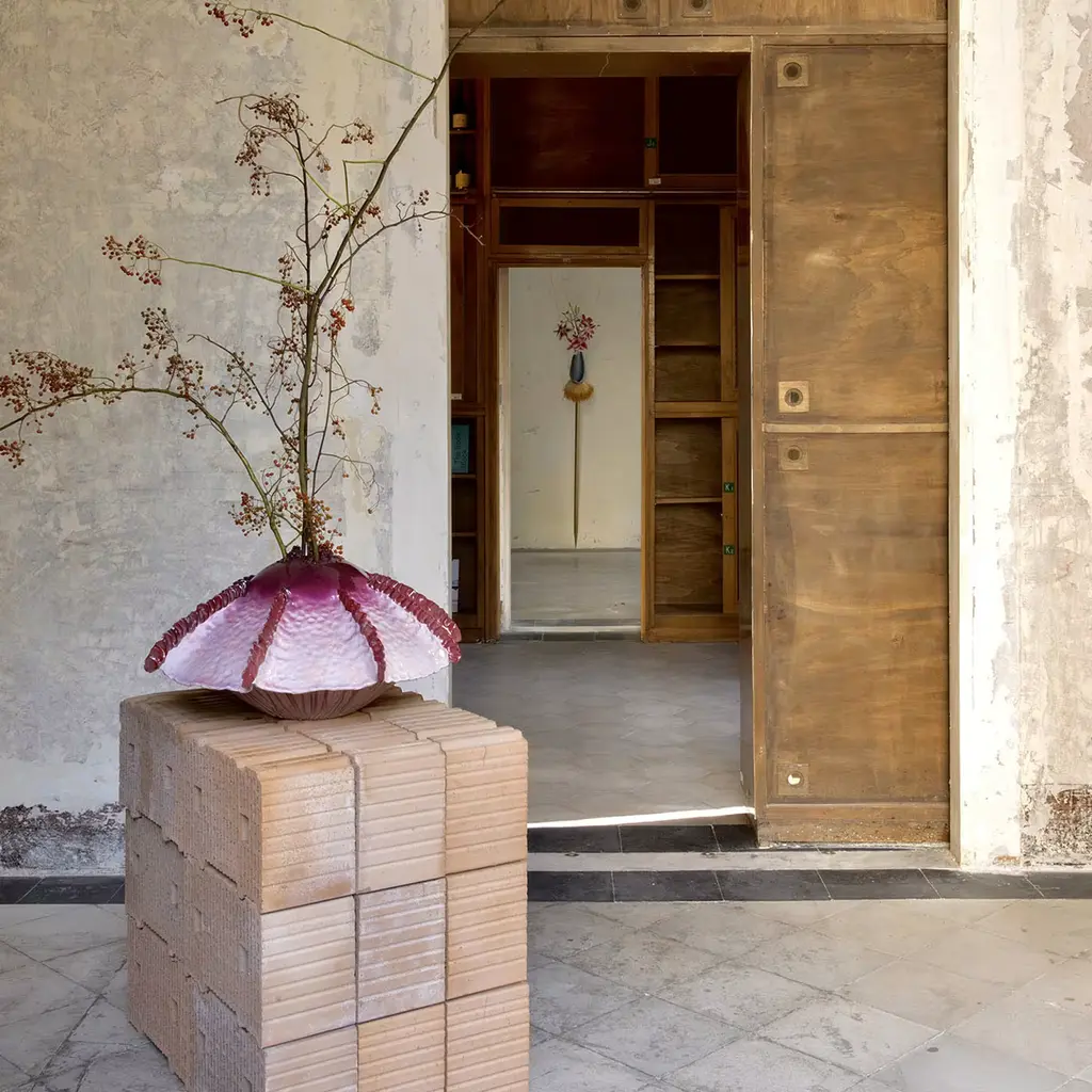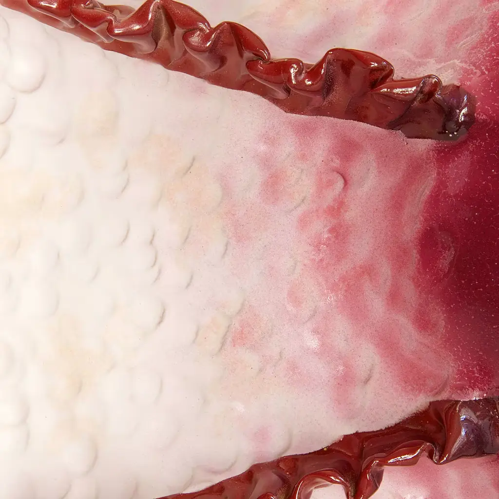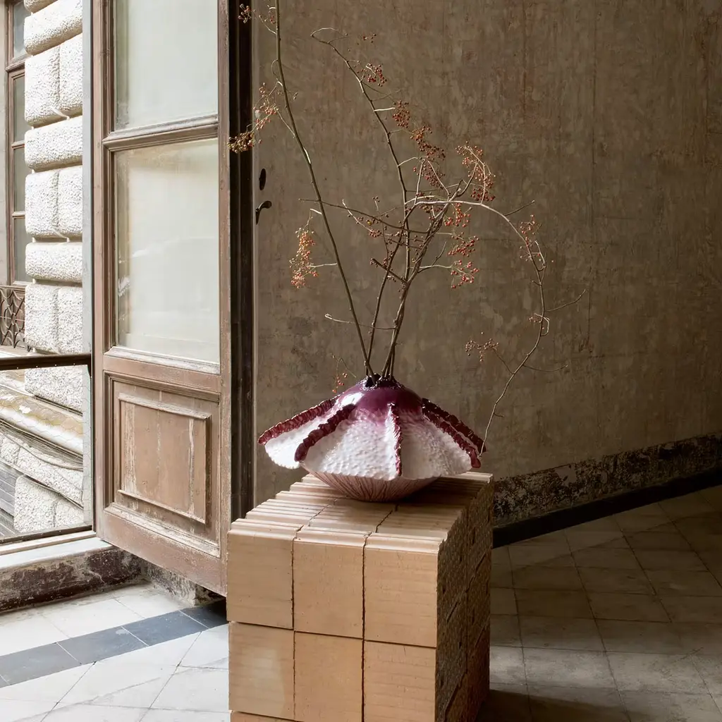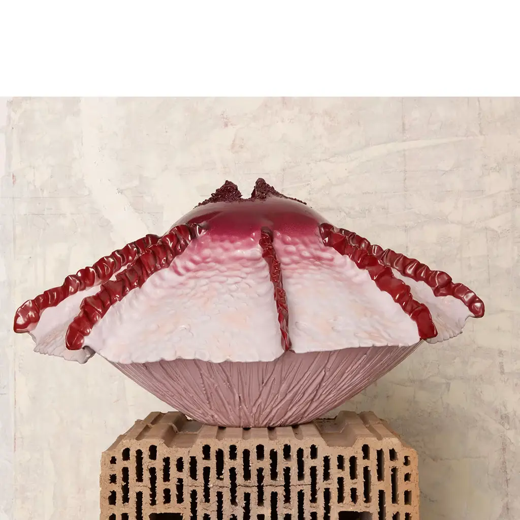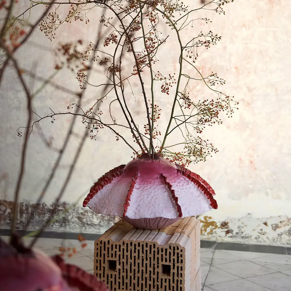 A reflection on pain, this intimate journey celebrates the power of nature and the feminine. Sara Ricciardi’s limited edition "Semi" symbolize both a metaphorical and physical transformation, a rupture that unveils beauty. This handmade clay vase features a large base topped with a lid, both intricately carved into fresh clay. The upper part is shaped through folding, deformation, and sculpture. Glossy pink glaze on the base, matte pink and glossy fuchsia on the lid. Limited edition of 6 pieces.