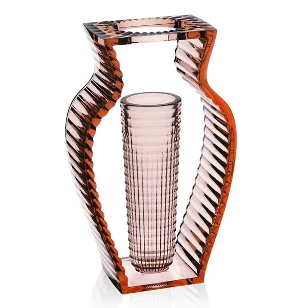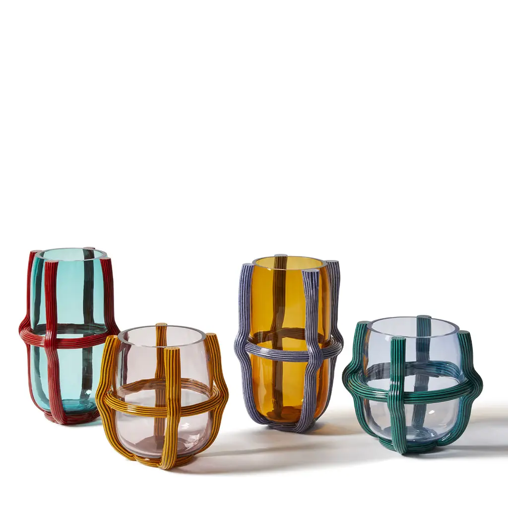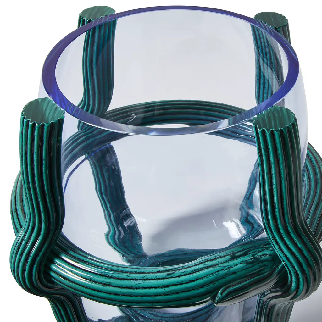 A singular piece in mouth-blown Murano glass, this vase by Patricia Urquiola captures the eye with the clear glass volume appearing as caged between ridged threads in teal glass that recall the Venetian lagoon's hues. Ancient artisan techniques here meet neat lines for a unique sculptural impact. Slight imperfections are to be expected and cherished as a testament to its artisan quality.