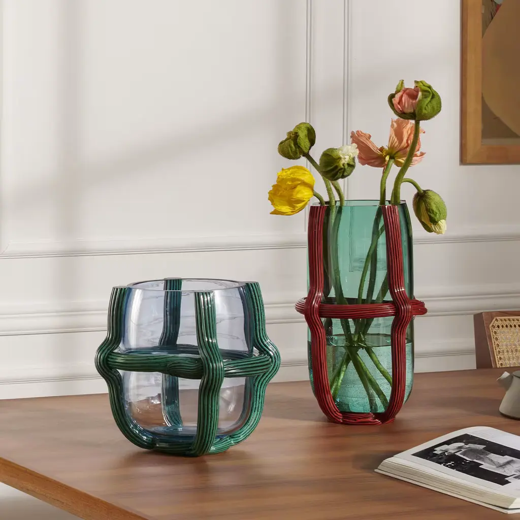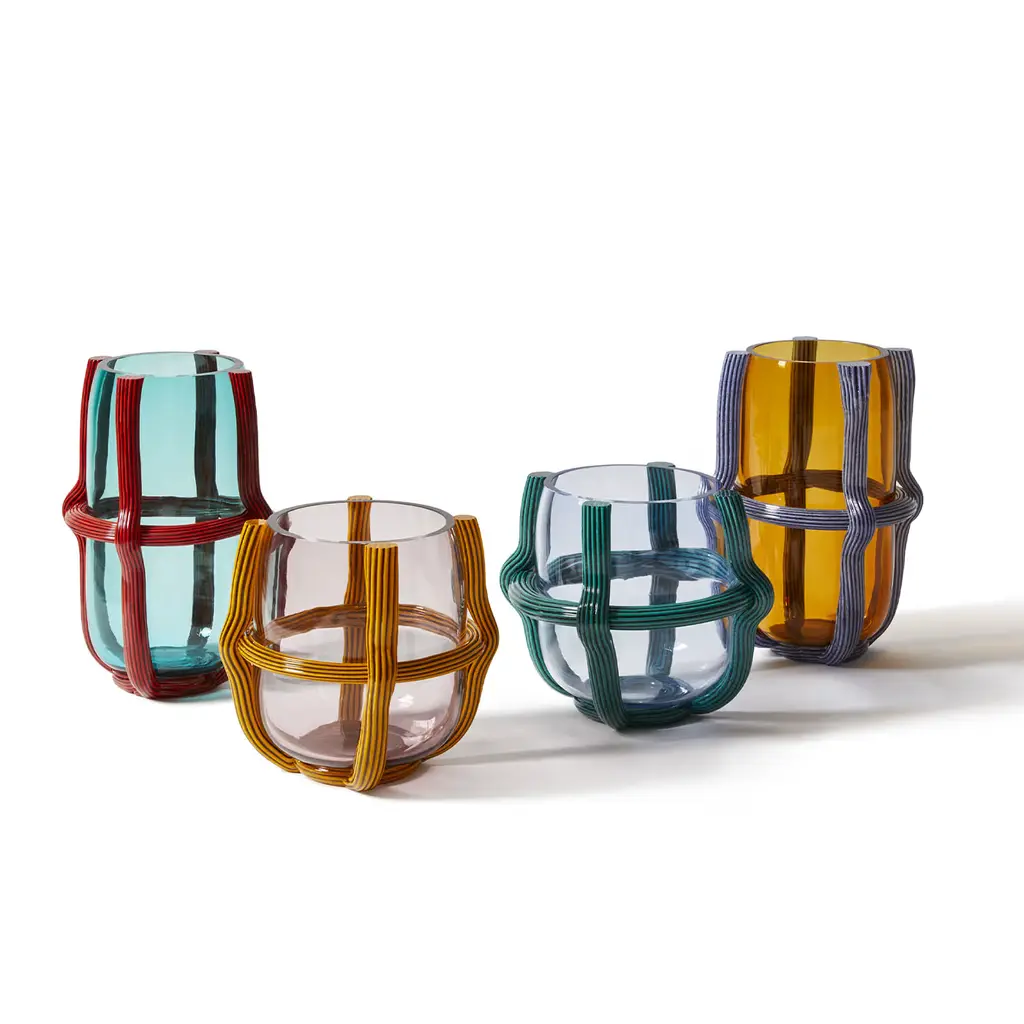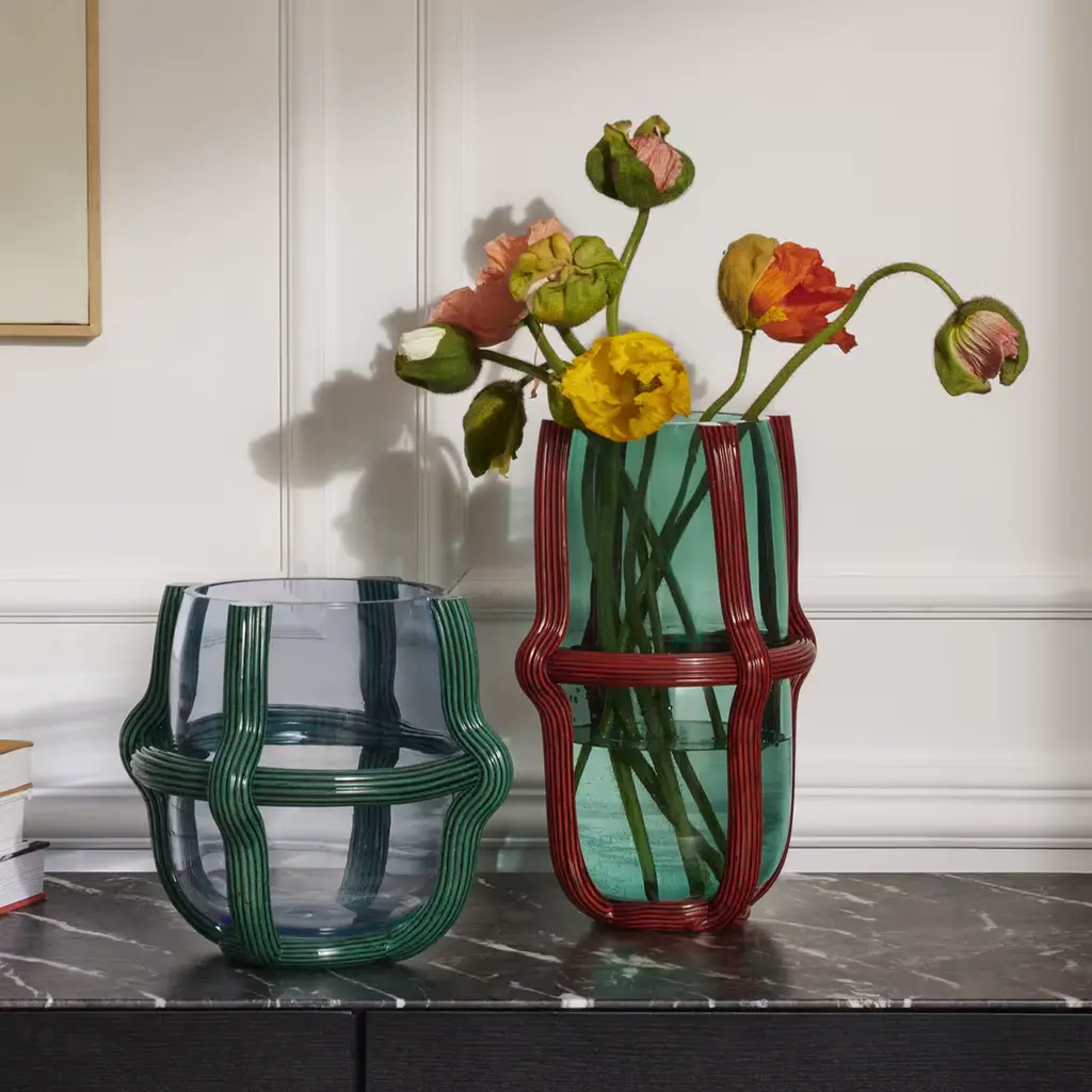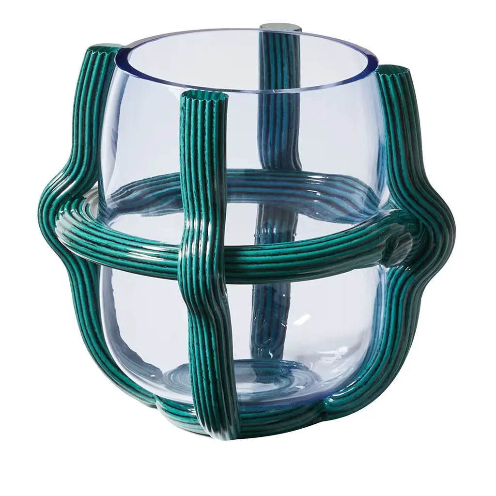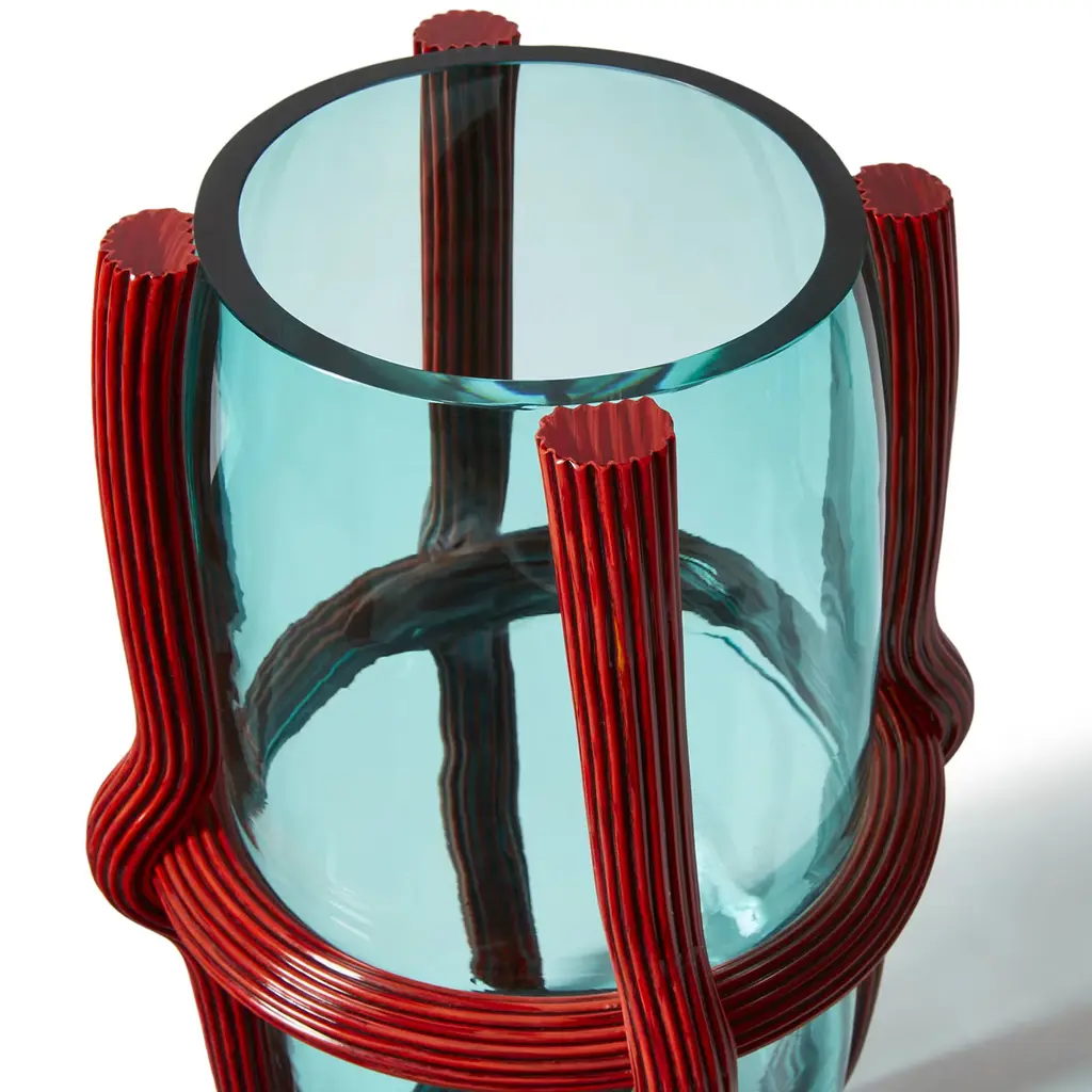 Daring in color as it is intriguing in its sculptural look, this vase is a singular mouth-blown Murano glass piece Patricia Urquiola designed for the Sestiere Collection. An ethereal turquoise vessel appears caged between thick and ridged red glass threads embracing its exterior, elements stating the convergence between ancient techniques and contemporary aesthetics.