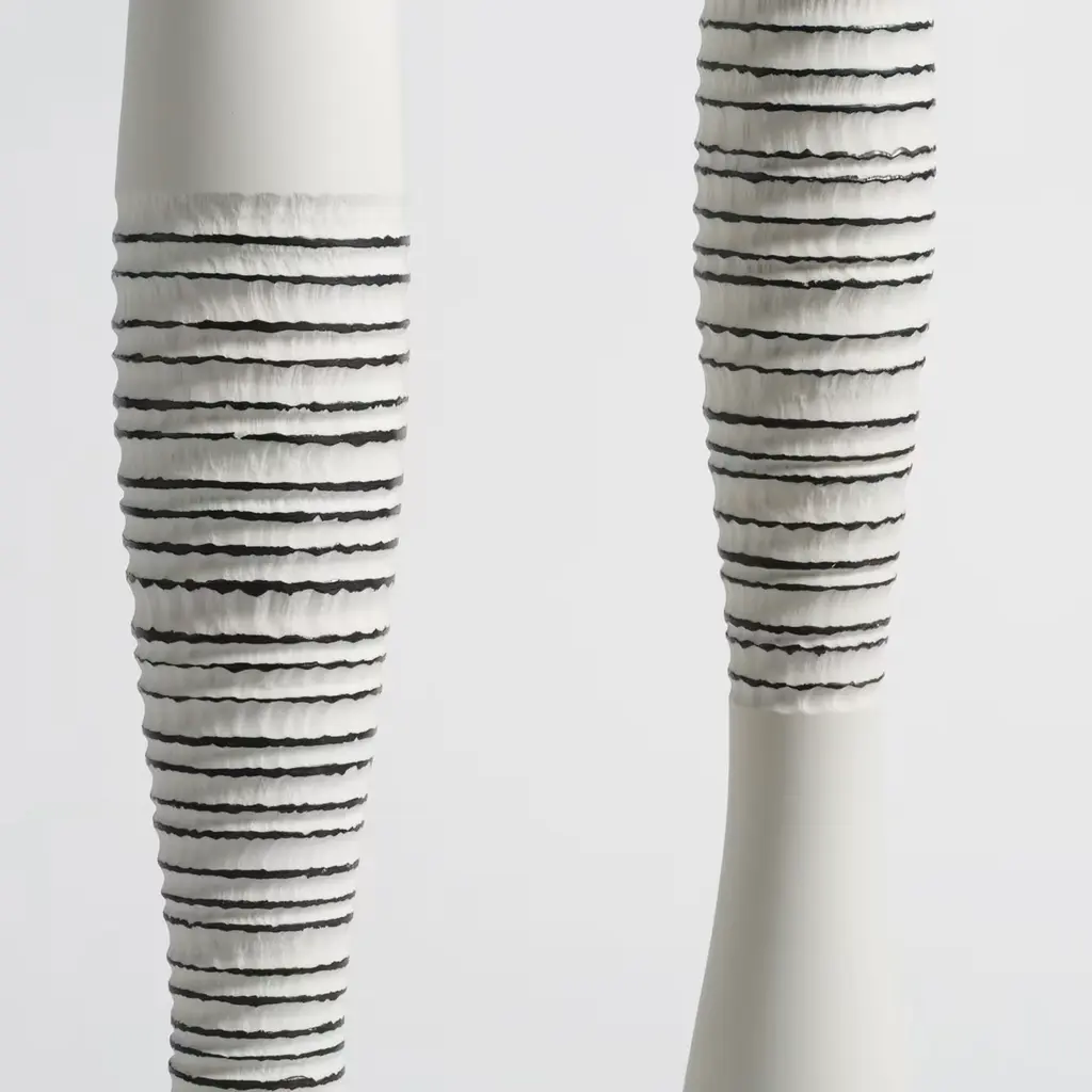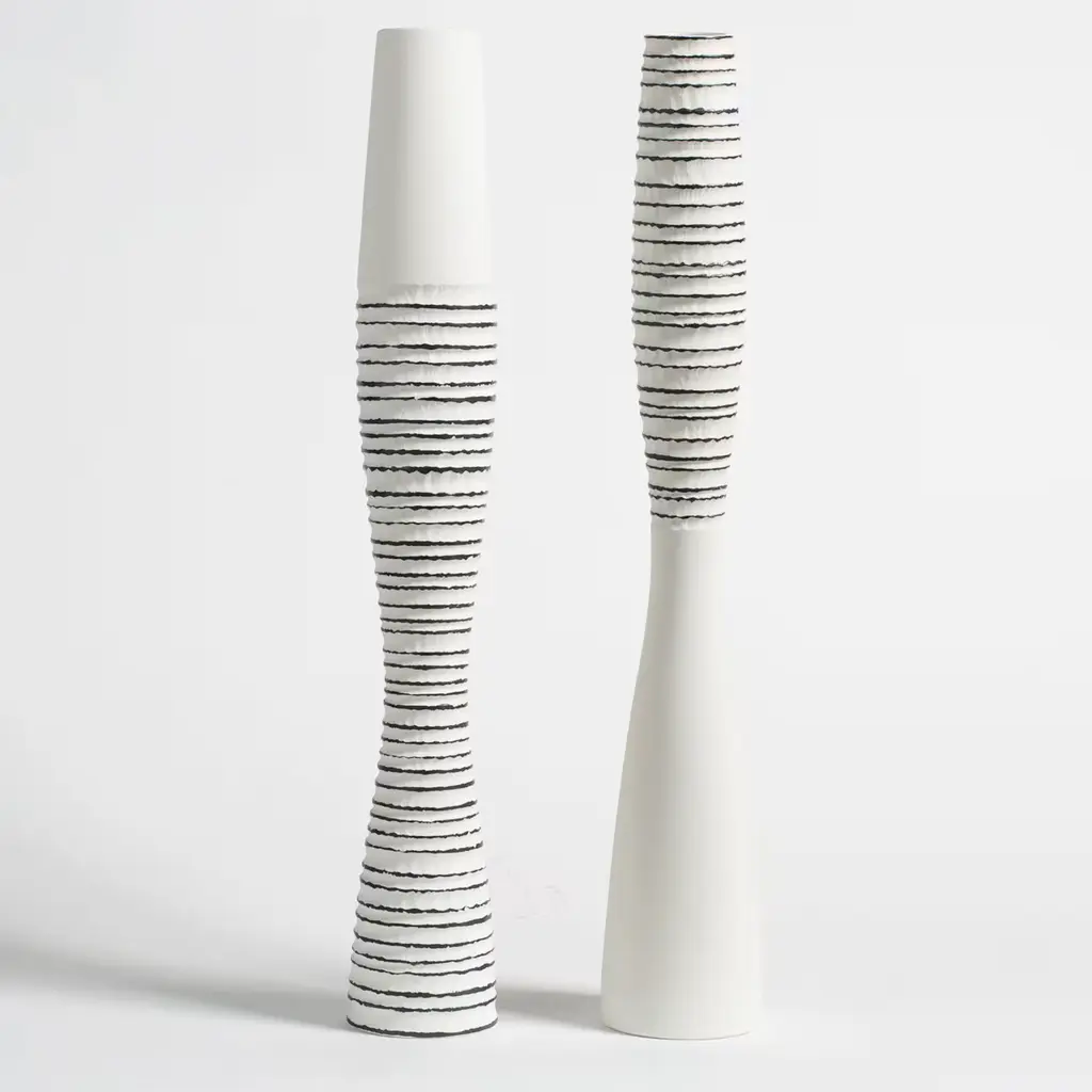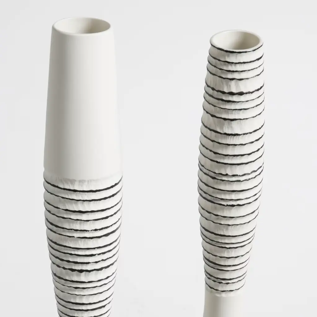 In these exquisite vases in unglazed porcelain, or "biscuit", the texture is enriched with contrasting lines of black parallel horizontal rings decorating the ridges on the exterior of each piece, highlighting each groove in the vases. White and black are the eternal contrast, a symbol of timeless elegance. Both vases are 57cm tall, while one has a diameter of 10cm and the other of 9cm.