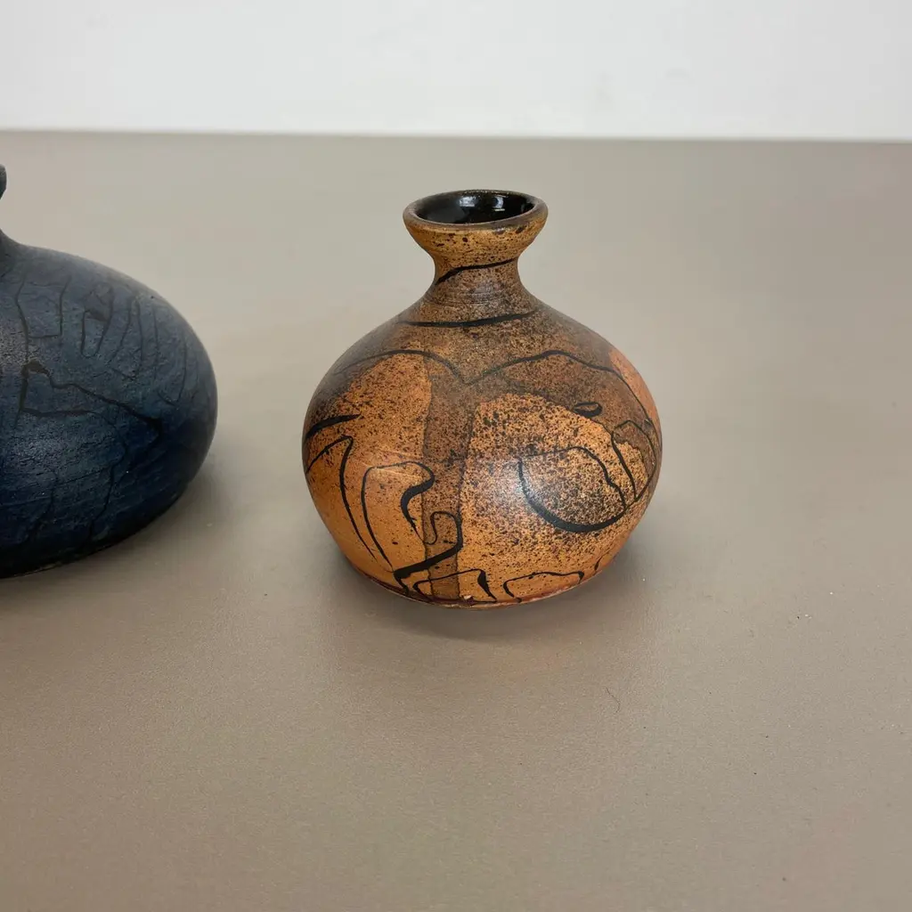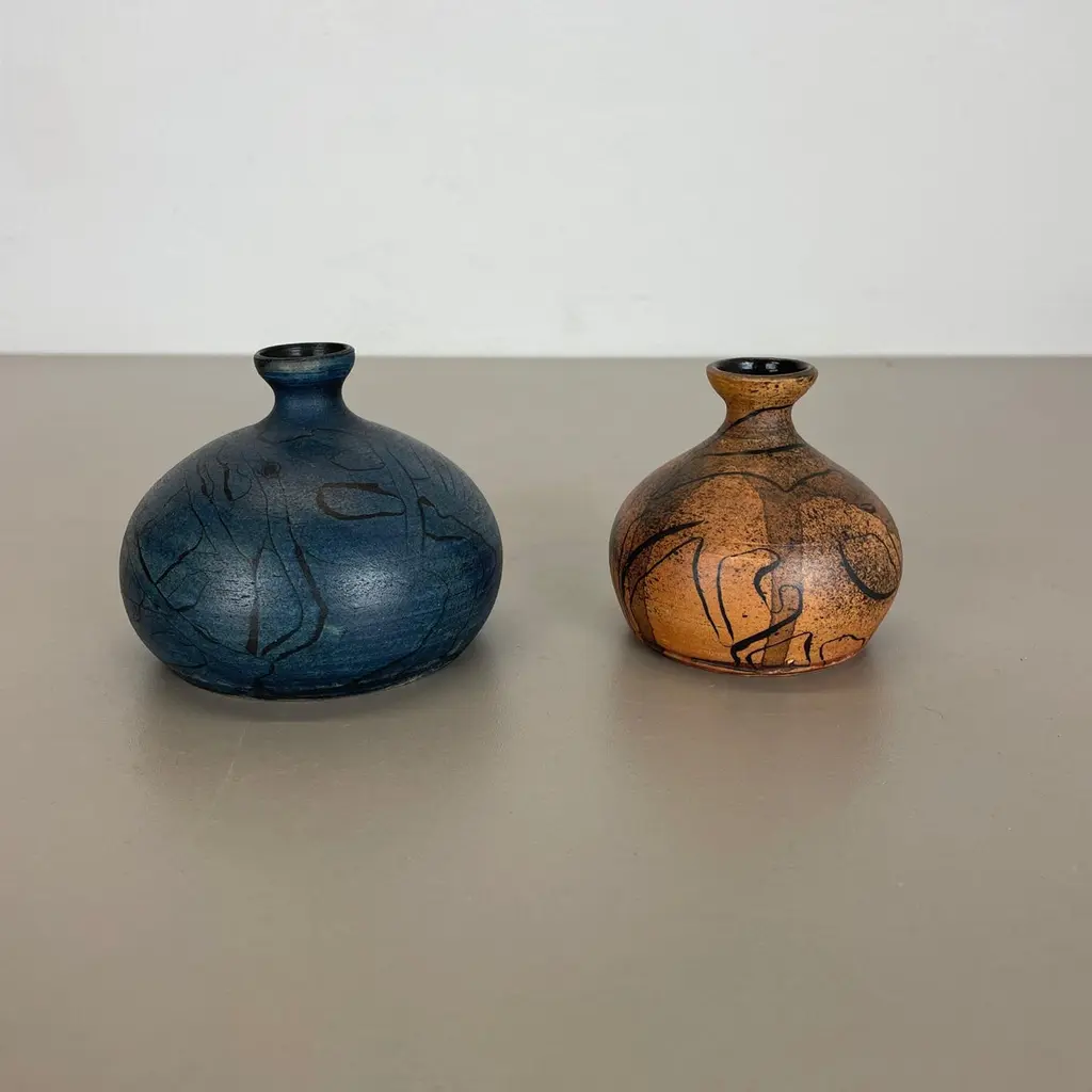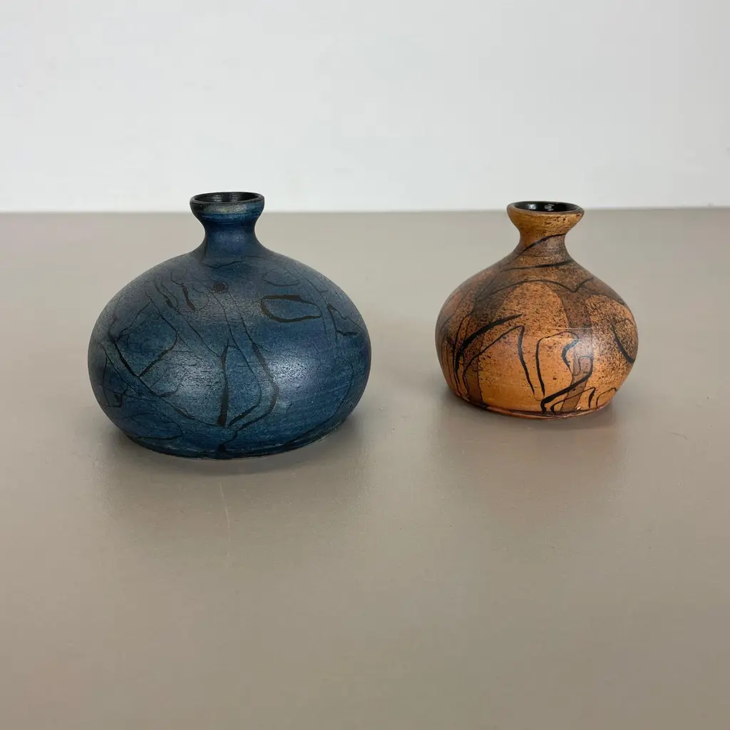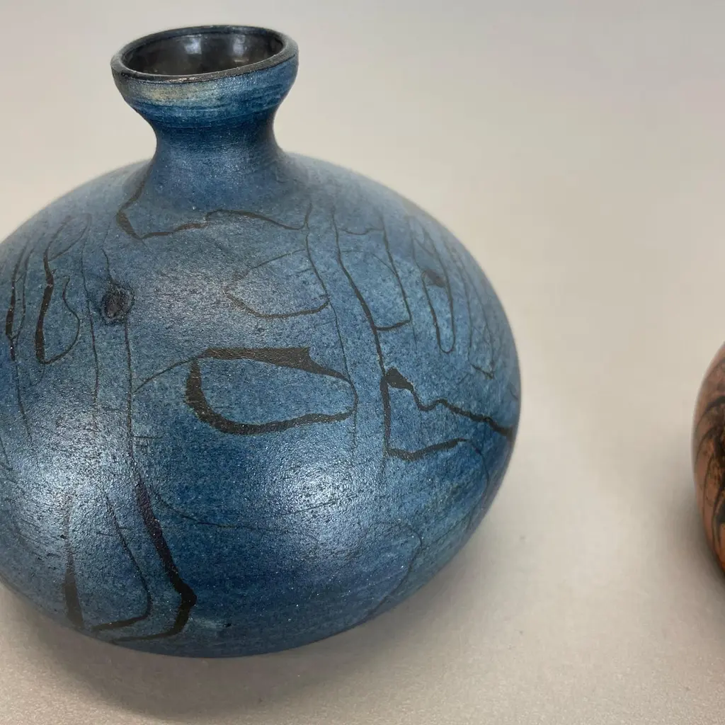 Article:Ceramic stoneware object set of 2Designer and producer:Gerhard LiebenthronInformation:Gerhard Liebenthron, Bremen1925-2005Decade:1970s and 1980sThis original vintage Studio Pottery Object was designed by Gerhard Liebenthron and produced in his own Studio in the 1980s in Bremen Germany. It is made of stoneware pottery ceramic and has a very unique brown, black and blue, black coloration and surface structure. The bottom is marked with typical Liebenthron Producer signature GL and year signature 82 and 84. Very collectible and very rare items of the Liebenthron Collection. Both vases have a very special and unique surface coloration, one of a kind handmade product and very collectible.Straightforward and minimalistic design of the 70s and 80s design era. This item is a wonderful addition to every modern home.Dimensions:Left:Height 9cmDiameter 11cm.Right.Height 8cmDiameter 8cm.Condition:This item is in a very good vintage condition with patina.VITA Liebenthron: From 1945-1951 Liebenthron studied at the Staatliche Kunstschule Bremen (school of arts) in the pottery class of Else Krieg & Dorothea Colberg-Tjadens. In 1951 Liebenthron has been the Assistent of the scultpor Prof. Goersemann there.After Liebenthron finished his time at the Kunstschule he opened his own workshop in the Boettcherstraße, Bremen (in 1952).Gerhard Liebenthron's work can be found in several museums in Germany. The Keramik Museum in Berlin, the Fockemuseum in Bremen and the Hetiens Museum in Düsseldorf for example. He has been a member of the Arbeitsgemeinschaft Kunsthandwerk Bremen.Lit: Keramik Gerhard Liebenthron, Gerhard Liebenthron und Fockemuseum Bremen, Bremen, 1968.