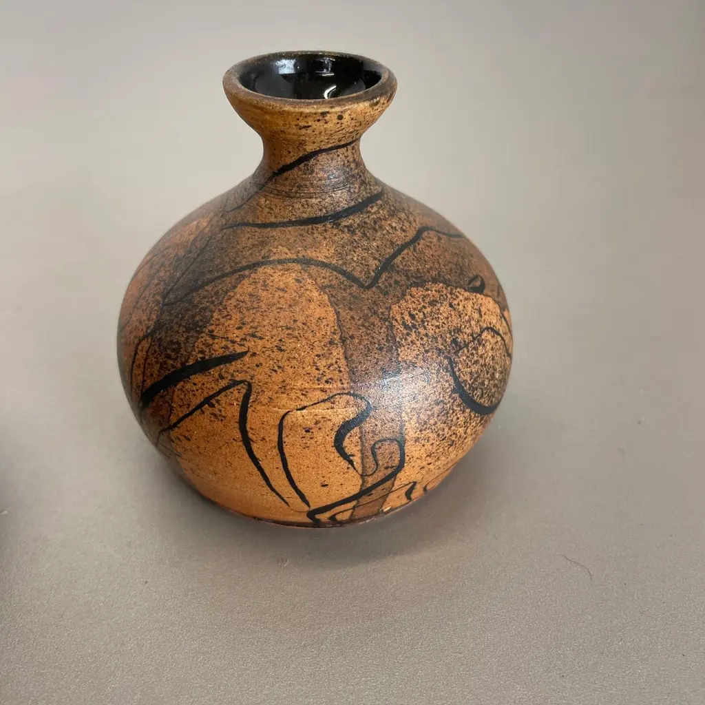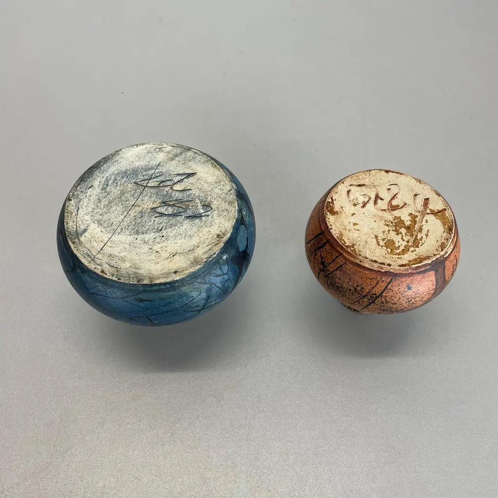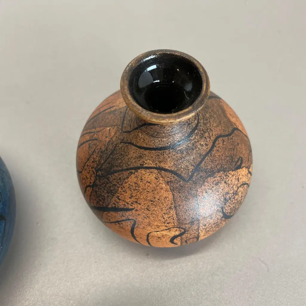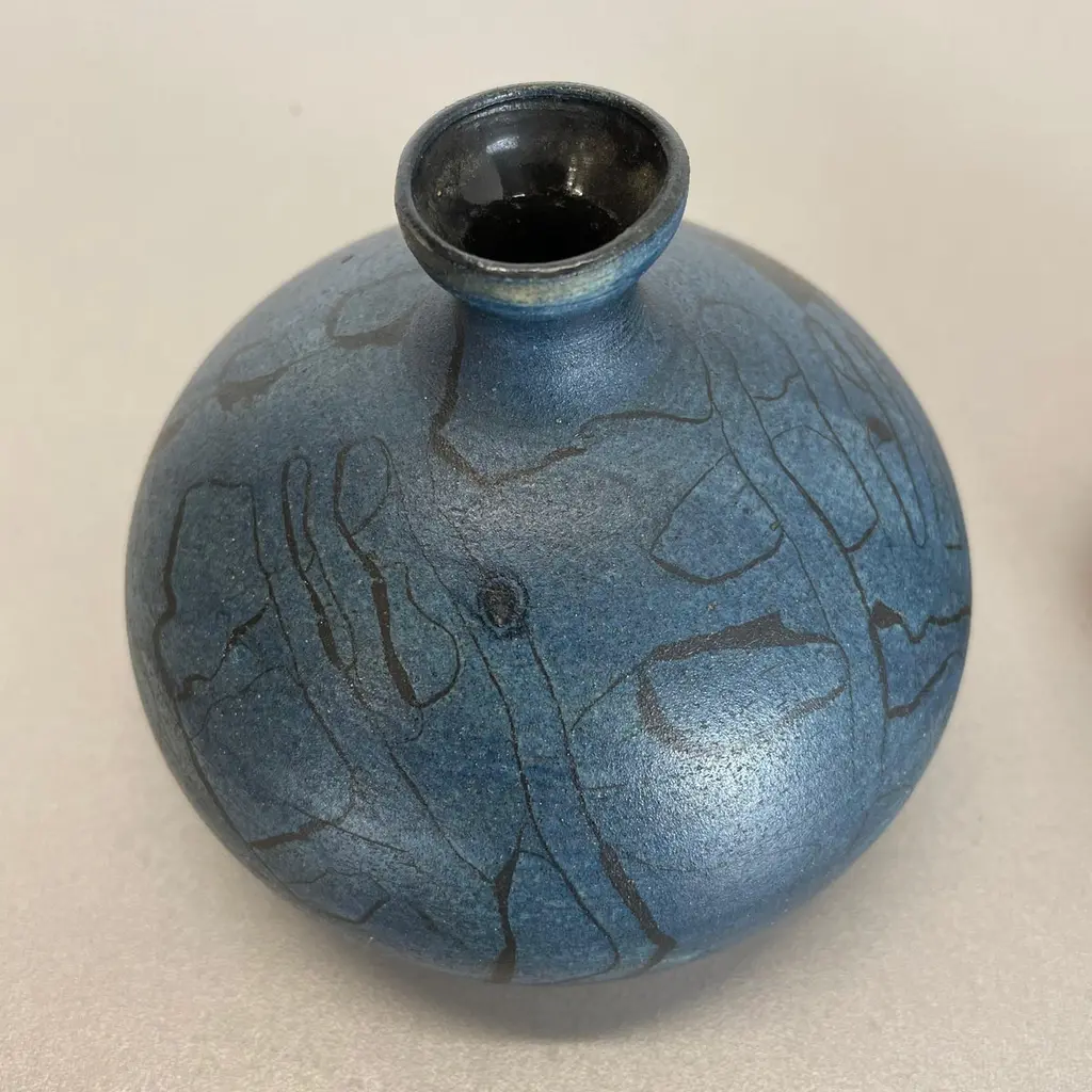 Article:Ceramic stoneware object set of 2Designer and producer:Gerhard LiebenthronInformation:Gerhard Liebenthron, Bremen1925-2005Decade:1970s and 1980sThis original vintage Studio Pottery Object was designed by Gerhard Liebenthron and produced in his own Studio in the 1980s in Bremen Germany. It is made of stoneware pottery ceramic and has a very unique brown, black and blue, black coloration and surface structure. The bottom is marked with typical Liebenthron Producer signature GL and year signature 82 and 84. Very collectible and very rare items of the Liebenthron Collection. Both vases have a very special and unique surface coloration, one of a kind handmade product and very collectible.Straightforward and minimalistic design of the 70s and 80s design era. This item is a wonderful addition to every modern home.Dimensions:Left:Height 9cmDiameter 11cm.Right.Height 8cmDiameter 8cm.Condition:This item is in a very good vintage condition with patina.VITA Liebenthron: From 1945-1951 Liebenthron studied at the Staatliche Kunstschule Bremen (school of arts) in the pottery class of Else Krieg & Dorothea Colberg-Tjadens. In 1951 Liebenthron has been the Assistent of the scultpor Prof. Goersemann there.After Liebenthron finished his time at the Kunstschule he opened his own workshop in the Boettcherstraße, Bremen (in 1952).Gerhard Liebenthron's work can be found in several museums in Germany. The Keramik Museum in Berlin, the Fockemuseum in Bremen and the Hetiens Museum in Düsseldorf for example. He has been a member of the Arbeitsgemeinschaft Kunsthandwerk Bremen.Lit: Keramik Gerhard Liebenthron, Gerhard Liebenthron und Fockemuseum Bremen, Bremen, 1968.