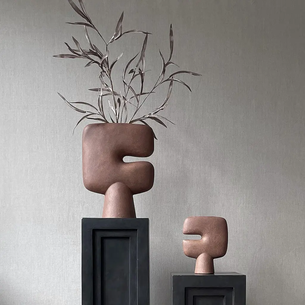 A set of 2 dark grey Tribal vase big by 101 CopenhagenDesigned by Kristian Sofus Hansen & Tommy HyldahlDimensions: L 34 / W 14 / H 45 CMMaterials: CeramicThe Tribal collection is a series of vases designed as a sculptural take on the archetypal idea of a tribal mask. Place single flower stems in the narrow top opening or simply leave the vase as a stand-alone art object. Like open mouths on pedestals, the masks are a beautiful, shaped item in calm, soothing and dusty terracotta and grey colours. As it is a hand-glazed natural product, the colours may vary slightly and while it is not 100% waterproof, a bag for fresh flowers is included. 101 Copenhagen is a Danish design brand founded in 2017. With a vision to honor exquisite quality and craftsmanship, the collection encompasses furniture, lighting and accessories in a timeless, yet modern design. With a true passion for materials and refined textures, organic shapes and colours, 101 Copenhagen presents the epitome of classics and must-have novelties for Scandinavian and international interior connoisseurs alike.