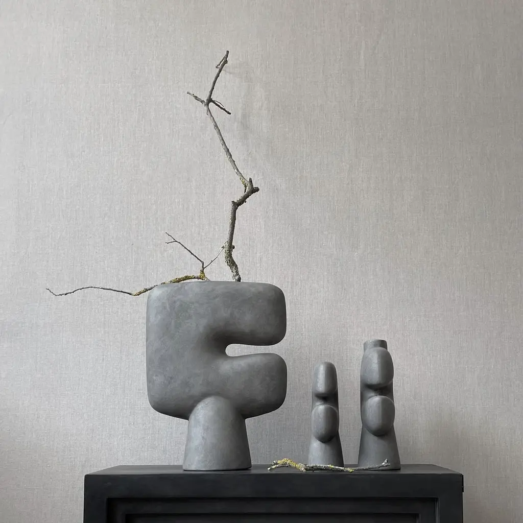 A Set of 2 Dark Grey Tribal vase Medio by 101 CopenhagenDesigned by Kristian Sofus Hansen & Tommy HyldahlDimensions: L24 / W10 / H30 CMMaterials: CeramicThe Tribal collection is a series of vases designed as a sculptural take on the archetypal idea of a tribal mask. Place single flower stems in the narrow top opening or simply leave the vase as a stand-alone art object. Like open mouths on pedestals, the masks are a beautiful, shaped item in calm, soothing and dusty terracotta and grey colours. As it is a hand-glazed natural product, the colours may vary slightly and while it is not 100% waterproof, a bag for fresh flowers is included. 101 Copenhagen is a Danish design brand founded in 2017. With a vision to honor exquisite quality and craftsmanship, the collection encompasses furniture, lighting and accessories in a timeless, yet modern design. With a true passion for materials and refined textures, organic shapes and colours, 101 Copenhagen presents the epitome of classics and must-have novelties for Scandinavian and international interior connoisseurs alike.