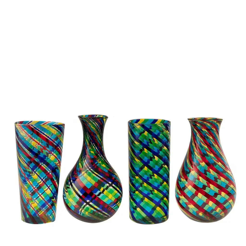This couple of vases handcrafted with Murano glass are made with the technique of filigree, which consists in combining glass sticks of different colors. The composition of colors of this set is amethyst, topaz, pink, yellow and aventurine, that with the right illumination create beautiful play of colors, almost optical illusions.