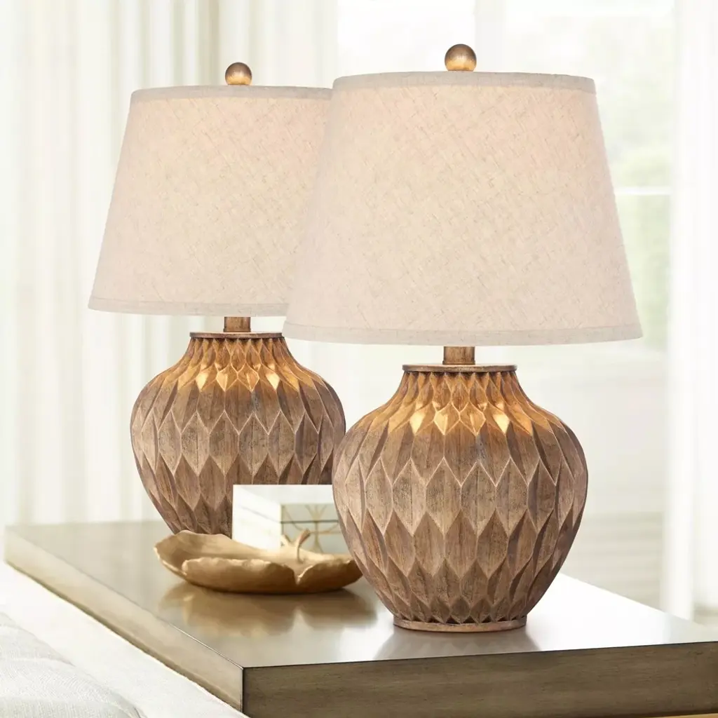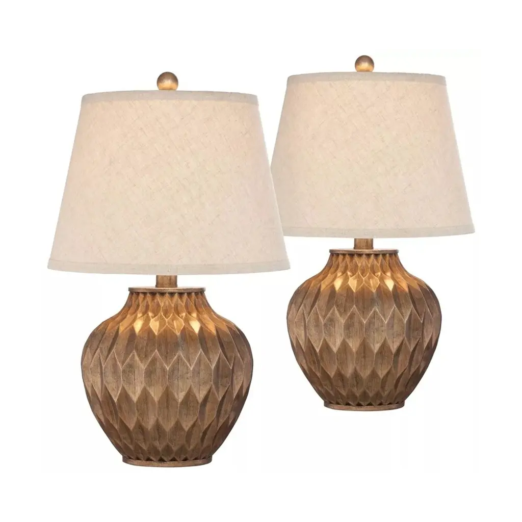 PRODUCT DETAILS: Set of 2 lamps. Each is 22" high overall. Bottom bases are 5" wide. Shades are 10" wide at the top x 14" wide at the bottom x 10 1/4" high. Each uses one maximum 150 watt standard base bulb (not included). On-off switch on socket. Set of two Buckhead small urn accent table lamps with indent patterned bodies. Modern warm bronze finish lamp bases with a textured, geometric pattern. Cast resin construction. Tapered off-white fabric drum shades with bronze finish finials. 8-foot long brown cord.