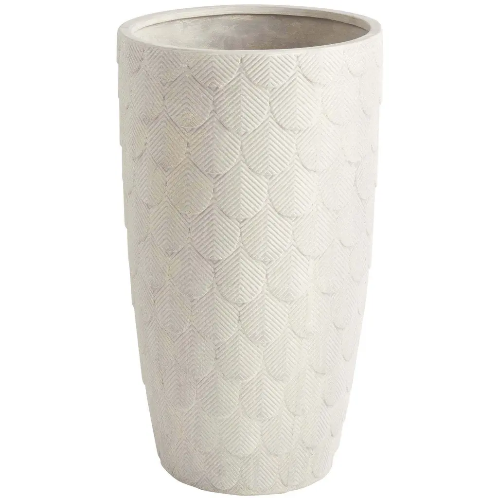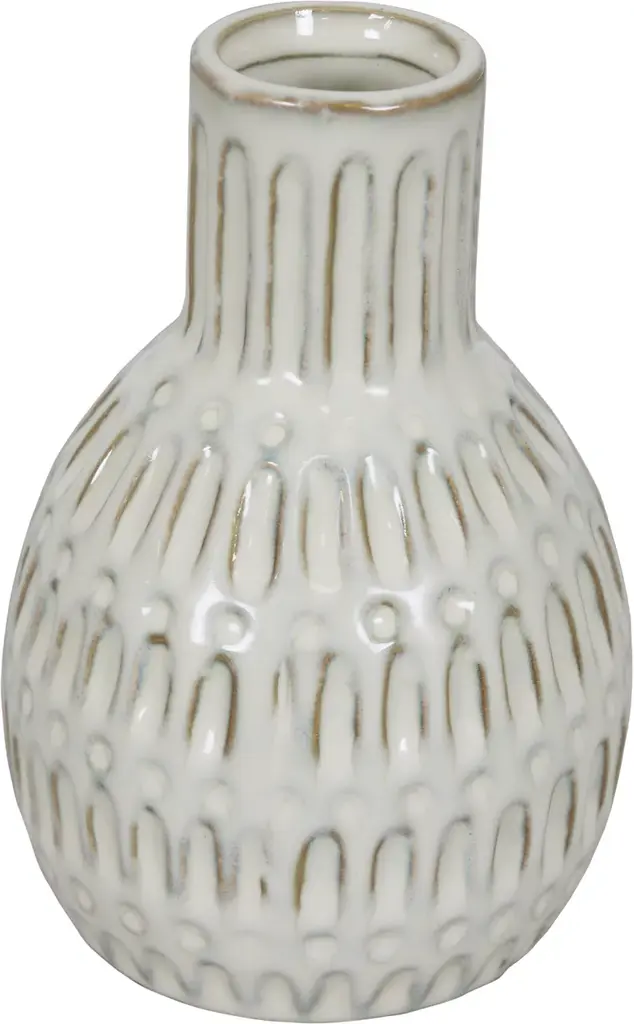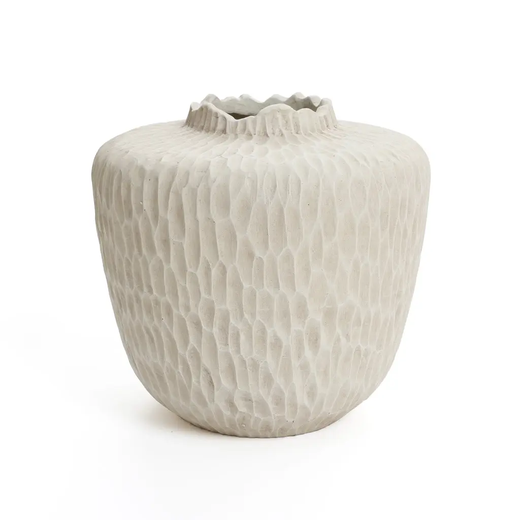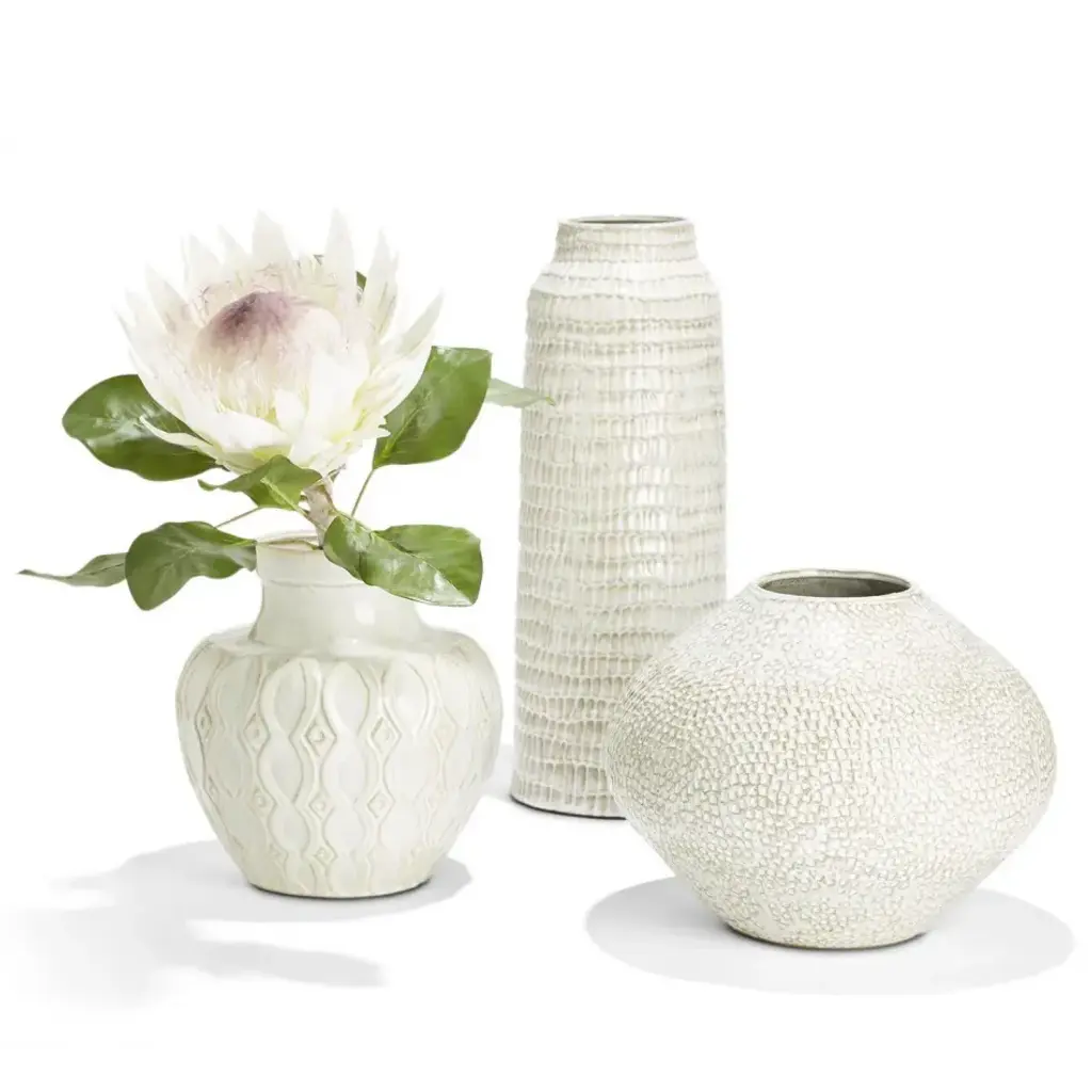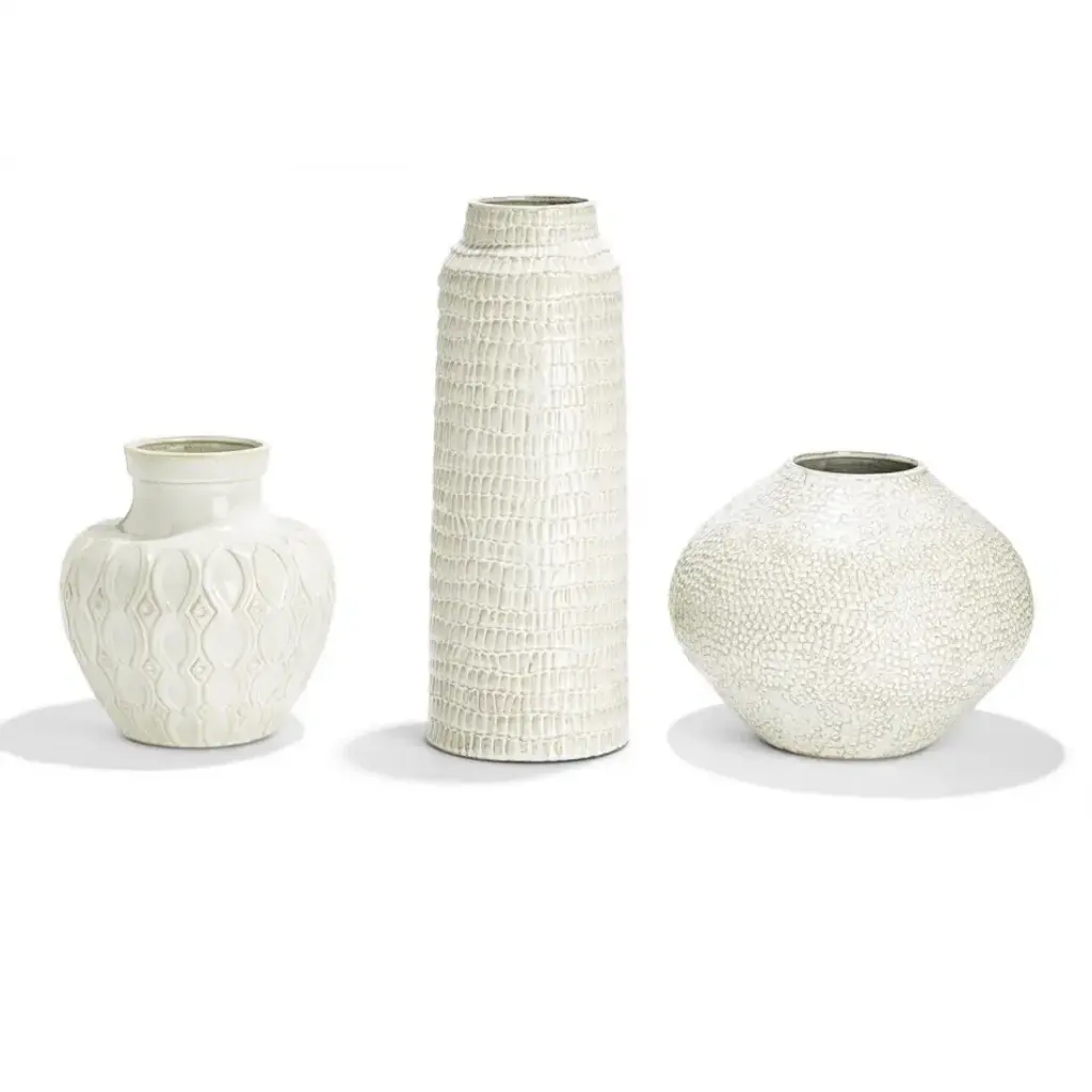 These beige ceramic vases are intricately carved with a tone on tone pattern. The subtleness to this pattern create texture while maintaining a neutral elegance that could find its home in any room.