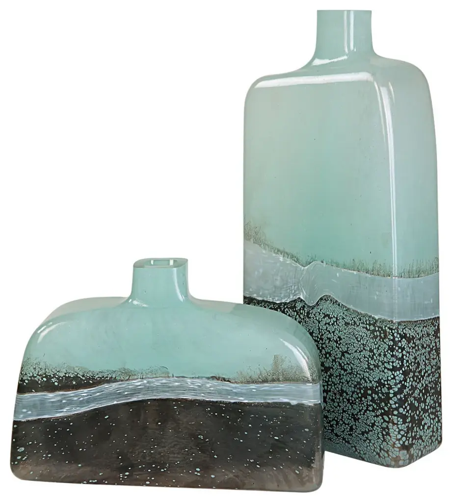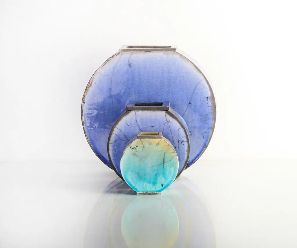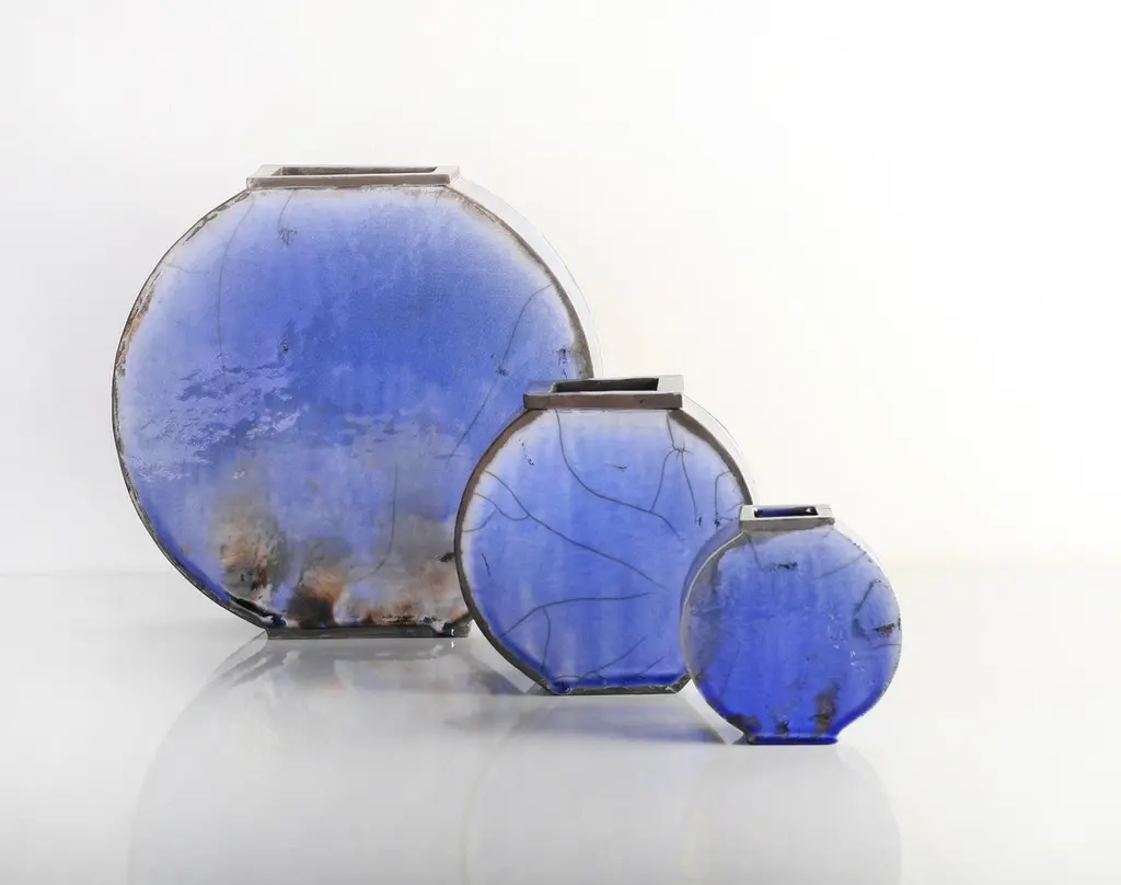Set of 3 blue vases by Doa CeramicsDimensions: Small 3.5" (in)Medium 8" (in)Large: 12" (in)Materials: Ceramic. Technique: Hand-crafted. Freeform. Glazed.