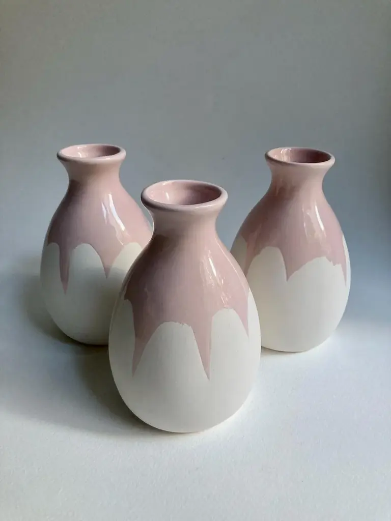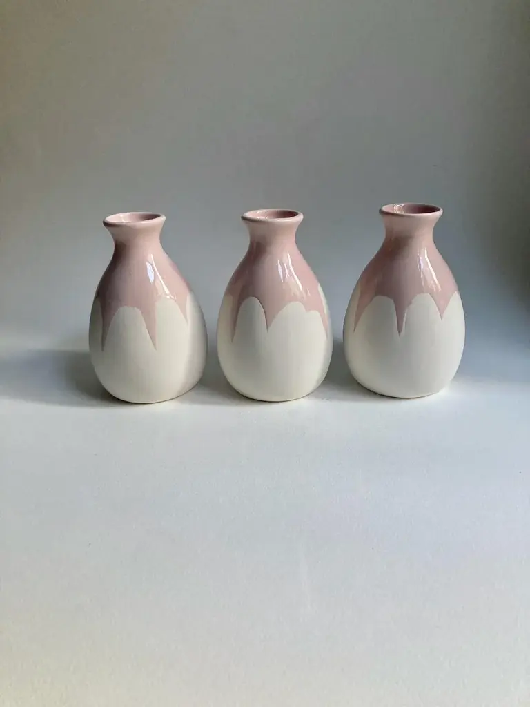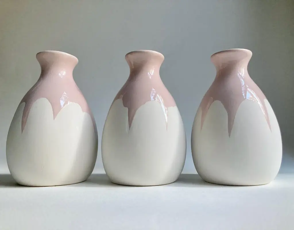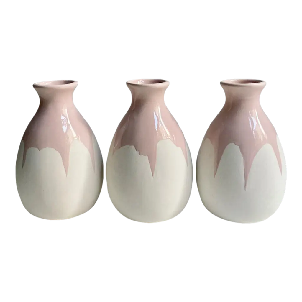 Set of Three handcrafted Isaac Mizrahi Off White & Pink Drip Glaze Ceramic Vases. Featuring a Isaac Mizrahi, Loves XO, Sienna collaboration with three themed Art Pottery Vases in Off White Ceramic with reflective hand dipped glazed Pale Pink drip accents to top. Perfect for Greenery. Rooting. Flowers. With original boxes. Label to underside Thank you for shopping!