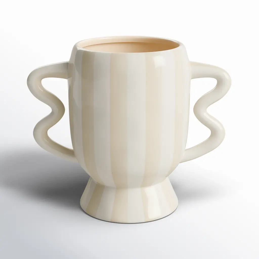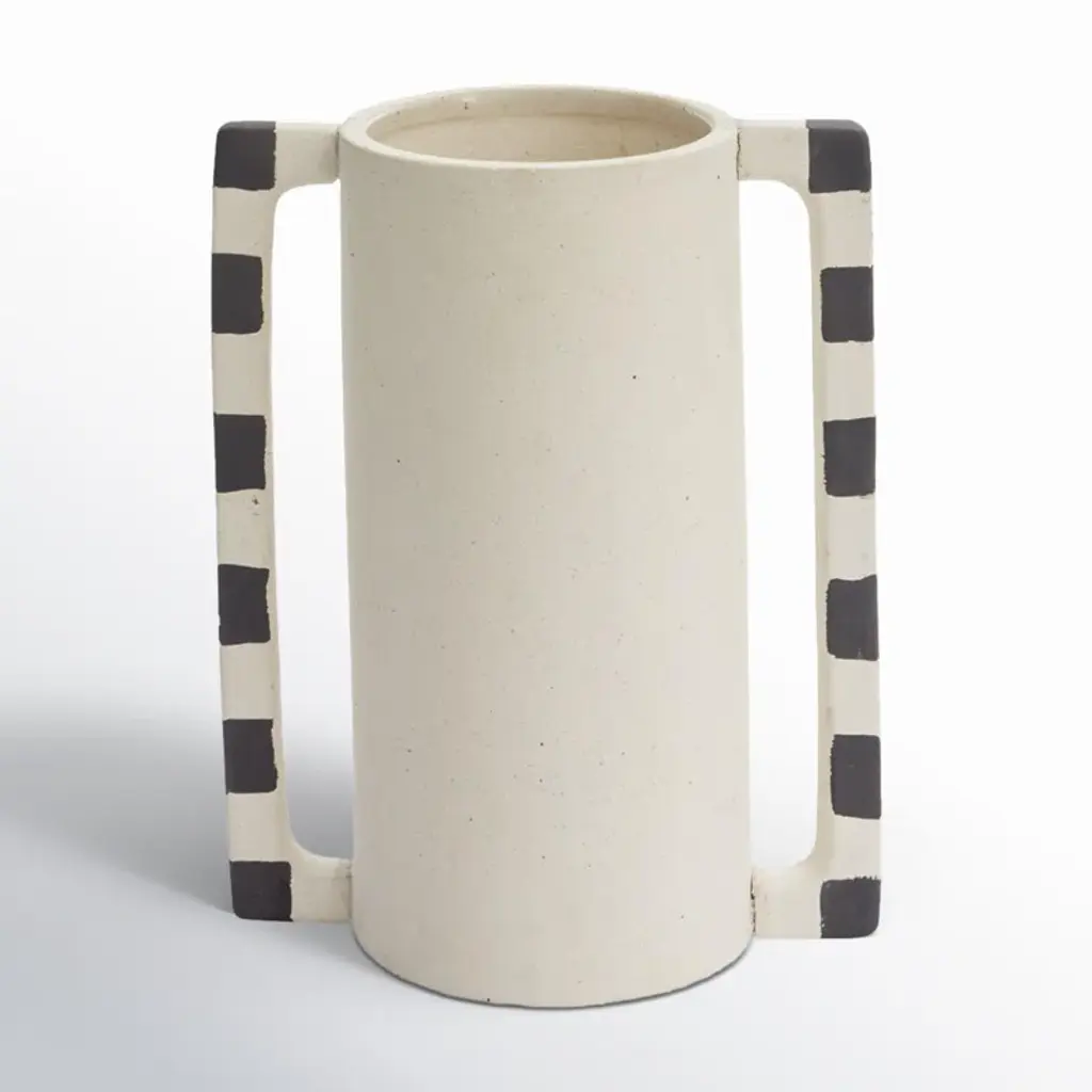The splendid result of the partnership between Fratelli Colì and Kiasmo, this set of three vases with handles combines aesthetic and functionality, traditional crafting techniques, and modern flair. Entirely fashioned of ceramic, each vase is painted by expert hands showcasing a black and white geometric decorative motif.