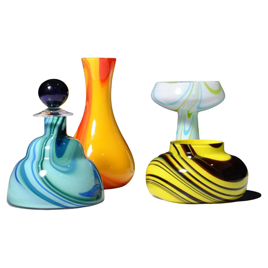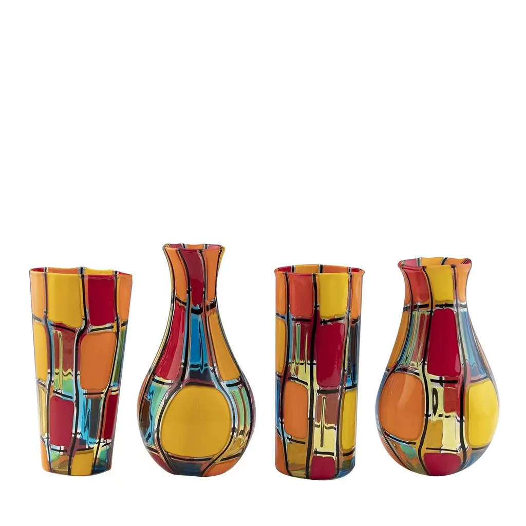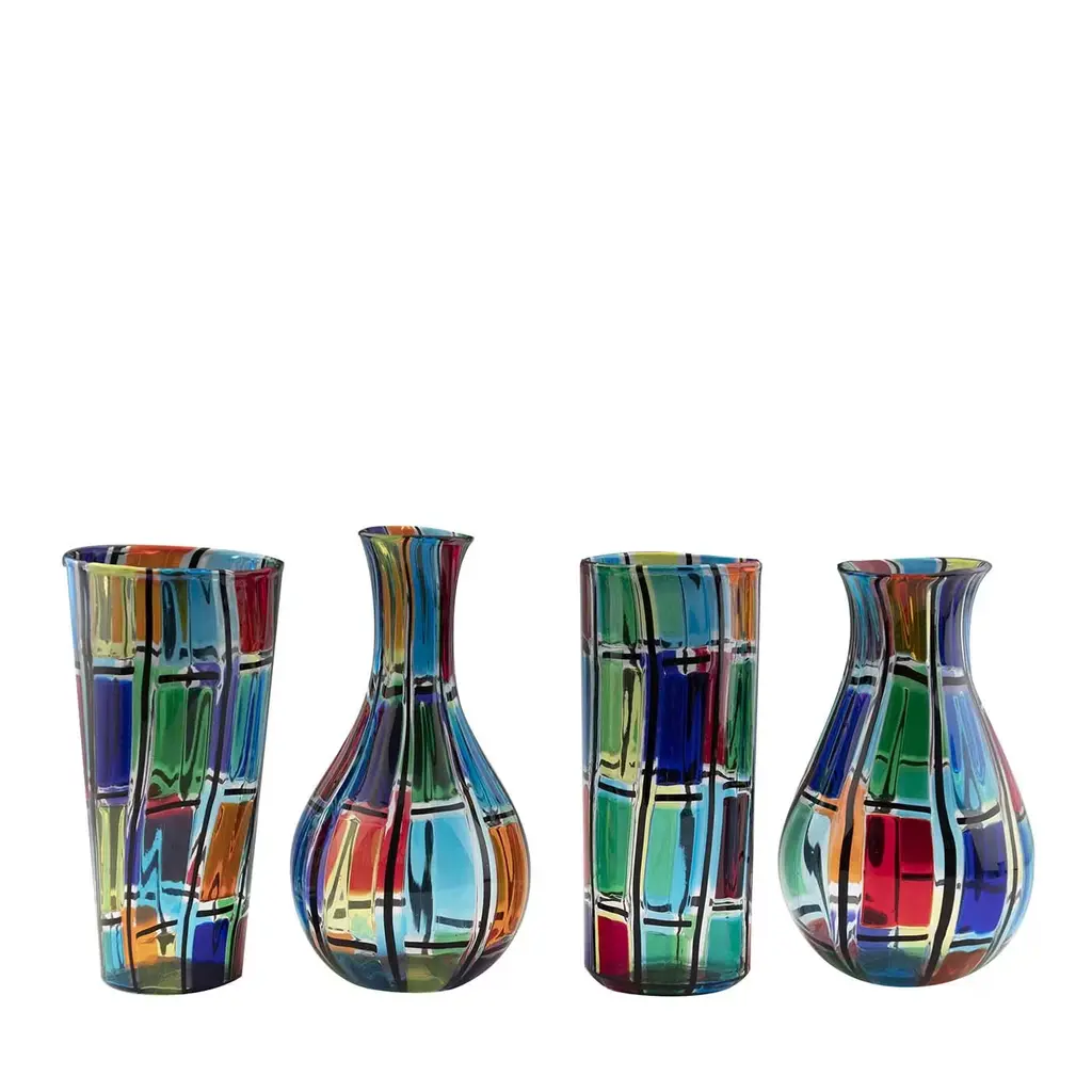 The striking combination of colors that characterizes this set of 4 collectible Filigree Vases will be the highlight of any contemporary setting. Handmade in Murano glass by Angelo Ballarin, these beautiful objects take their name from the filigree technique which consists of placing together glass strips in various colors. With the right lighting, they create a fabulous display.
