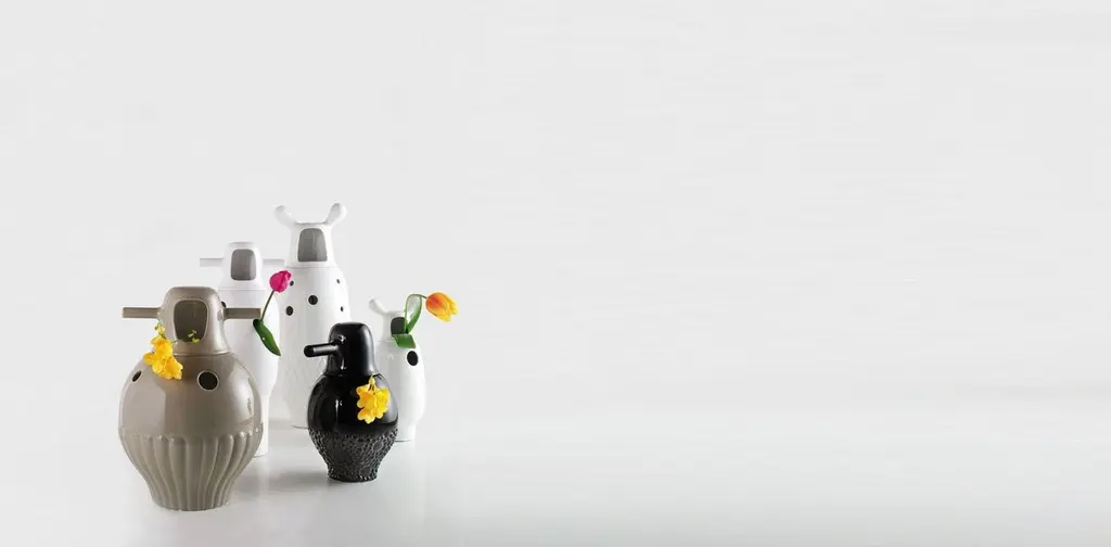 Set of showtime vases by Jaime Hayon Dimensions: D 19 x H 33, D 31 x H 34, D 27 x H 47, D 21 x H 48, D 23 x 59 cmMaterials: Made in two pieces in enameled stoneware porcelain; monocolour (interior and external in white) or bicolor (interior in white and external in different colors, according to the model).Also available in two other designs.They are little decorative sculptures that fully reproduce Hayon’s universe. The Showtime Vases are just as current as when we launched them over 10 years ago.In 1972, a group of young architects and designers from Barcelona created BD with the aim of producing and marketing furniture and other objects for our projects, with complete creative freedom and with a criterion that has turned out to be quite different from the norm at companies in the sector, regarding both the shape and function.