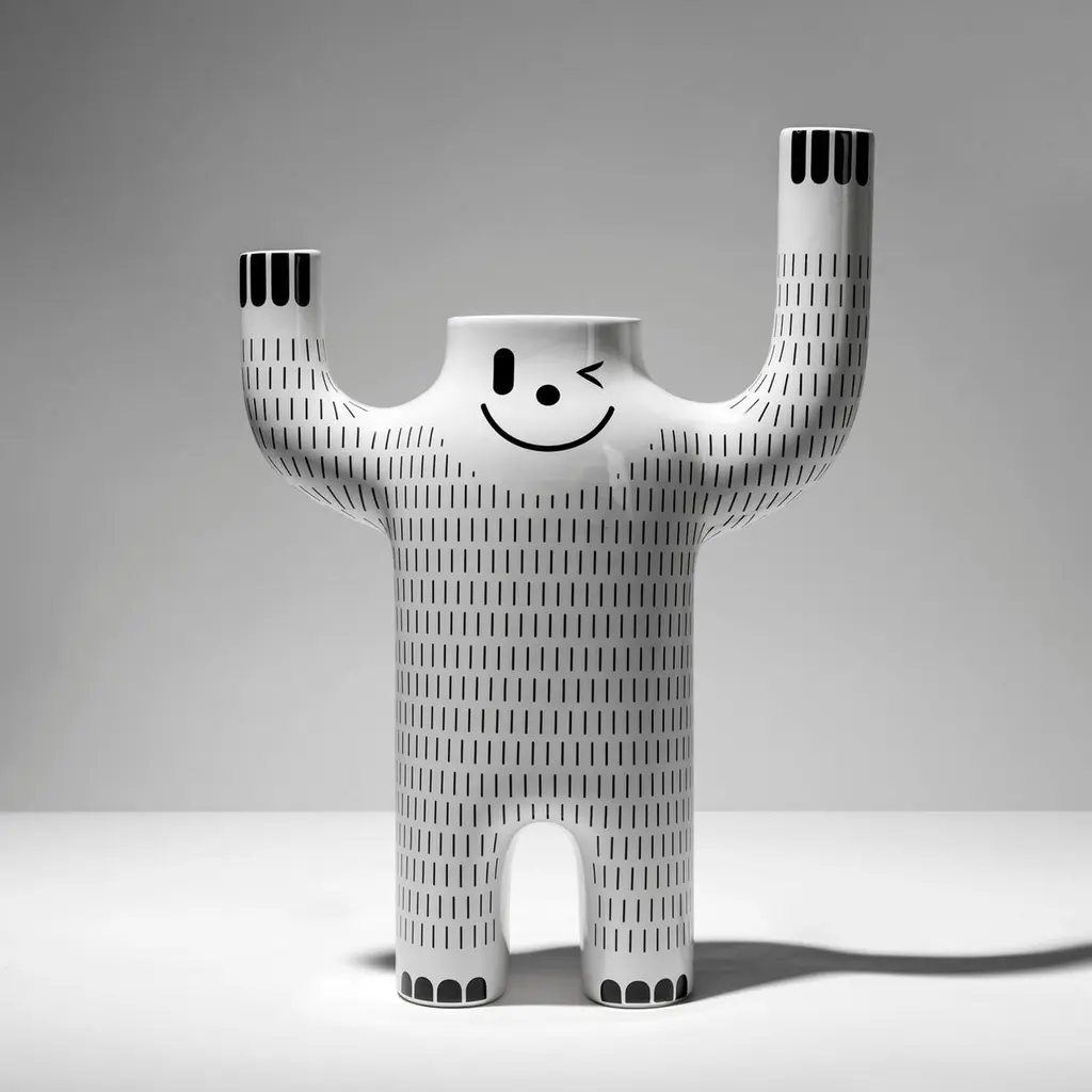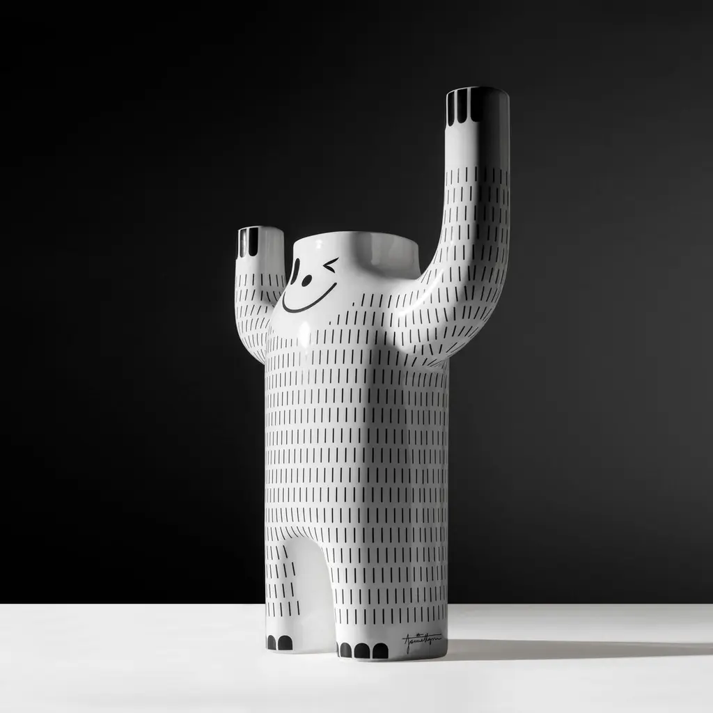 Contemporary happy yeti by Jaime Hayon.Manufactured by BD Barcelona (Spain).Glazed ceramic vase in white with decorations in black.Measures: 14 D x 33 W x 47 H cm10 D x 24 W x 34 H cm.