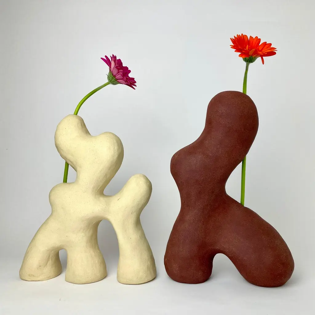 Set of sculptural vases by HS Studio.Surreal Real Collection.Dimensions: 22 x 18 x 8cm, 25 x 18 x 9cm.Materials: Ceramic.Hannah Simpson is a ceramic artist, based in Kent, UK. With a passion for creating unique items, Hannah's work continues to challenge the line between art and design.Hannah graduated from Loughborough University in 2019 with a 1st Class Honours in Fine Art. During her time at university, Hannah opted to take part in an industrial placement year where she interned in Eindhoven, Netherlands for designer Nacho Carbonell. Whilst on this internship Hannah developed a passion for functional art work and began combining ideas from her knowledge of art and philosophy with design to create biomorphic sculptures that often resemble mystical creatures.For the past year Hannah has continued to develop her work to combine functional design with fine art. Hannah’s work is inspired by religion, myth and instinctive thoughts, with particular focus on the relationship between order and chaos. She creates sculptures that change how a space is used, allowing the viewer to remove themselves from reality and instead be surrounded by surreal objects that can evoke imagination and emotion.