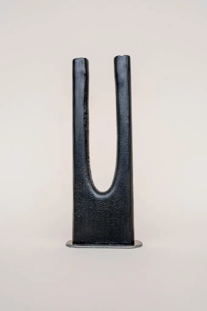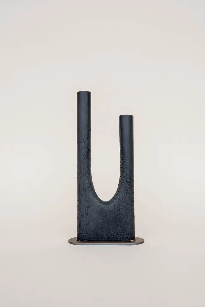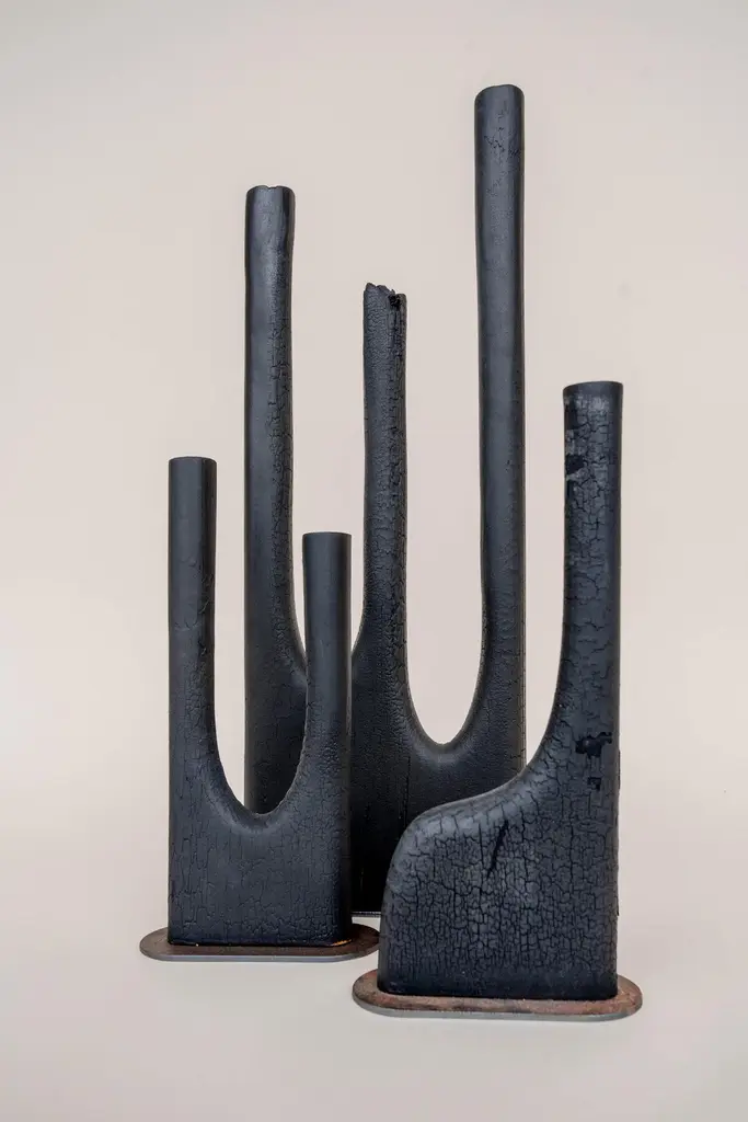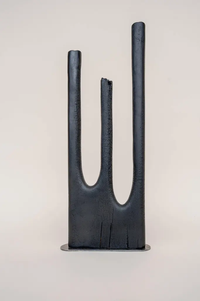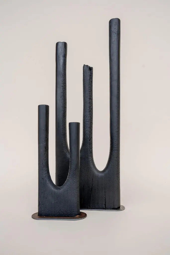 Set of Trio Vase and Dou Vase by Daniel ElkayamDimensions: D 2.5 x W 16 x H 46 cm (Trio), D 2.5 x W 10 x H 39 cm (Dou)Materials: Burnt beech woodJerusalem-born Art-designer and Photographer based in Tel-Aviv. Operating in the field of sustainable home decor and specializing in conceptual design, material exploring, and story-telling through objects. Graduated in 2019 his Bachelor's studies at the Industrial design department at Bezalel Academy of Arts and Design, Jerusalem. A former member of the Bezalel Alumni Design Incubator 2020. Won the excellent scholarship of America-Israel cultural foundation of 2019 Inspired by nature and its phenomenons, the artist transforms natural materials and aesthetics into one-of-a-kind unique objects. In his works, Daniel implements his curiosity and yearning for unrefined aesthetics, and by material transformation and unique techniques he is developing in his studio, he shows how unattractive materials can be not only valid but luxurious. Elkayam examines the range between art and design by taking things in and out of their context, creating hybrids between different worlds of content, intervening in natural processes, while leaving a gap for the unexpected, the unknown. He expresses his inner world and illustrates his ideas by creating objects and experiences. Through his perspective of materiality, and empathetic vision of his surroundings, he developed an intuitive way of creation with experimental materials such as algae, corrosion, charcoal, and more. Every collection of objects expresses different material research and follows curious narratives and a variety of topics such as locality, transience, and decay of materials. THE CHARRED COLLECTION: A collection of handmade wooden objects inspired by one of the most powerful natural phenomena in our world, which is out of control. Today the percentage of fires caused by natural causes is significantly lower than those caused by humans. The huge fires quickly deplete the forests, leaving behind a particularly surrealistic view of a burnt, black piece of nature. Out of interest in this show was created the desire to preserve the unique aesthetics of the burnt wood and to express in objects the feelings and questions it raises as a raw material in itself. The same scorched aesthetic combined with everyday objects, on the one hand, serves as a mirror for the consequences of the situation we have created and as a means of dealing with its ecological results, and on the other hand, as a visual echo of fire intensity and aesthetic effects.
