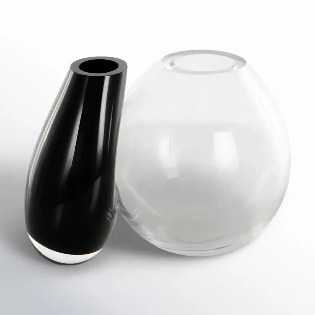 Striking in its minimalism, the Set of Two Murano Colored Glass Vases – Smoky Black Teardrop Core offers a contemporary twist on classic Murano glass artistry. Hand-blown in Italy, each vase features a sleek teardrop form with a smoky black interior core suspended inside a crystal-clear glass shell. The contrasting tones and clean lines give these pieces a sculptural presence, while their varied heights create elegant balance. Perfect styled together or separately, these vases bring a refined, modern sensibility to coffee tables, consoles, or shelving.