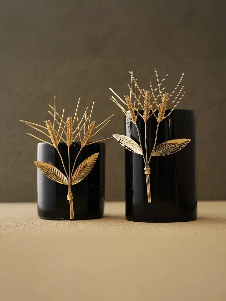 Elevate your decor with these striking vases that blend the bold sophistication of polished black marble with the delicate shimmer of hand-crafted brass wheat motifs. The sculptural brass sheaves stand out against the dark, reflective marble, adding organic texture and natural elegance to your space. Whether used to hold minimalist floral stems or left as sculptural focal points, these vases bring a refined, timeless quality to any room.