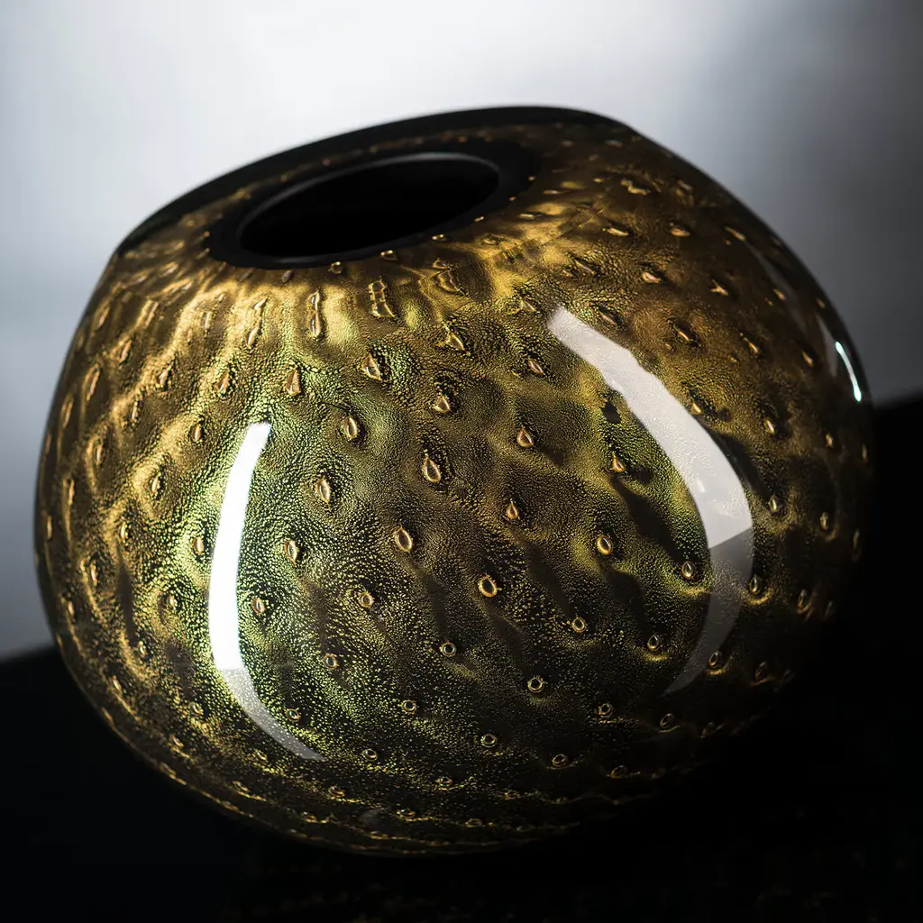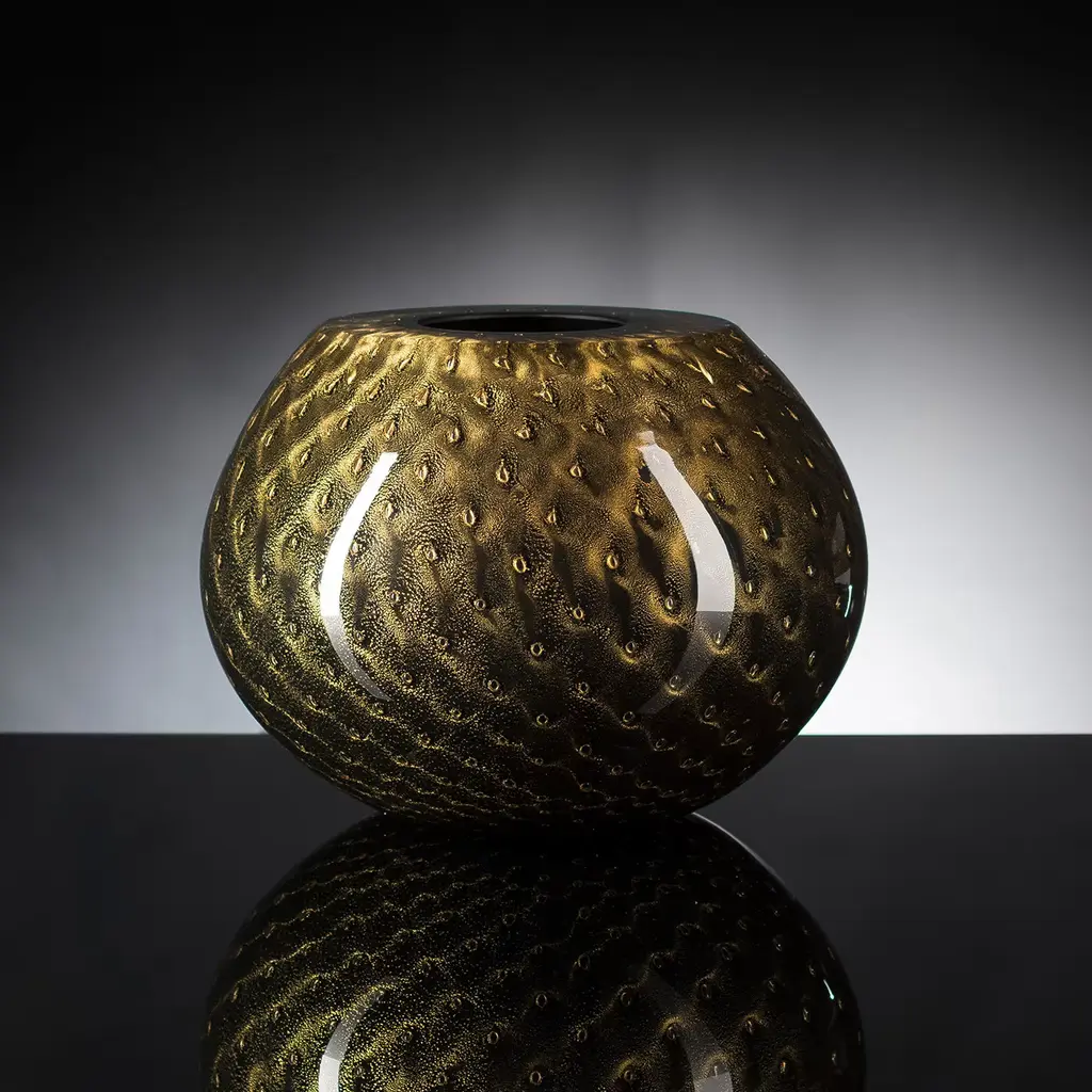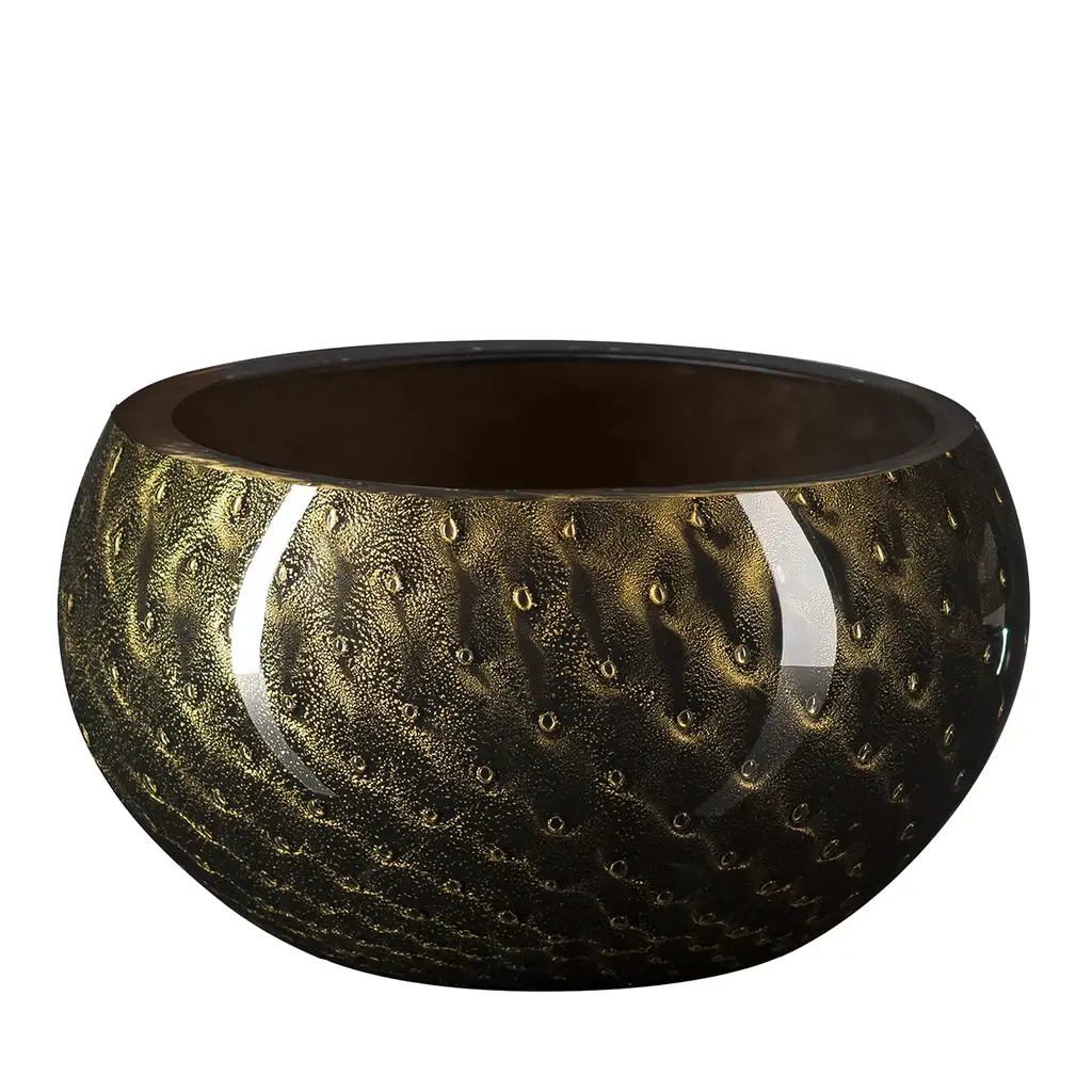 Showcasing a smooth, curved profile expertly mouthblown from thick Murano glass enhanced with a bronze hue and small circles embedded in the black-colored glass. This extraordinary example of world-renowned Italian glassmaking tradition has a polished, flat rim and a luminous charm that will add a chic finishing touch to your curated interiors. Due to the traditional crafting process, air bubbles and slight imperfections from the pictured item can occur.