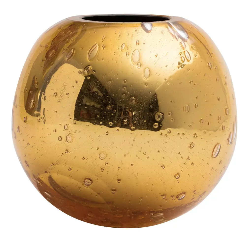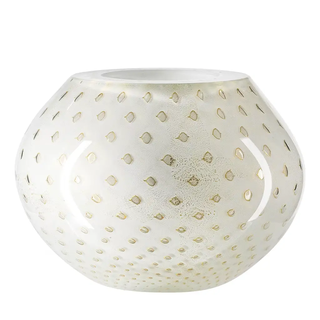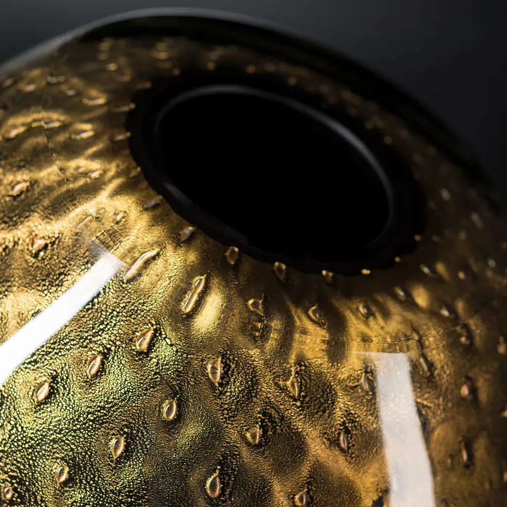 Showcasing a smooth, curved profile expertly mouthblown from thick Murano glass enhanced with a bronze hue and small circles embedded in the black-colored glass. This extraordinary example of world-renowned Italian glassmaking tradition has a polished, flat rim and a luminous charm that will add a chic finishing touch to your curated interiors. Due to the traditional crafting process, air bubbles and slight imperfections from the pictured item can occur.