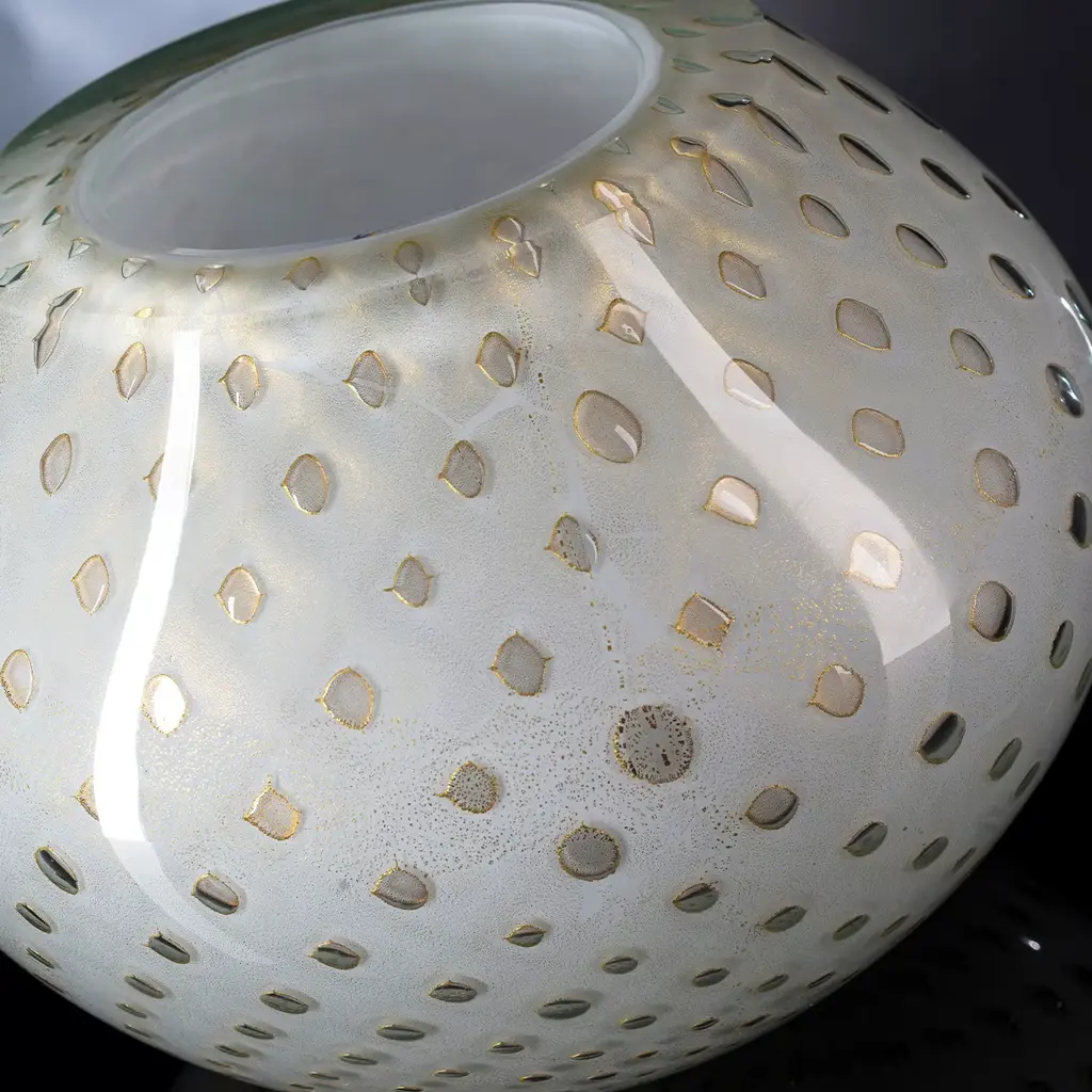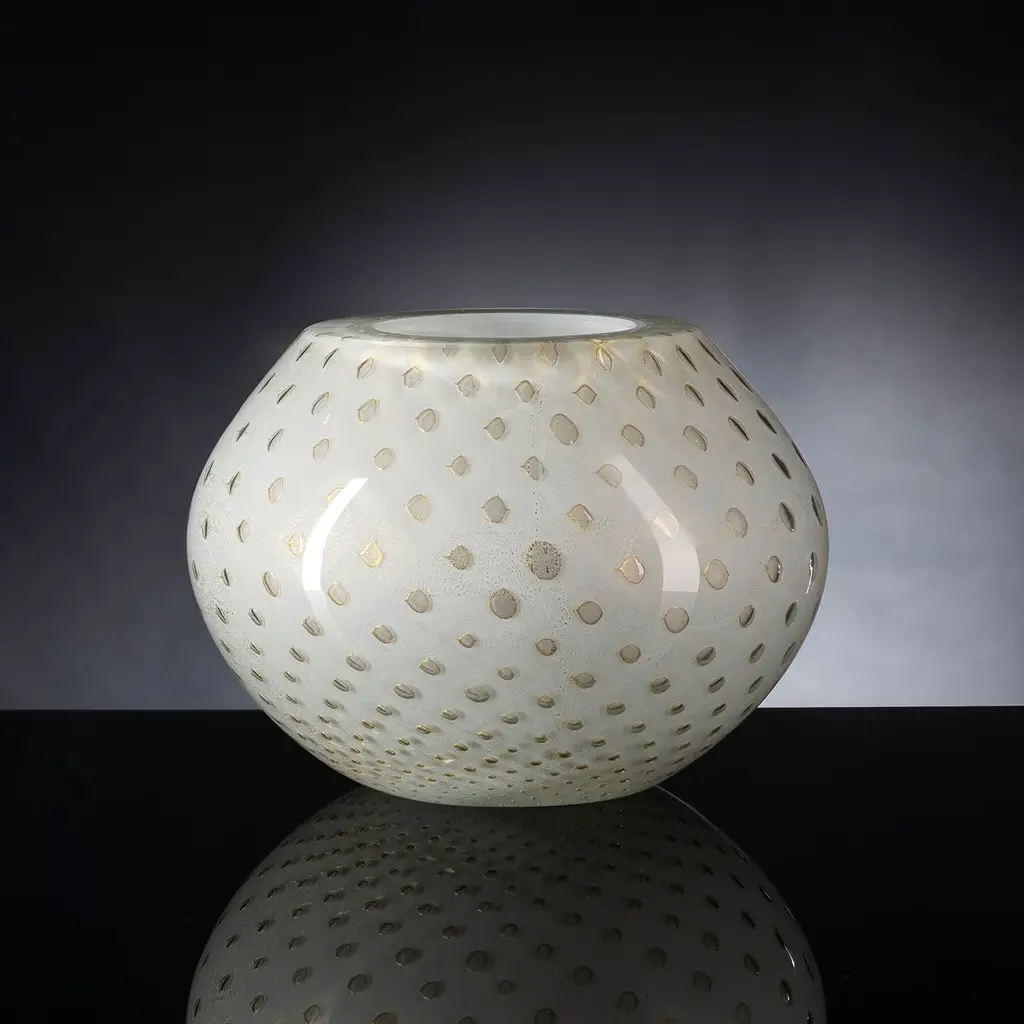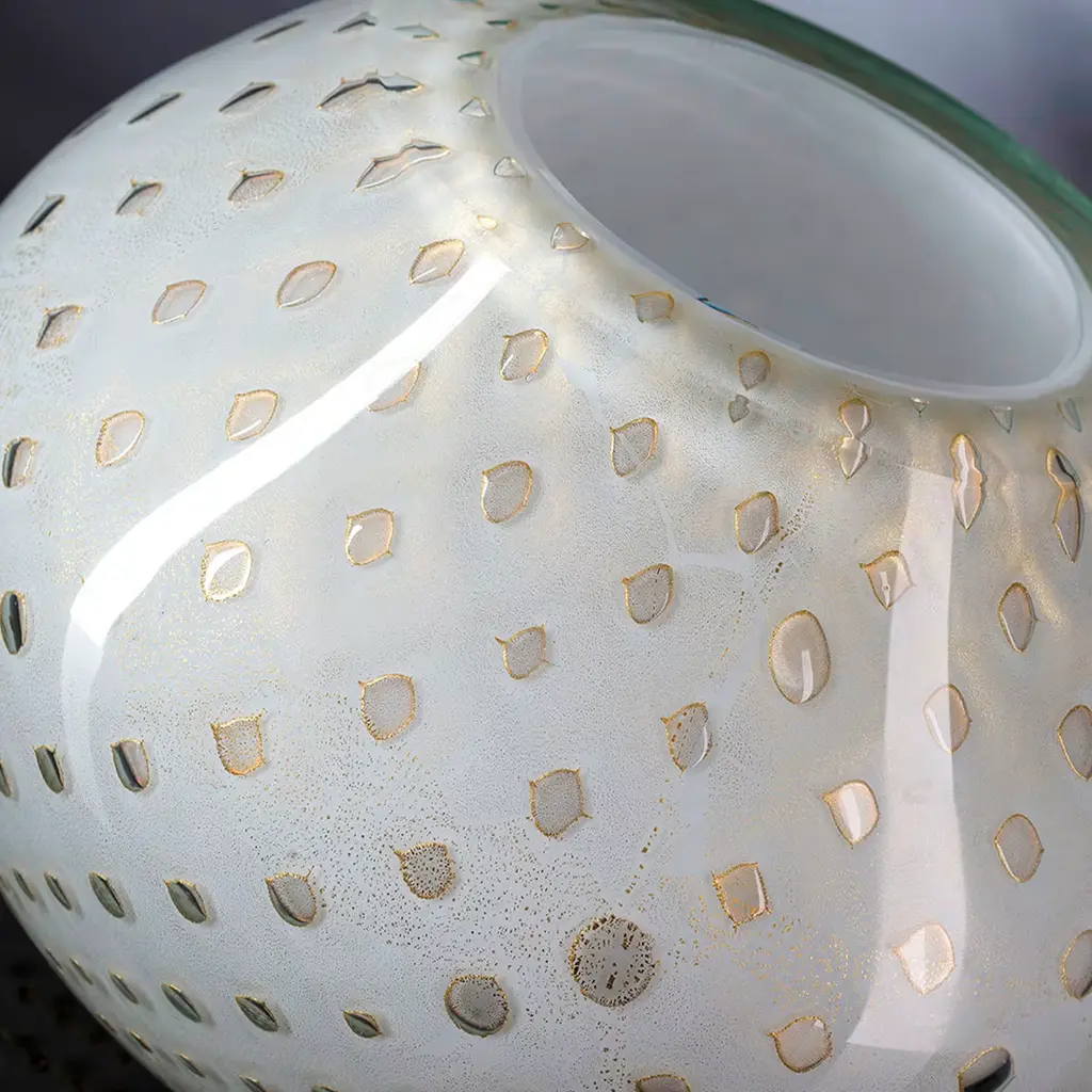 As a standalone accent or part of an elegant display, this vase will add a chic finishing touch to any home. The smooth, curved profile is expertly mouth-blown of white Murano glass, interspersed with small gold-rimmed droplets. Perfect for showcasing your favorite blooms, this vase will make for a well-received wedding gift.