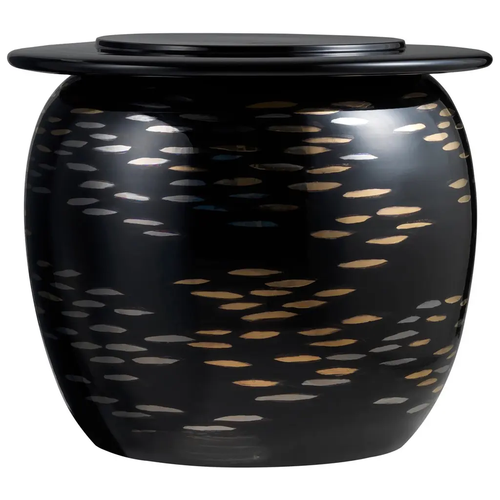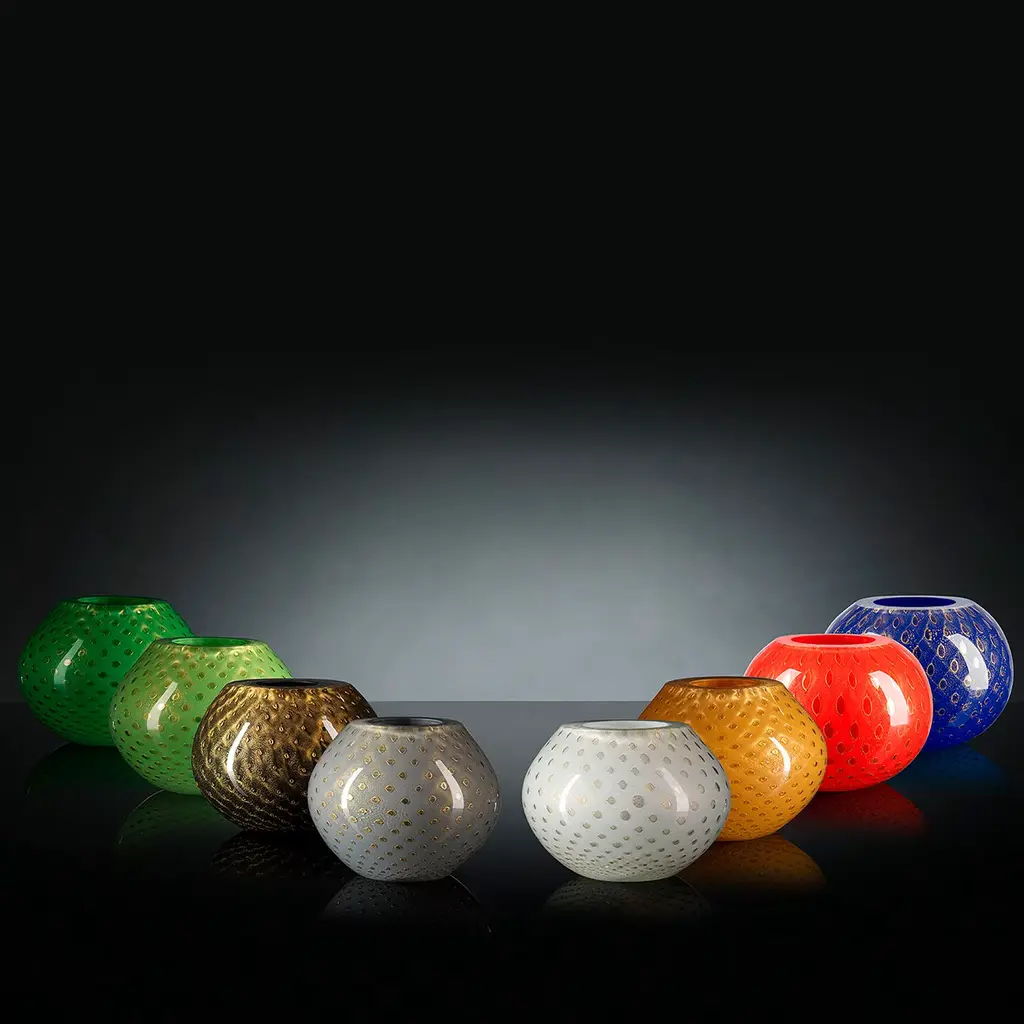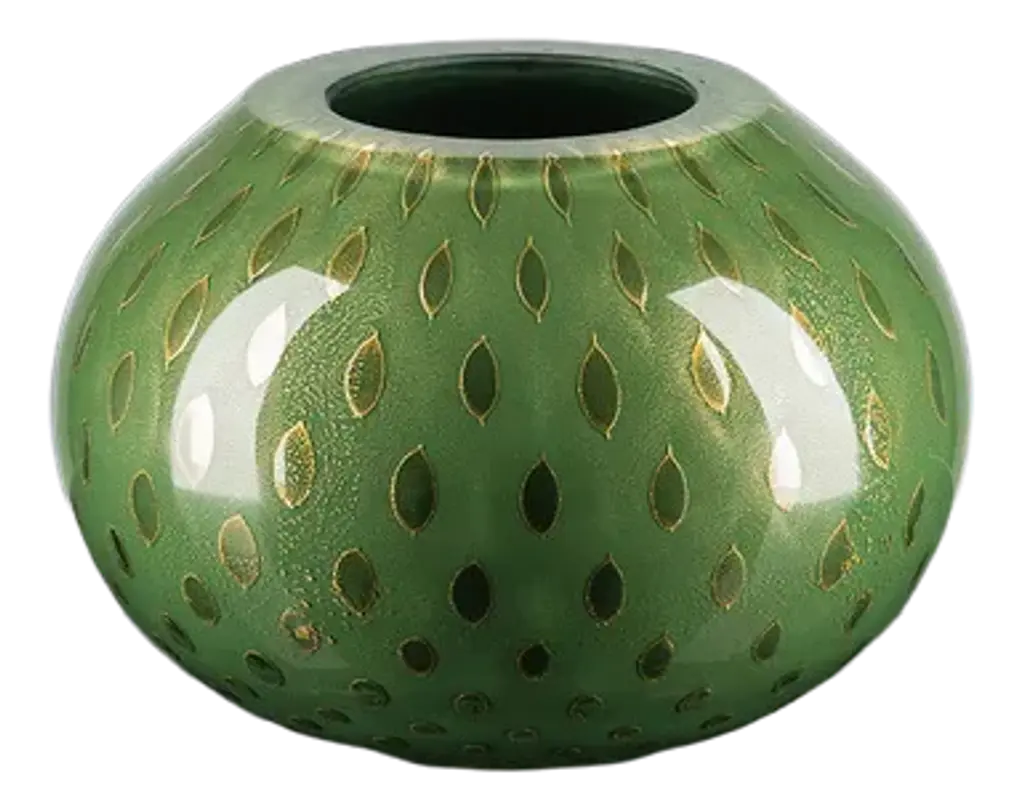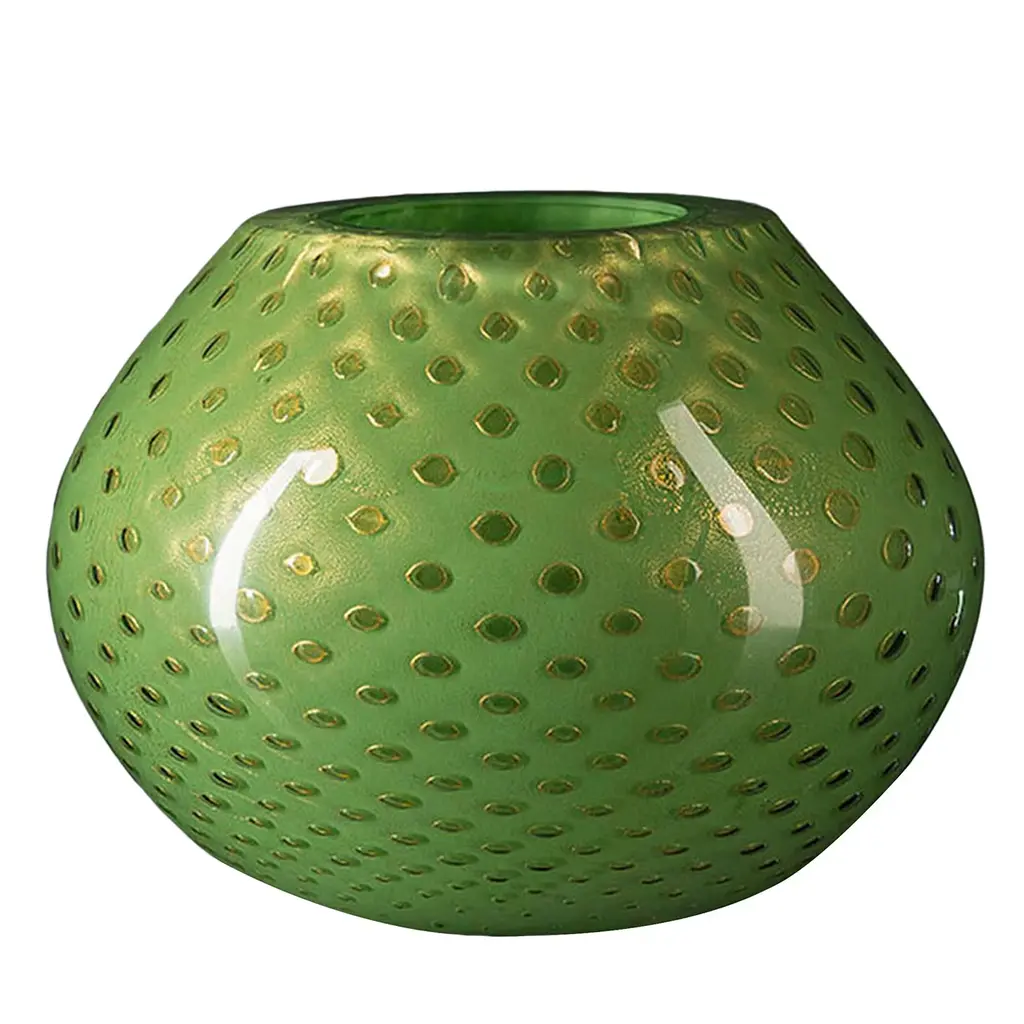 As a standalone accent or part of an elegant display, this vase will add a chic finishing touch to any home. The smooth, curved profile is expertly mouth-blown of white Murano glass, interspersed with small gold-rimmed droplets. Perfect for showcasing your favorite blooms, this vase will make for a well-received wedding gift.