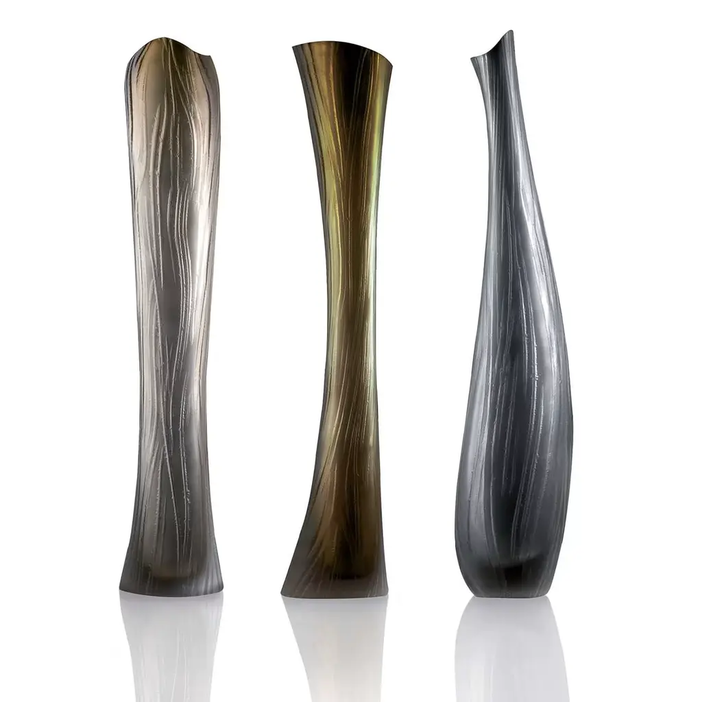 This dainty vase is a testament to Murano glassmaking tradition. Characterized by a steel-gray hue, the sinuous silhouette is enhanced by the captivating engraved pattern, which is the defining feature of the Sfumati collection, incorporated into the glass that creates a wavy movement along its bottle-shaped body with narrow mouth and slightly bent neck. Showcased on a dining room table, side table, or study desk, this vase will add elegance to any decor.