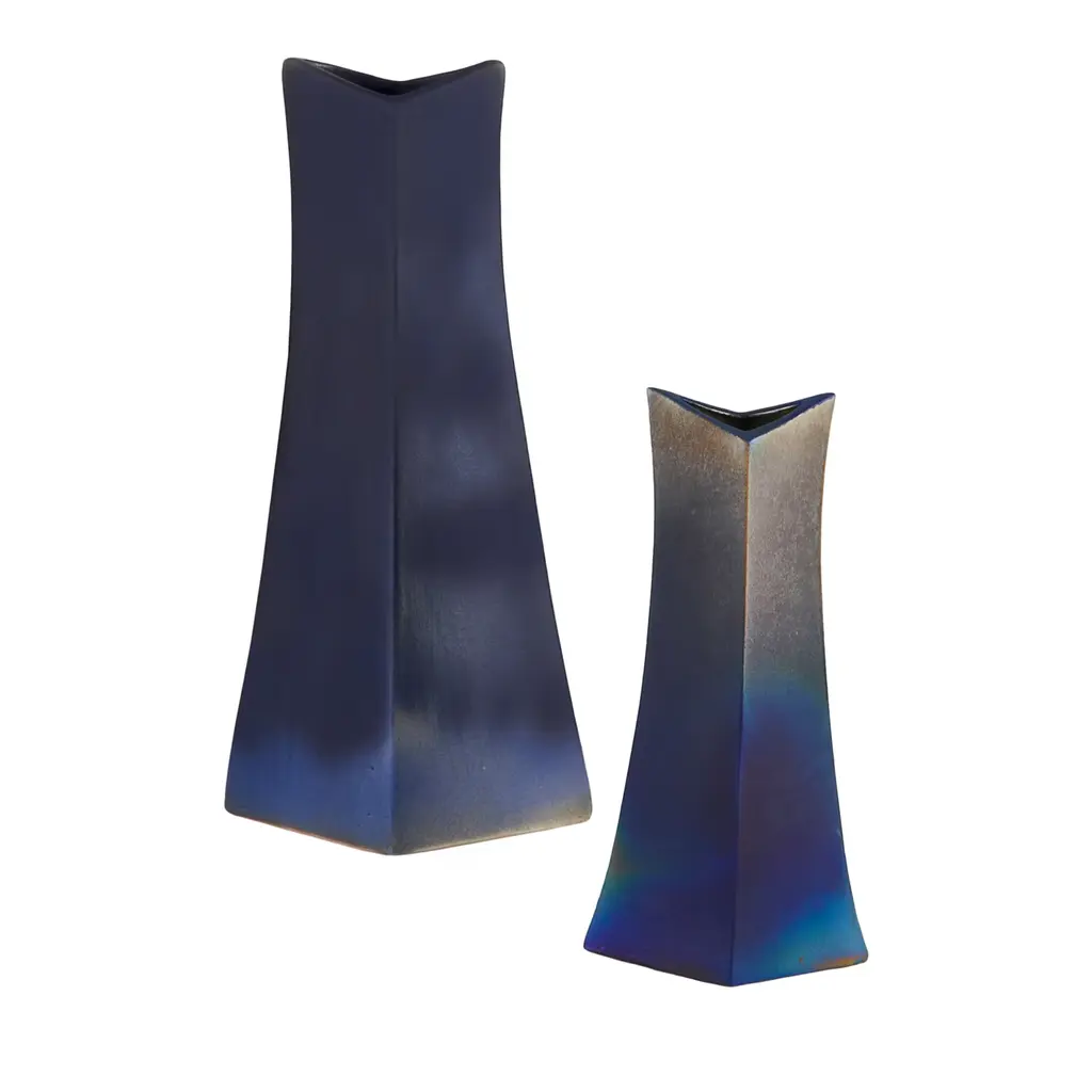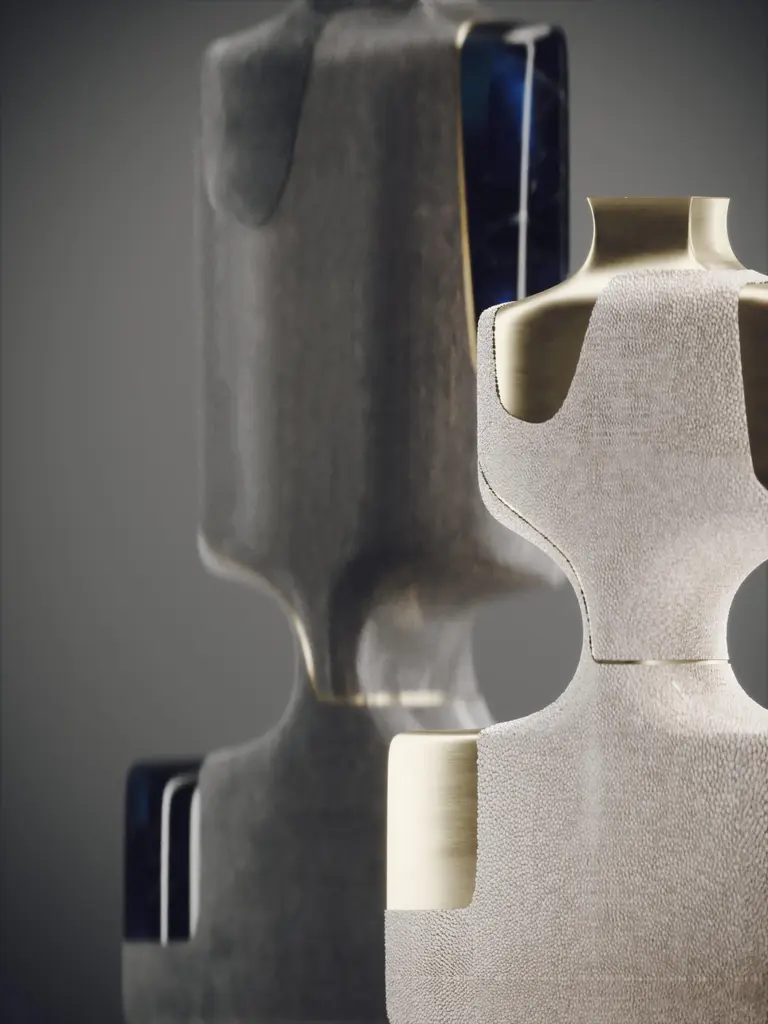 The Paris based label has distinguished themselves since their launch, with their iconic use of shagreen mixed with brass and other exotic materials. All furniture is handcrafted by skilled artisans, ultimately making each piece unique, designed in Paris and produced in the Philippines.The set of 2 Artemis small and medium sculptural vases are graphic pieces that adds a statement to any space. The bold pattern is inlaid in a mixture of cream & white shagreen, mother of pearl and bronze-patina brass and coal black & grey shagreen, black & blue pen shell and bronze-patina brass respectively. The sculptural vases are lined with a fibre glass interior to support water. Available in other sizes, see images at end of slide. This listing is for a set of 2 of the medium size with the dark colour variant pattern and the small size with the light colour variant pattern.The dimensions of this set are small size is 30 x 12 x 40 cm and The medium size is 26 x 12 x 52 cmThe Large 32.8 x 13 x 58.1 cm All R & Y Augousti pieces are handmade by artisans, ultimately making each piece unique.Wipe clean with soft dry cloth.Acclaimed design duo Ria & Yiouri Augousti have established themselves since the 1990s as pioneers of modern-vintage style through their luxurious Art Deco inspired collections.The Paris based label has distinguished themselves since their launch, with their iconic use of shagreen mixed with brass and other exotic materials. All furniture is handcrafted by skilled artisans, ultimately making each piece unique. All shagreen-covered items should be kept out of direct sunlight, color variants may occur on the stingray and other exotic finishes, but this showcases the Parisian label's commitment to creating authentic luxurious products using natural components.
